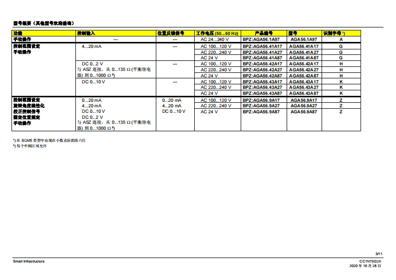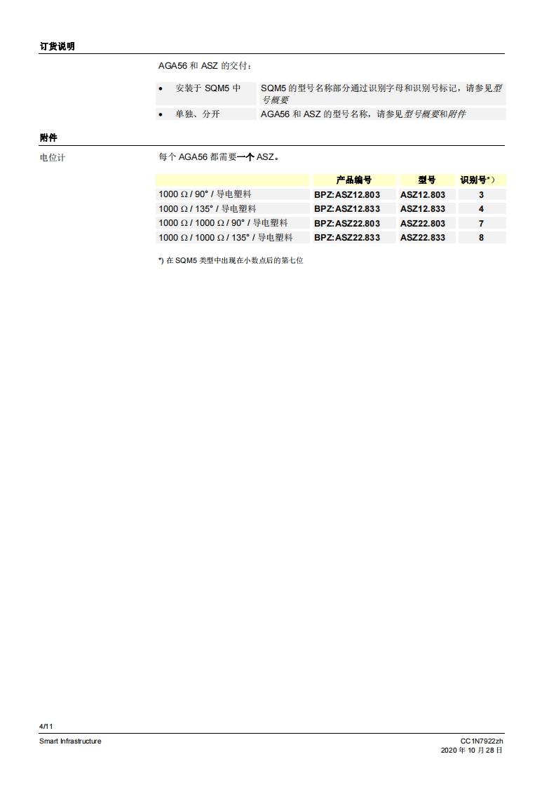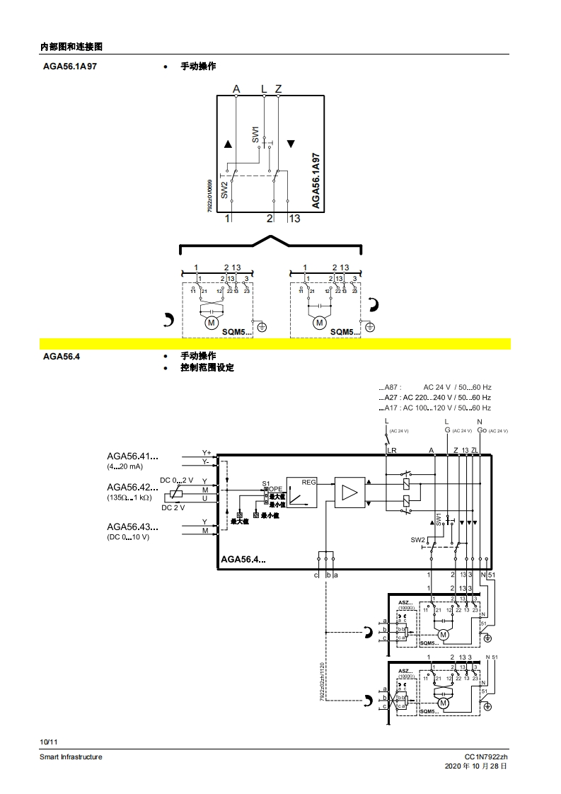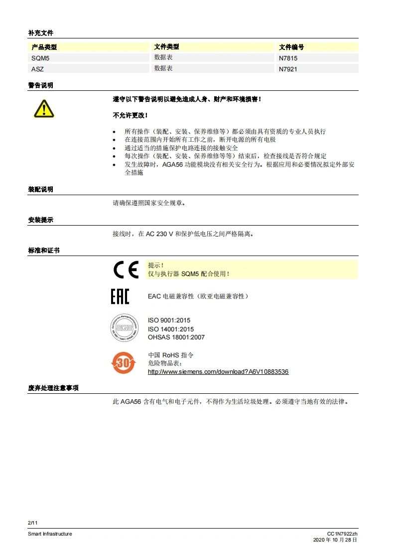 SIEMENS792电子功能模块AGA56...电子功能模块,用于通过连续的模拟控制信号控制执行器SQM5,例如4.20A和连续的模拟位置反债信号。补充教据表请参见SQM5数据表N7815和ASZ数据表N7921。AGA56以及本数据表专供那些产品中内置或连接了AGA56的原始设备制造商(OEM)使用1应用AGA56是执行器SQM5的扩展模块。它们可以现场安装在执行器SQM5中,出厂时也可以作为执行器SQM5的部件提供。CC1N7922zhSmart Infrastructure2020年10月28日