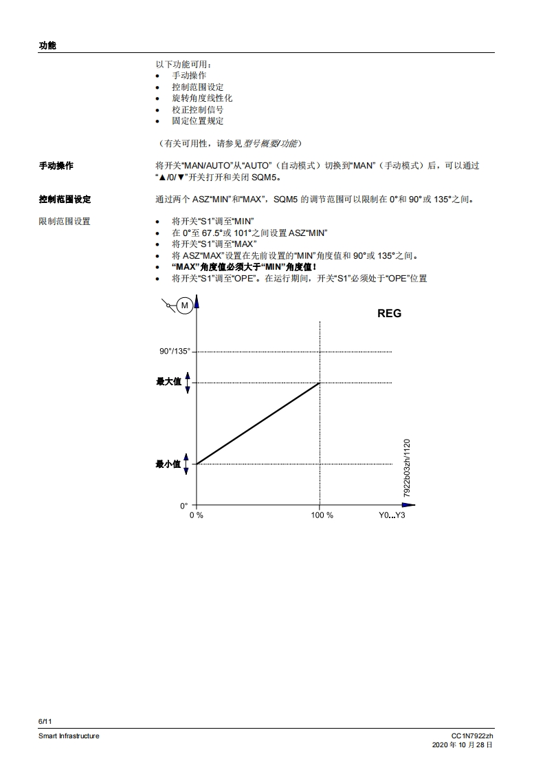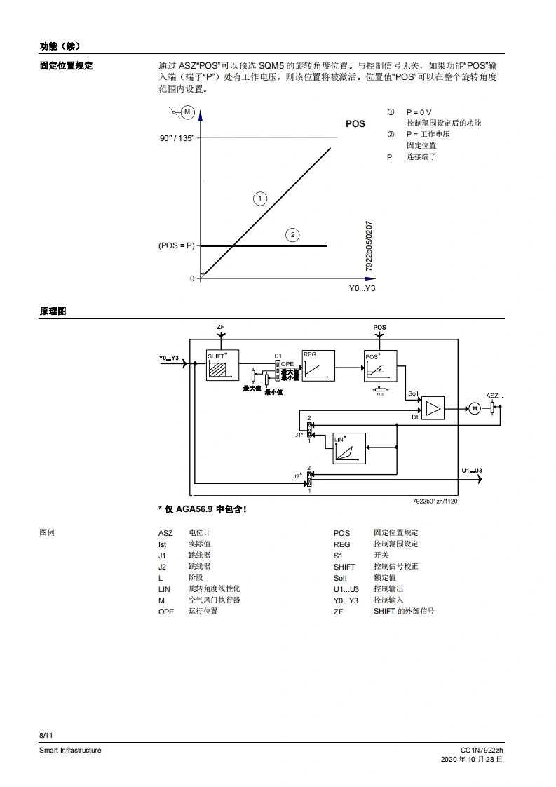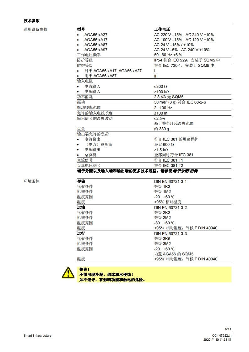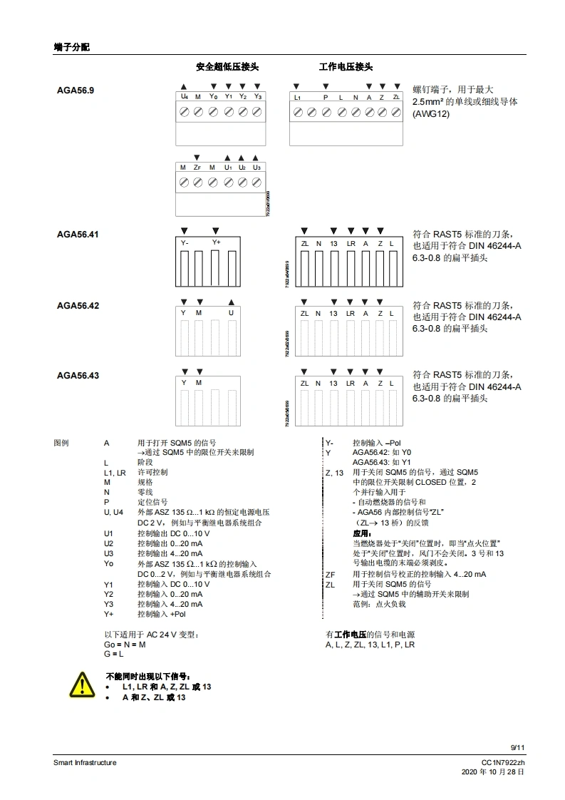 SIEMENS792电子功能模块AGA56...电子功能模块,用于通过连续的模拟控制信号控制执行器SQM5,例如4.20A和连续的模拟位置反债信号。补充教据表请参见SQM5数据表N7815和ASZ数据表N7921。AGA56以及本数据表专供那些产品中内置或连接了AGA56的原始设备制造商(OEM)使用1应用AGA56是执行器SQM5的扩展模块。它们可以现场安装在执行器SQM5中,出厂时也可以作为执行器SQM5的部件提供。CC1N7922zhSmart Infrastructure2020年10月28日