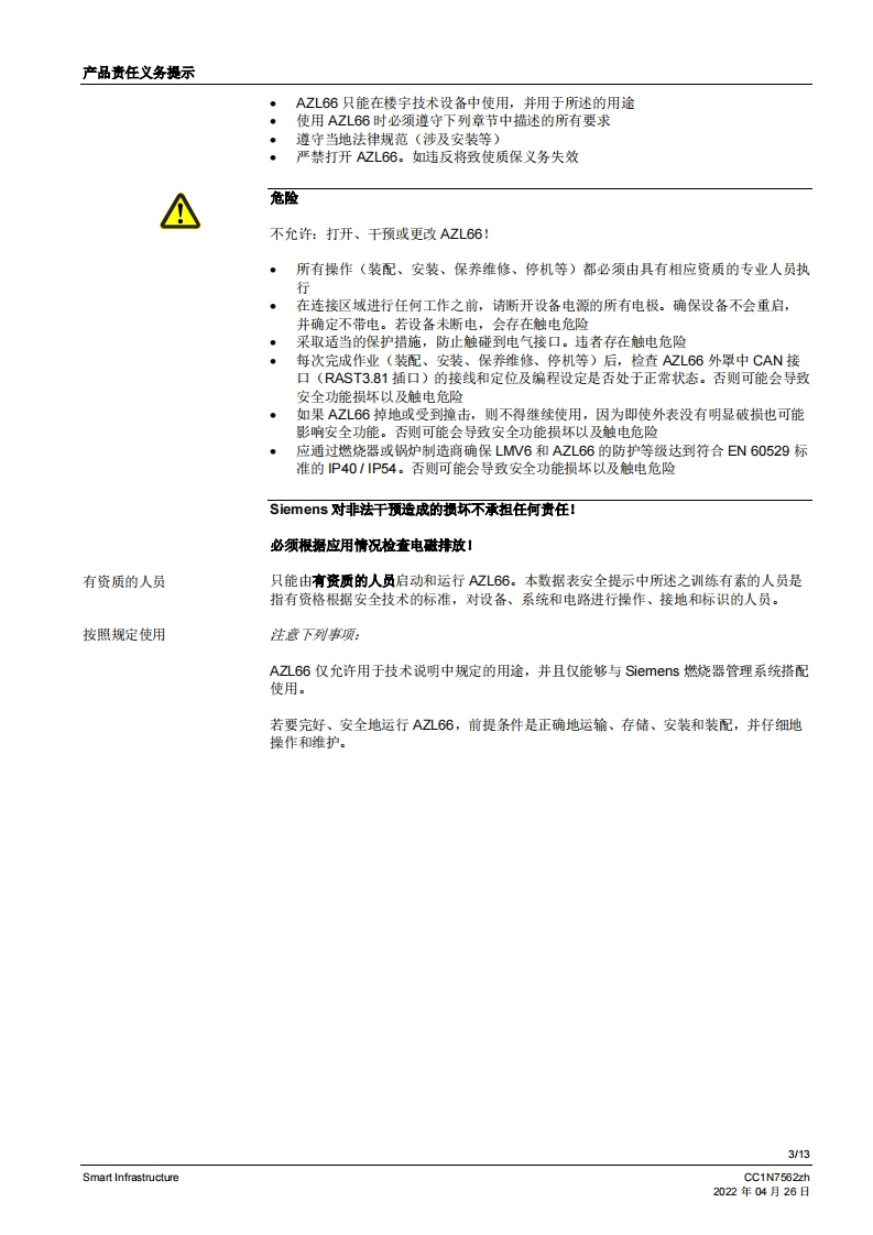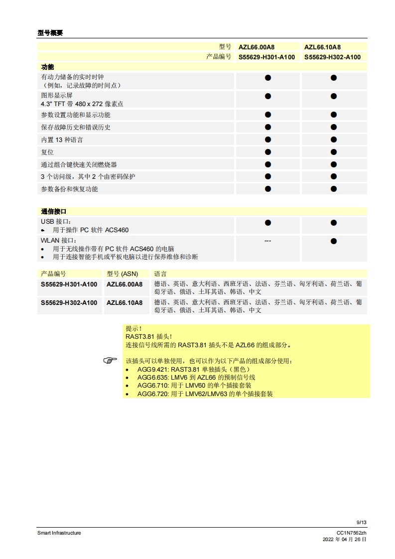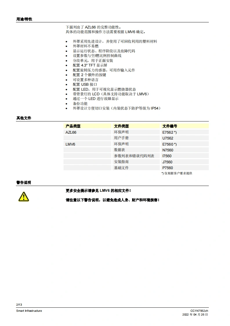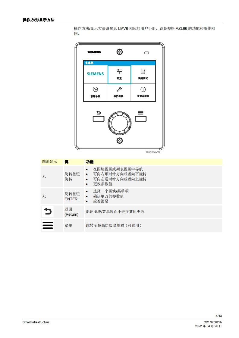 SIEMENS7562显示单元和操作单元AZL66...显示单元和操作单元AZL66与燃烧器管理系统LMV6搭配直接用在燃烧器上或燃烧器近旁的控制柜中。。AZL66用于显示、操作和编程设定特定的安全相关或者安全不相关燃烧器功能可查询和显示最置要的设备数据与故摩代码·AZL66与LMV6通过CAN接口进行通信AZL66以及本数据表专供那些产品中内置或违接了AZL66的原始设备制造商(OEM)使用!CC1N7562zhSmart Infrastructure2022年04月26日