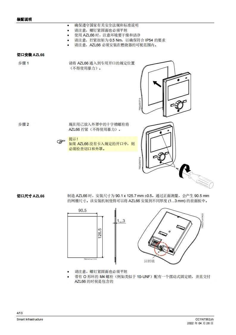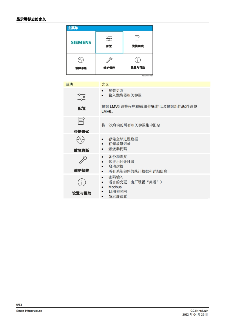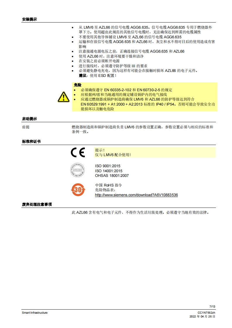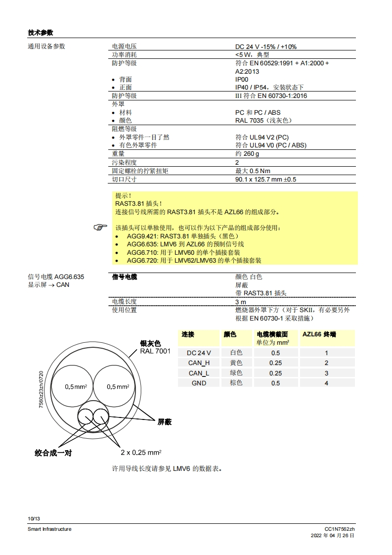 SIEMENS7562显示单元和操作单元AZL66...显示单元和操作单元AZL66与燃烧器管理系统LMV6搭配直接用在燃烧器上或燃烧器近旁的控制柜中。。AZL66用于显示、操作和编程设定特定的安全相关或者安全不相关燃烧器功能可查询和显示最置要的设备数据与故摩代码·AZL66与LMV6通过CAN接口进行通信AZL66以及本数据表专供那些产品中内置或违接了AZL66的原始设备制造商(OEM)使用!CC1N7562zhSmart Infrastructure2022年04月26日