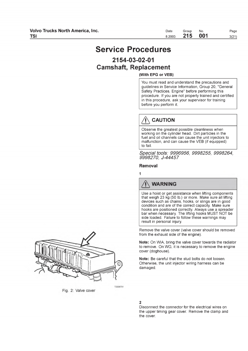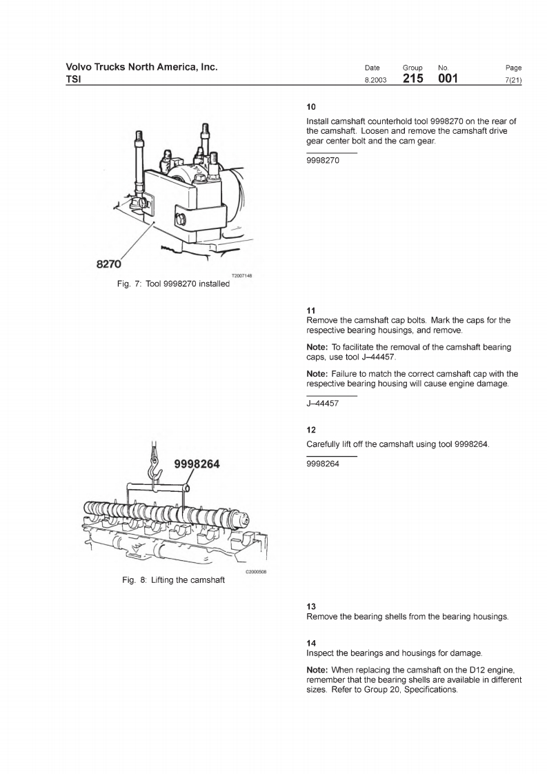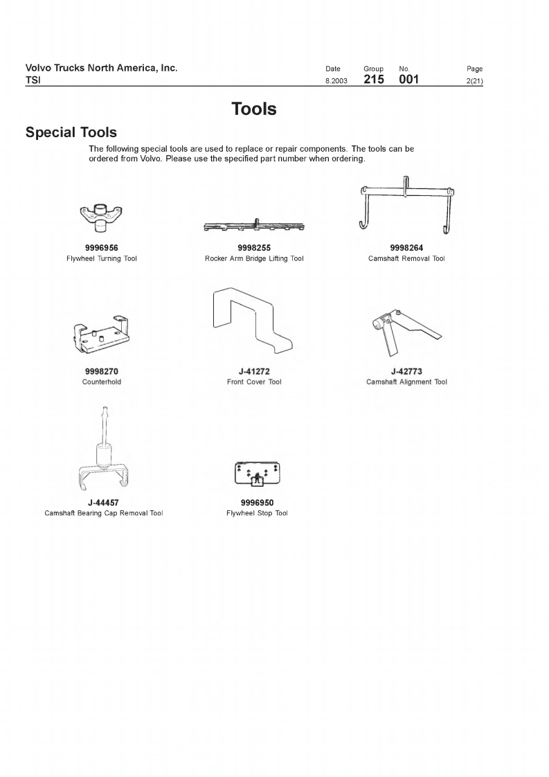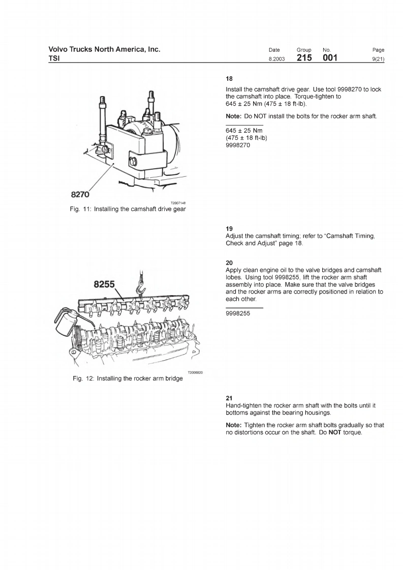 VOIVOVolvo Trucks North America,IncTSIGreensboro.NC USAThis TSI Service Bulletin replaces TSI Service BulletinDateGroupNoSupp.Page215-001."Camshaft.D12,D12A,D12B(11.2001)8.20032150011(21)publication no.PV776-TSP160576.CamshaftD12,D12A,D12BCamshaftFig.1:VOLVO D12B EngineThis information covers procedures for camshaft repair on VOLVO D12,D12A,andD12B enginesContents·“Special Tools"page2."Camshaft Timing,Checking"page 12."Camshaft Timing,Check and Adjust'page 18."Camshaft.Replacement"page 3PV776-TSP193344USA13899