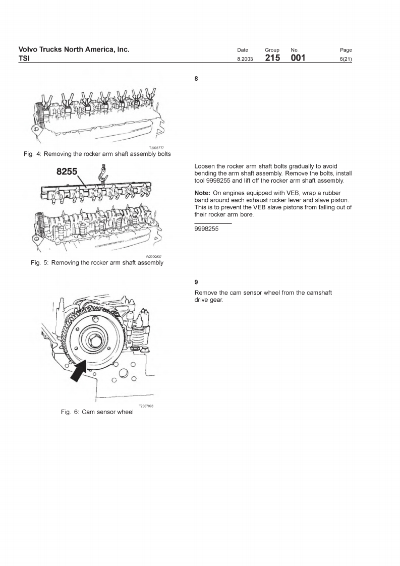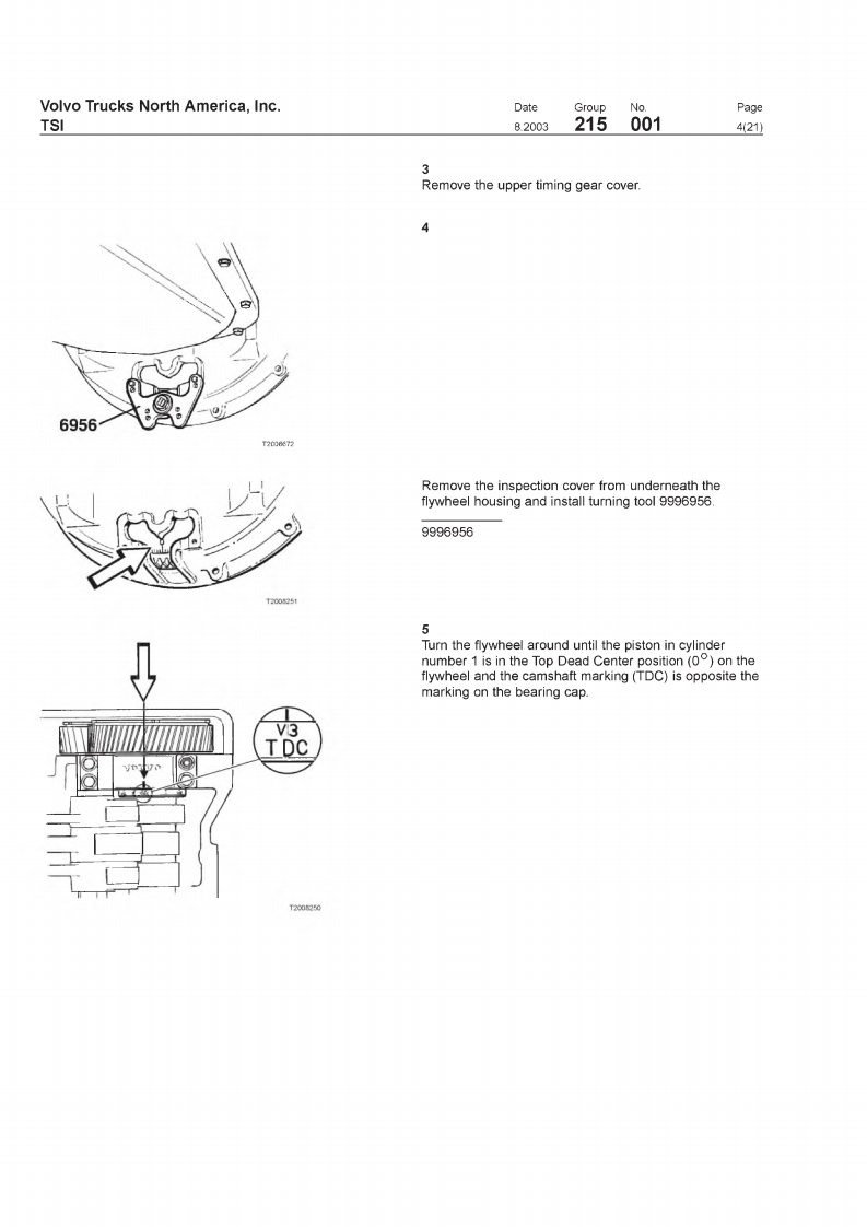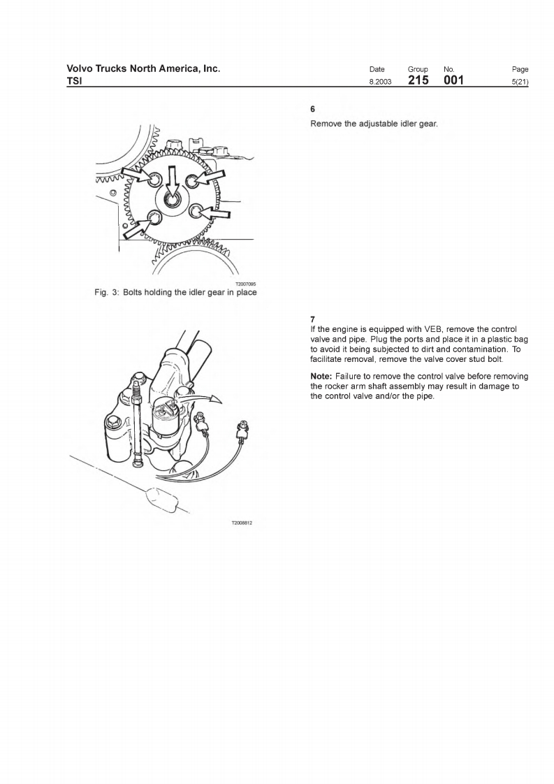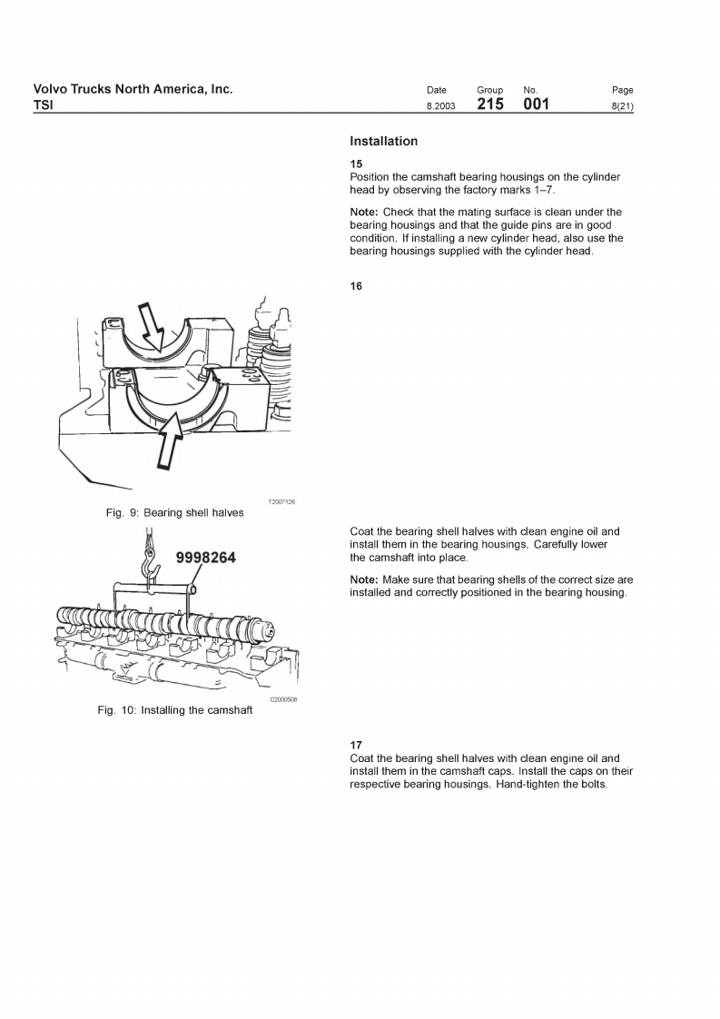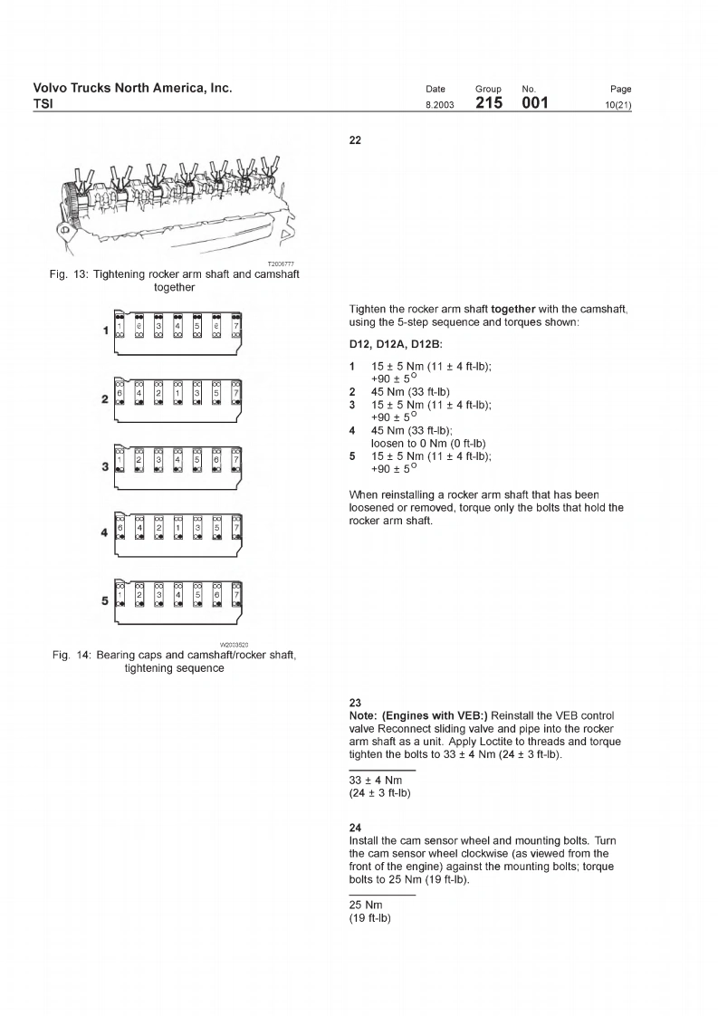 VOIVOVolvo Trucks North America,IncTSIGreensboro.NC USAThis TSI Service Bulletin replaces TSI Service BulletinDateGroupNoSupp.Page215-001."Camshaft.D12,D12A,D12B(11.2001)8.20032150011(21)publication no.PV776-TSP160576.CamshaftD12,D12A,D12BCamshaftFig.1:VOLVO D12B EngineThis information covers procedures for camshaft repair on VOLVO D12,D12A,andD12B enginesContents·“Special Tools"page2."Camshaft Timing,Checking"page 12."Camshaft Timing,Check and Adjust'page 18."Camshaft.Replacement"page 3PV776-TSP193344USA13899