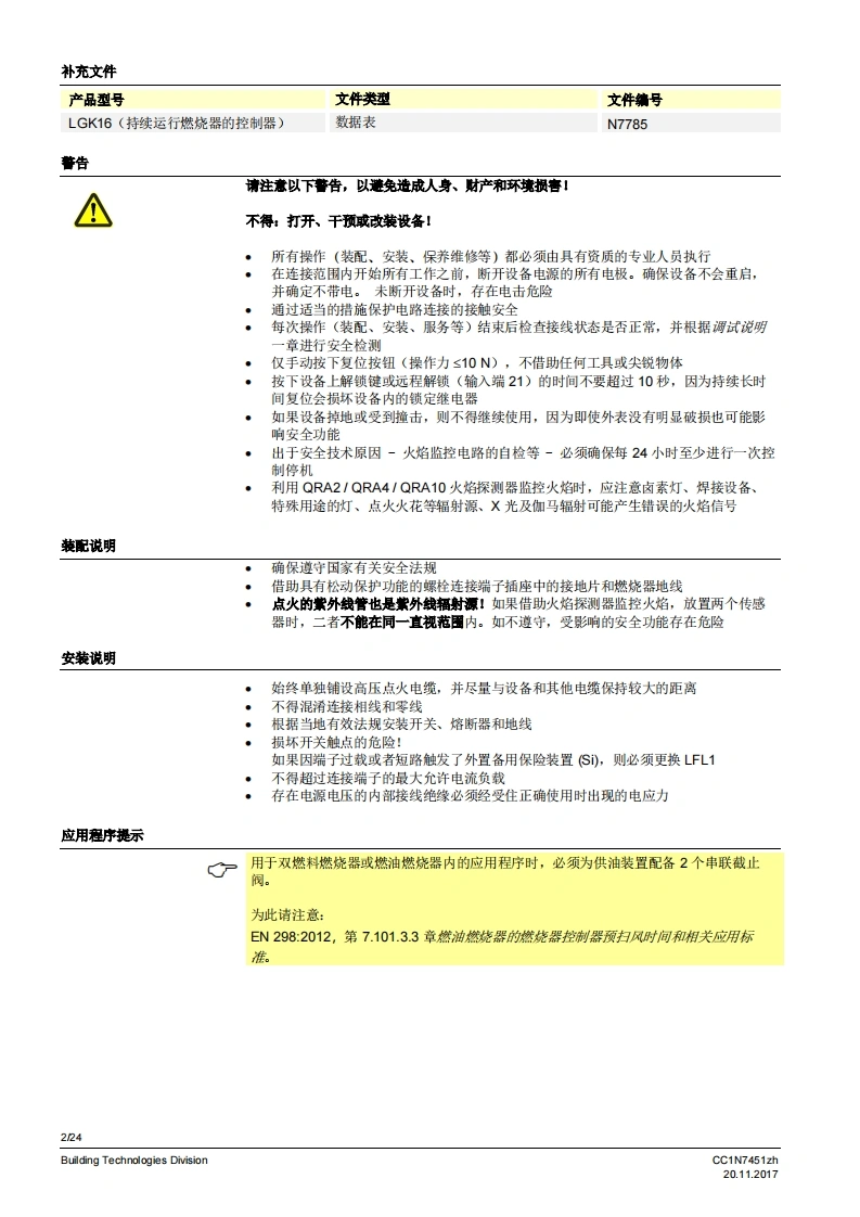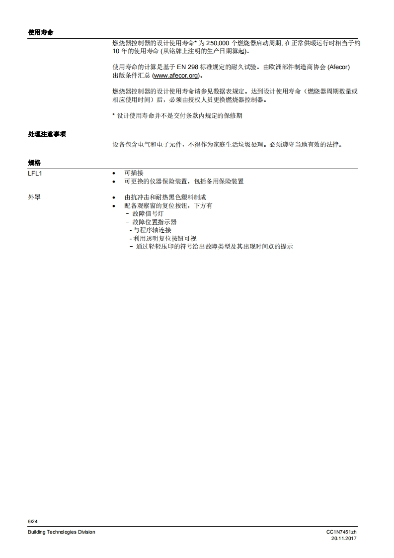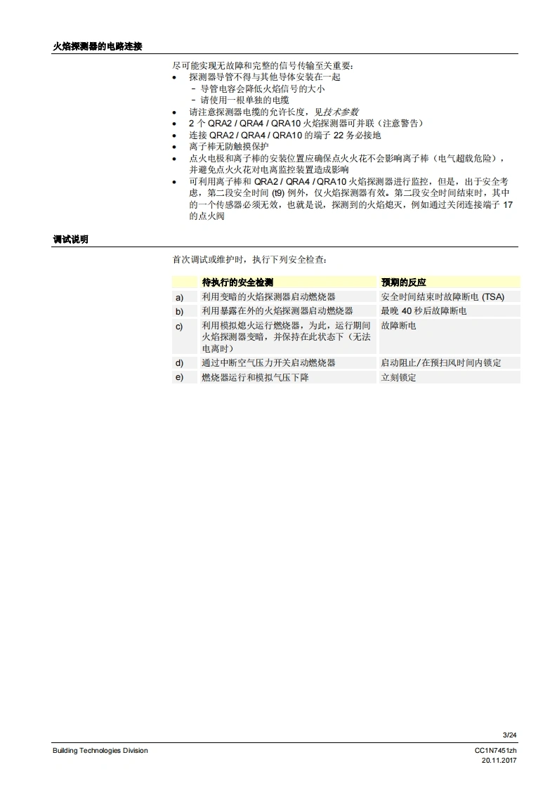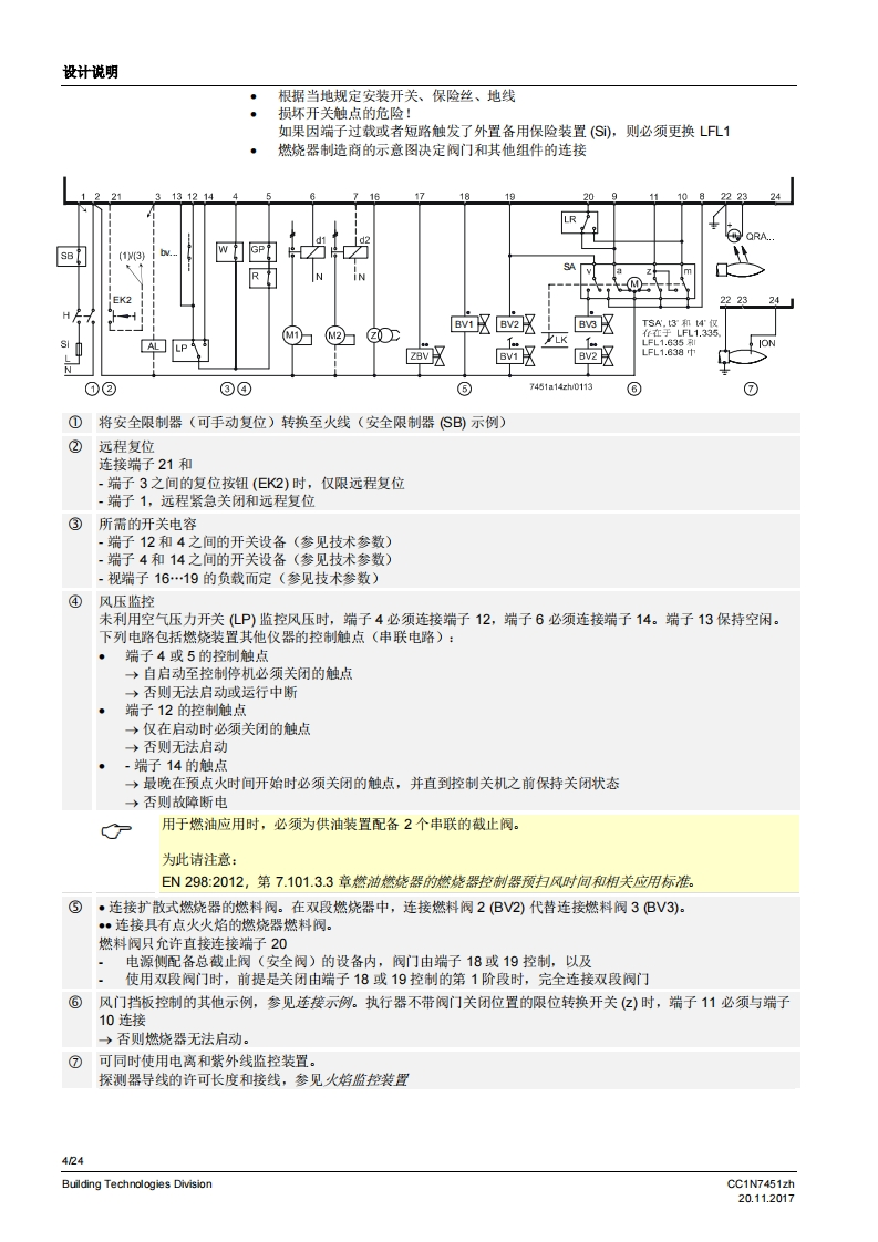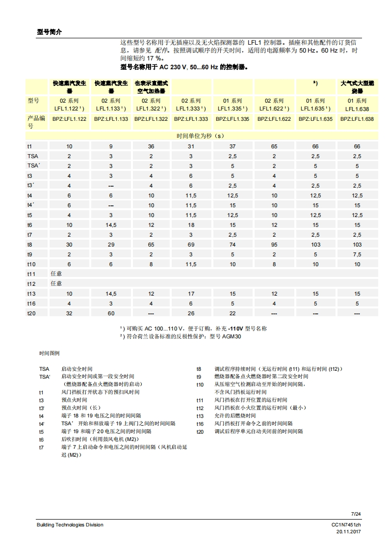SIEMENS7451燃烧器控制器LFL1...燃烧器控制器用于大中型功率的燃气、燃油或双燃料通风式熟烧装置适用于间歇运行的多段式或比调式燃烧器配风门挡板控制。火焰监控-利用QRA2/QRA4IQRA10火馅探测器一和高子捧LFL1以及本资料专供在其设备中集成使用LFL1的原始设备制造商(OEM)使用I应用扩散式燃烧器或具有点火火焰的鼓风燃烧器控制和监测适用于大中型功率适用于间歇运行(每24小时至少控制停机1次)可通用于分段式或比调式燃烧器适用于直燃式空气加热器WLE·适用于双燃料燃烧器·根据DIN EN298检测并批准结构模型借助火焰探测器QRA2/QRA4/QRA10或离子棒确保火焰监控。系列01和02在点火燃烧器安全时间上不同于配备点火燃风门挡板的燃烧器。可提供LFL1.638型大功率的大气式燃烧器。CC1N7451zhBuilding Technologies Division20.112017