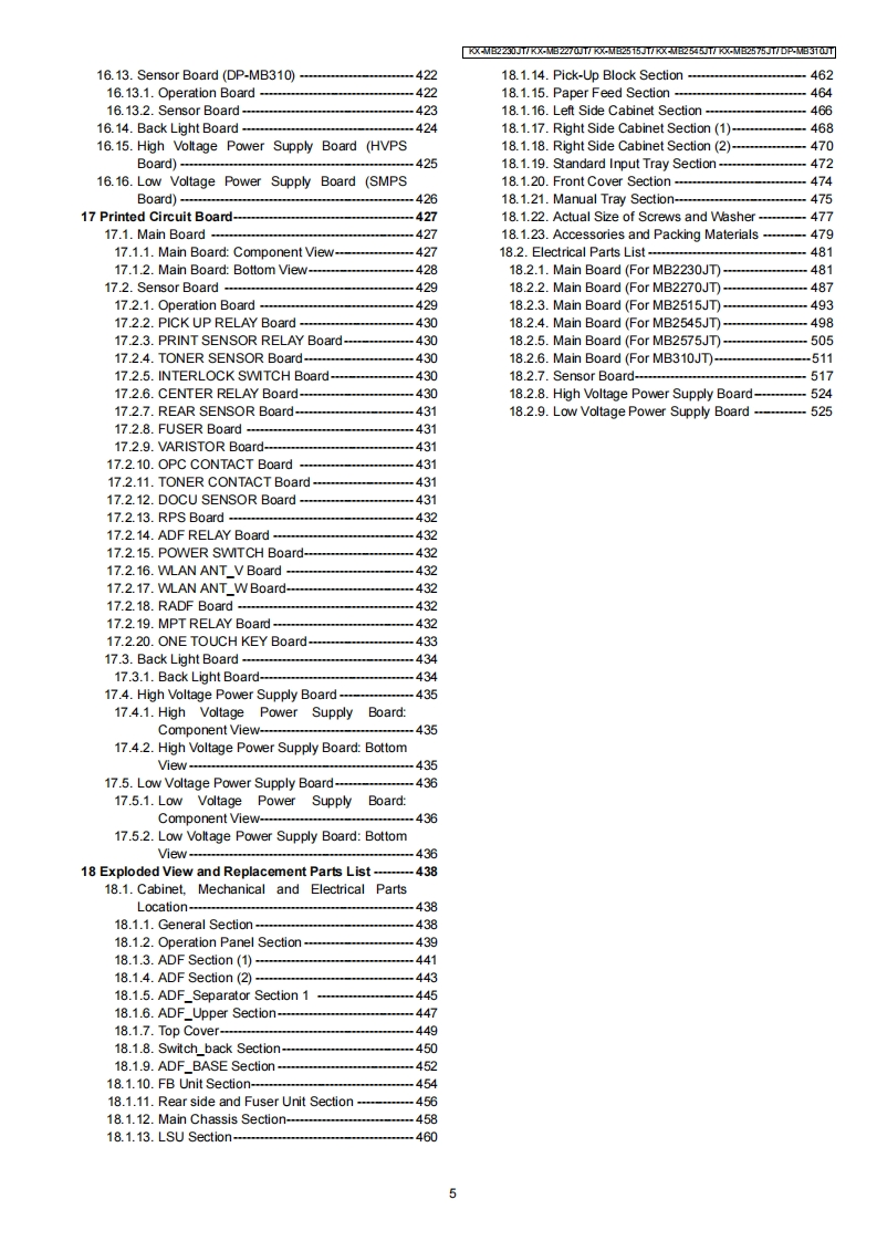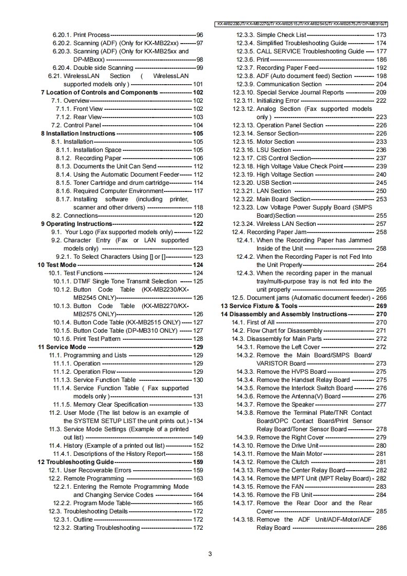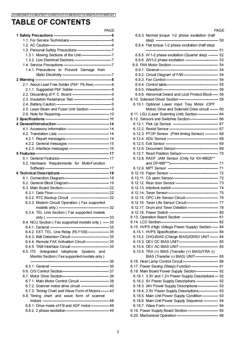 ORDER NO.KMF1308426CEService ManuaMulti-Function printerModel No.KX-MB2230JTKX-MB2270JTKX-MB2515JTKX-MB2545JTKX-MB2575JTDP-MB310JT(for Italy)WARNINGThis service information is designed for experienced repair technicians only and is not designed for use by the generalpublic.It does not contain warnings or cautions to advise non-technical individuals of potential dangers in attemptingto service a product.Products powered by electricity should be serviced or repaired only by experienced professionaltechnicians.Any attempt to service or repair the product or products dealt with in this service information by anyoneelse could result in serious injury or death.IMPORTANT SAFETY NOTICEThere are special components used in this equipment which are important for safety.These parts are marked by/in the Schematic Diagrams,Circuit Board Diagrams,Exploded Views and Replacements Parts List.It is essential thatthese critical parts should be replaced with manufacturer's specified parts to prevent shock,fire or other hazards.Do not modify the original design without permission of manufacturer.IMPORTANT INFORMATION ABOUT LEAD FREE,(PbF),SOLDERINGIf lead free solder was used in the manufacture of this product,the printed circuit boards will be marked PbF.Standard leaded,(Pb),solder can be used as usual on boards without the PbF mark.When this mark does appear please read and follow the special instructions described in this manual on theuse of PbF and how it might be permissible to use Pb solder during service and repair work.When you note the serial number,write down all 11 digits.The serial number may be found on the side of the unit.Panasonic System Networks Co.,Ltd.2013PanasonicUnauthorized copying and distribution is a violationof law.