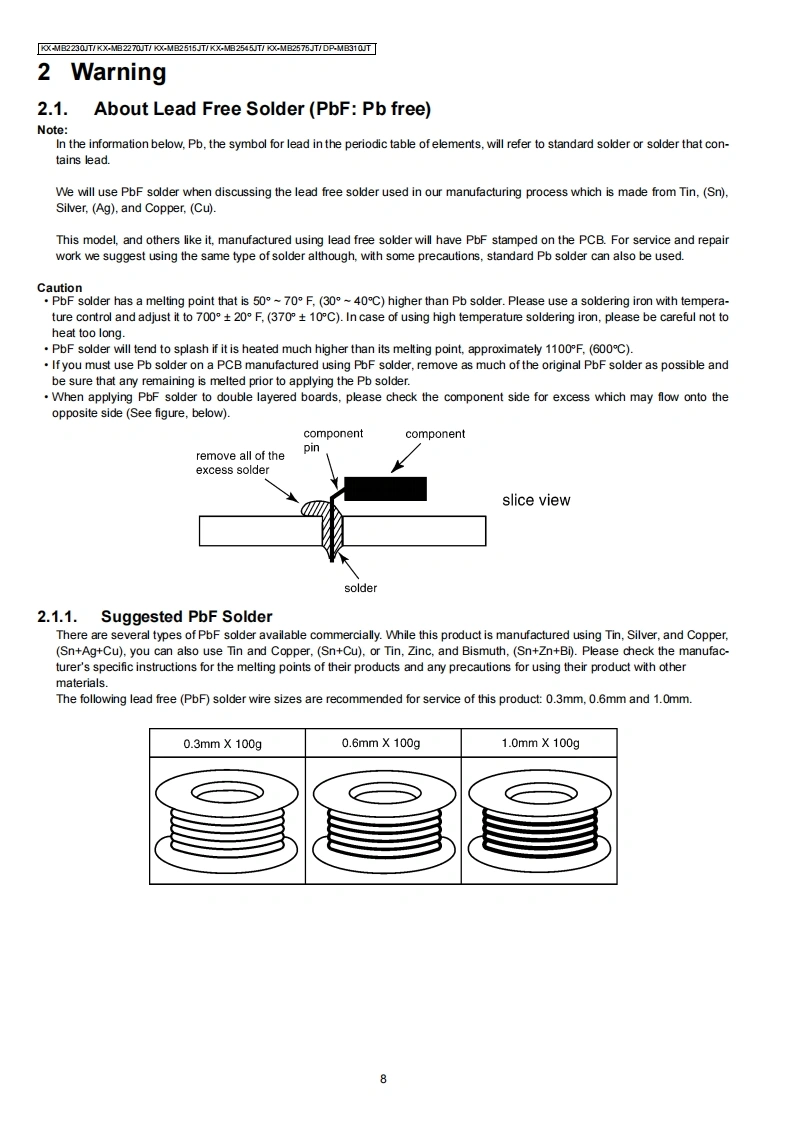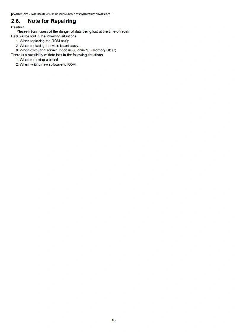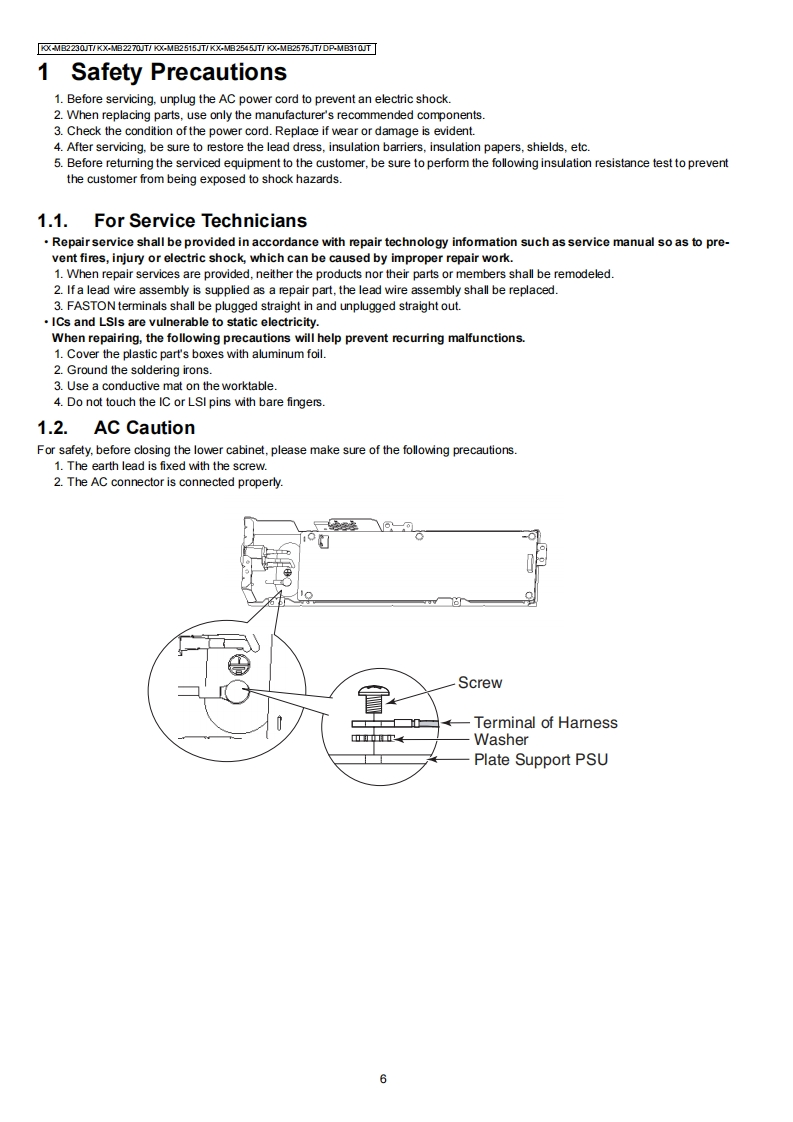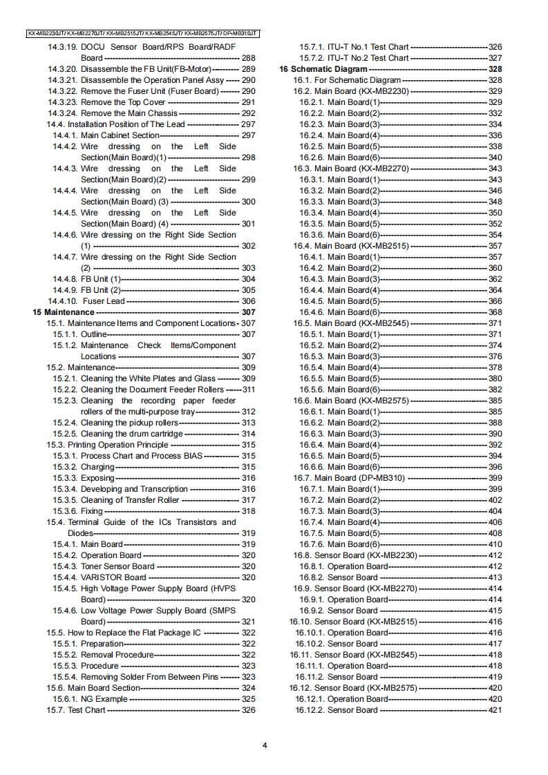 ORDER NO.KMF1308426CEService ManuaMulti-Function printerModel No.KX-MB2230JTKX-MB2270JTKX-MB2515JTKX-MB2545JTKX-MB2575JTDP-MB310JT(for Italy)WARNINGThis service information is designed for experienced repair technicians only and is not designed for use by the generalpublic.It does not contain warnings or cautions to advise non-technical individuals of potential dangers in attemptingto service a product.Products powered by electricity should be serviced or repaired only by experienced professionaltechnicians.Any attempt to service or repair the product or products dealt with in this service information by anyoneelse could result in serious injury or death.IMPORTANT SAFETY NOTICEThere are special components used in this equipment which are important for safety.These parts are marked by/in the Schematic Diagrams,Circuit Board Diagrams,Exploded Views and Replacements Parts List.It is essential thatthese critical parts should be replaced with manufacturer's specified parts to prevent shock,fire or other hazards.Do not modify the original design without permission of manufacturer.IMPORTANT INFORMATION ABOUT LEAD FREE,(PbF),SOLDERINGIf lead free solder was used in the manufacture of this product,the printed circuit boards will be marked PbF.Standard leaded,(Pb),solder can be used as usual on boards without the PbF mark.When this mark does appear please read and follow the special instructions described in this manual on theuse of PbF and how it might be permissible to use Pb solder during service and repair work.When you note the serial number,write down all 11 digits.The serial number may be found on the side of the unit.Panasonic System Networks Co.,Ltd.2013PanasonicUnauthorized copying and distribution is a violationof law.