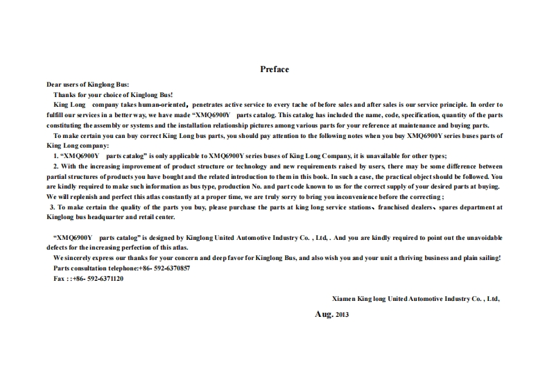 File No.PC-2013-UK-66KING LONGVersion:NO.1XMQ6900Y parts catalog(United kingdom)Vehicle No.D2900351-352Edit MISS Chen Date 2013.8.19Review MR Miao Date 2013.8.20Approve Samis Date 2013.8.20Issue MR MiaoDate2013.820Xiamen King Long United Automotive Industry Co.Ltd.