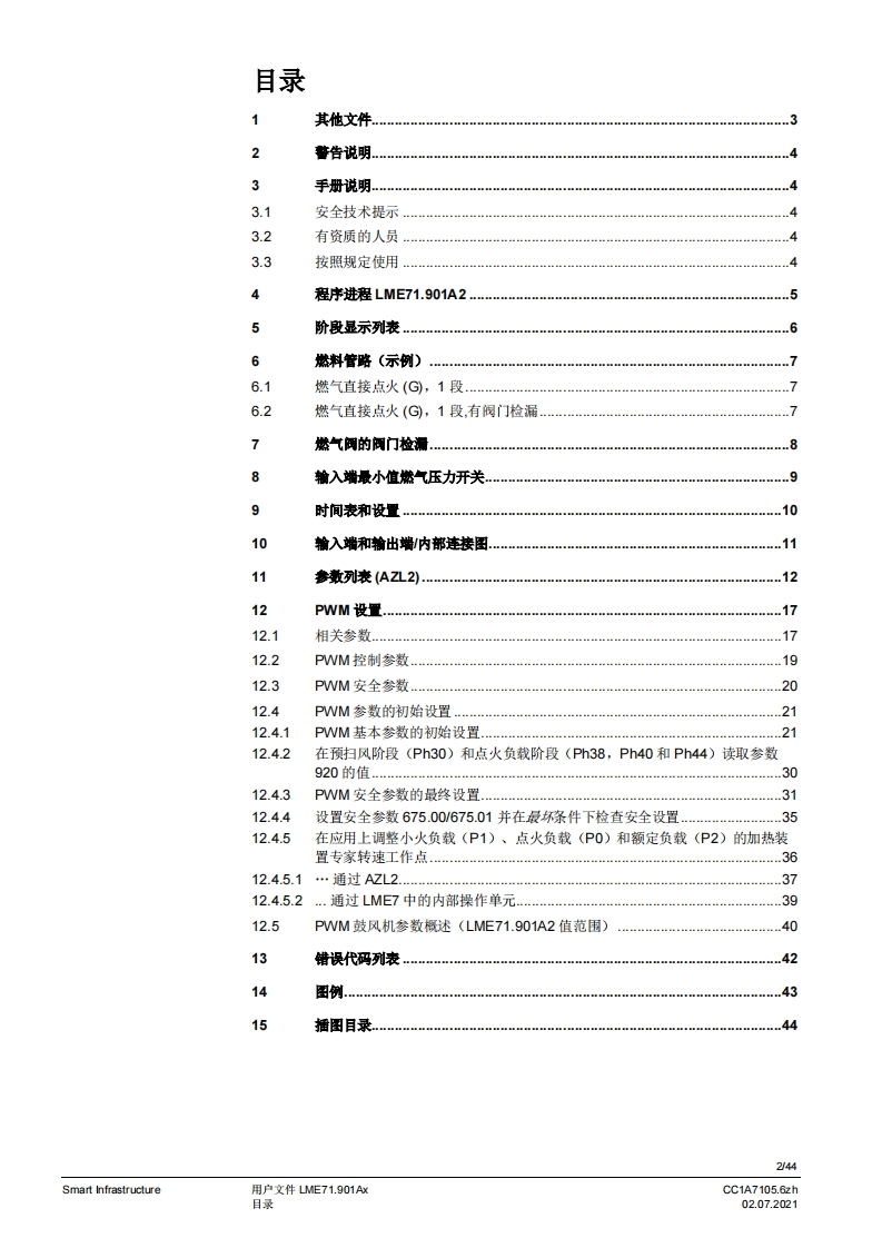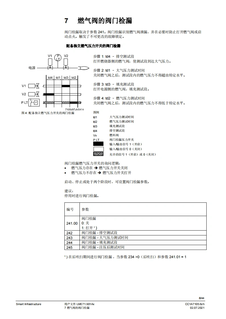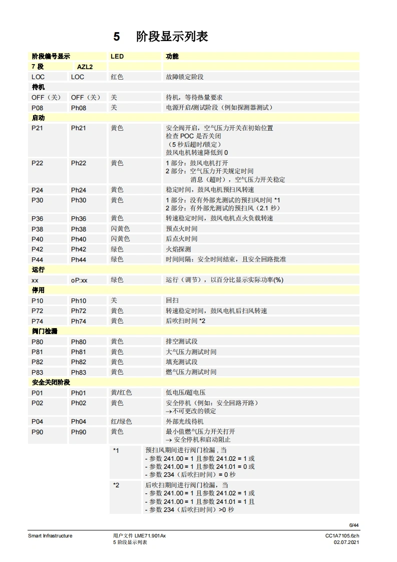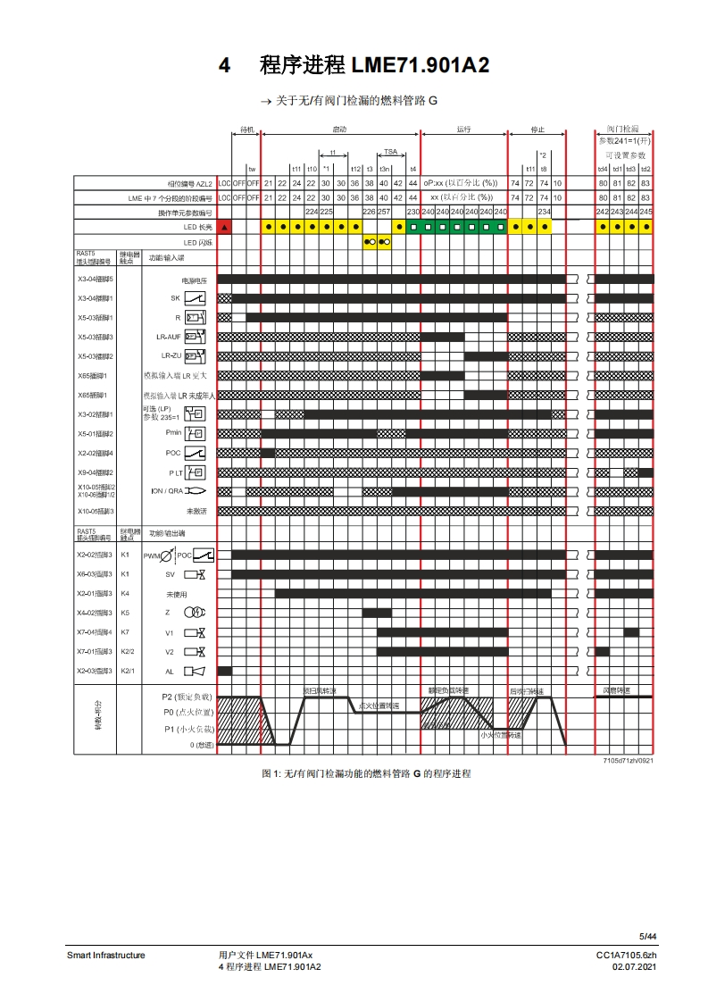 SIEMENSSIEMENSa。图示示例LME7LME71.901A2含程序进程的燃烧器控制器LME71.901A2用户文件应用:比调式直接点火鼓风燃烧器·通过三位浮点调节器或模拟信号工作的集成式PWM鼓风机控制器,用于气动空燃比控制系统的燃烧器集成式阀门检漏(可参数设定)·例如:用于符合EN676标准的燃烧器LME7以及本用户文件专供郑些产品中内置或连接了LME7的原始设备制造商(OEM使用1提示!本文档与LME7基本文件(P7105)结合使用才有效!软件版本V02.03Smart Infrastructure从生产日期210310xxx开始CC1A7105.6zh02.072021