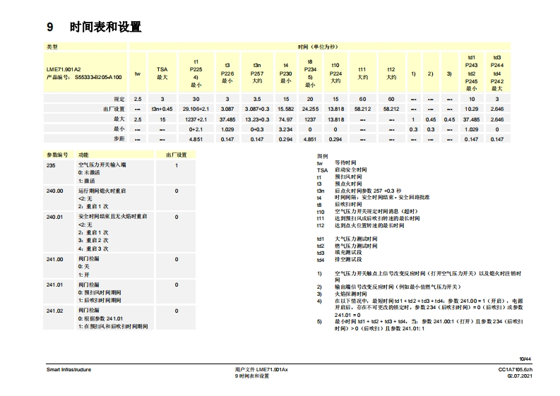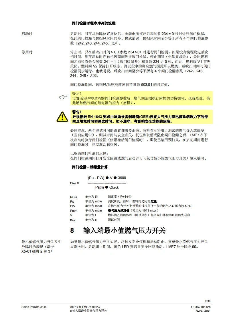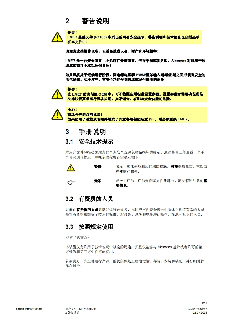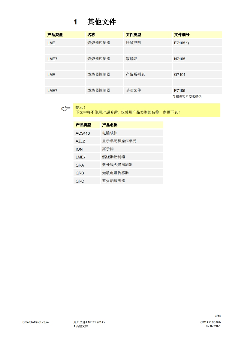 SIEMENSSIEMENSa。图示示例LME7LME71.901A2含程序进程的燃烧器控制器LME71.901A2用户文件应用:比调式直接点火鼓风燃烧器·通过三位浮点调节器或模拟信号工作的集成式PWM鼓风机控制器,用于气动空燃比控制系统的燃烧器集成式阀门检漏(可参数设定)·例如:用于符合EN676标准的燃烧器LME7以及本用户文件专供郑些产品中内置或连接了LME7的原始设备制造商(OEM使用1提示!本文档与LME7基本文件(P7105)结合使用才有效!软件版本V02.03Smart Infrastructure从生产日期210310xxx开始CC1A7105.6zh02.072021