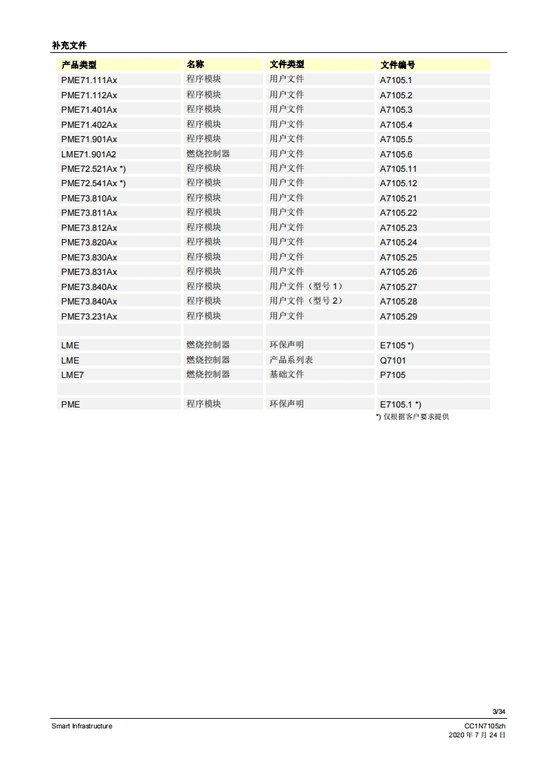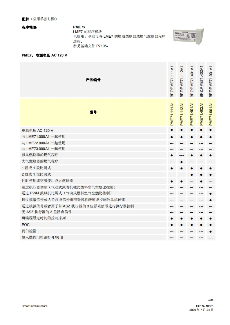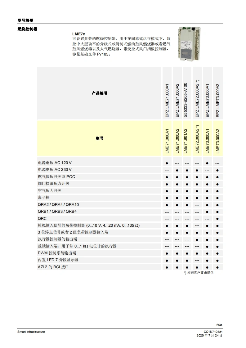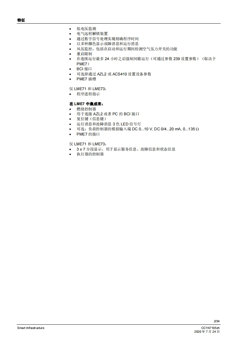 SIEMENS7105CE888燃烧控制器LME71...LME72...LME73...LME7是徽处理器控制的燃烧控制器,并配各相匹配的系统部件,适用于中高功率鼓风燃烧悬的控制和监测。LME7以及本资料专供在其设备中集成使用LME7的原始设备制造商(OEM)使用!应用LME7负责维修和监控分级式或调制式鼓风燃烧器以及间歇式运行的大气环境燃气燃烧器。可通过风门执行器-作用于机械或气动空燃比控制-或者通过脉冲宽度控制式风机和气动空燃比控制来设置空燃比。通过离子棒和紫外线火焰探测器QRA2/QRA4/QRA10、光敏电阻传感器QRB1/QRB3、黄色火焰传感器QRB4或蓝火焰探测器QRC进行火焰监控。符合EN267标准的应用:用于液态燃料的鼓风燃烧器符合EN676标准的应用:带鼓风机的气态燃料自动燃烧器符合EN746-2标准的应用:工业热工艺设备·针对火焰和燃料管理系统的安全要求第2部分根据DIN EN298进行型式检测并获得认证提示注煮!LME7基础文件(P7105)中说明的所有安全提示、警告说明和技术提示均适用于本文件!如不遵守,有安全功能失效和触电危险!V02.03及以上软件版本Smart InfrastructureCC1N7105zh2020年7月24日