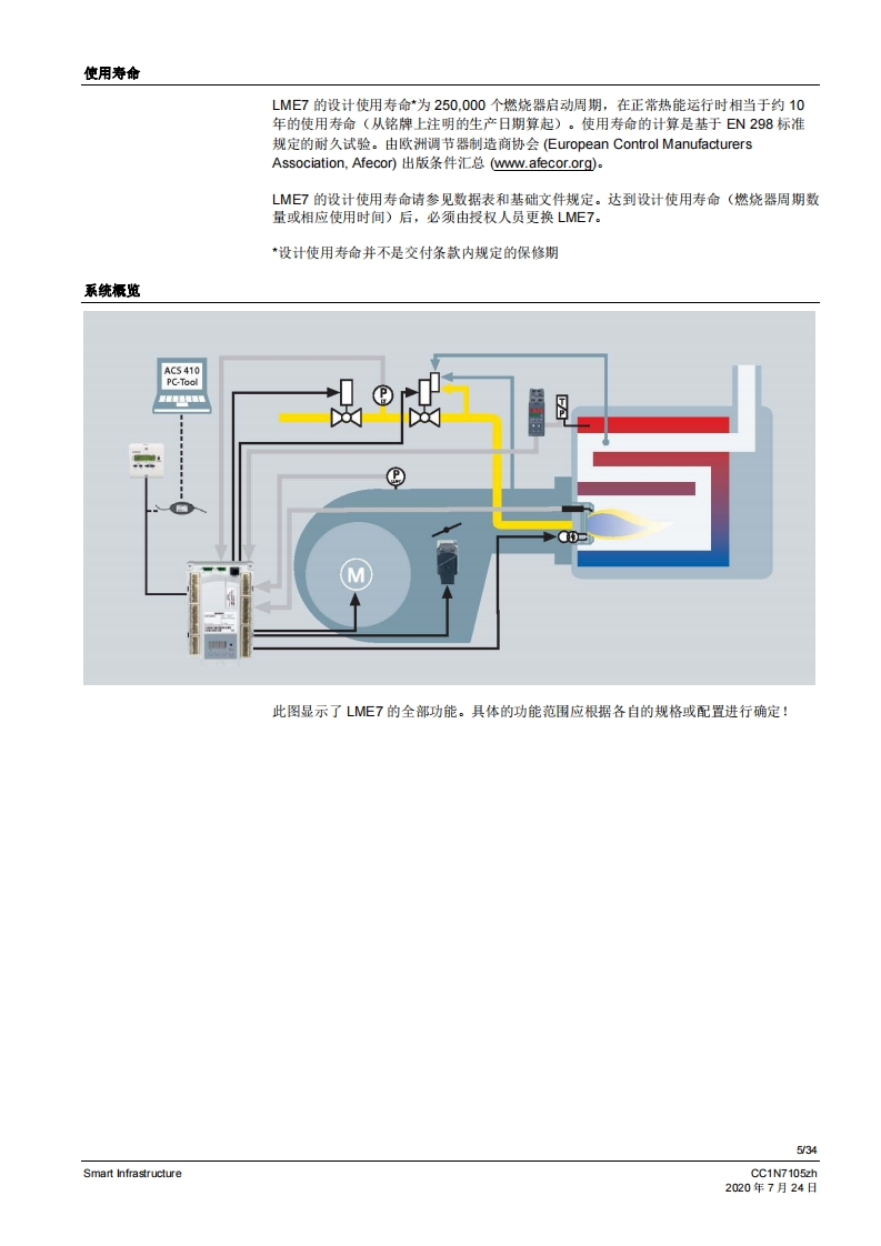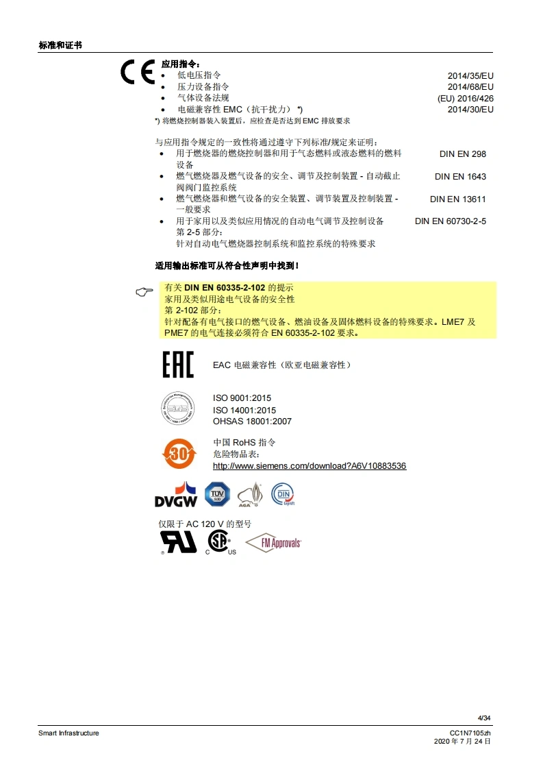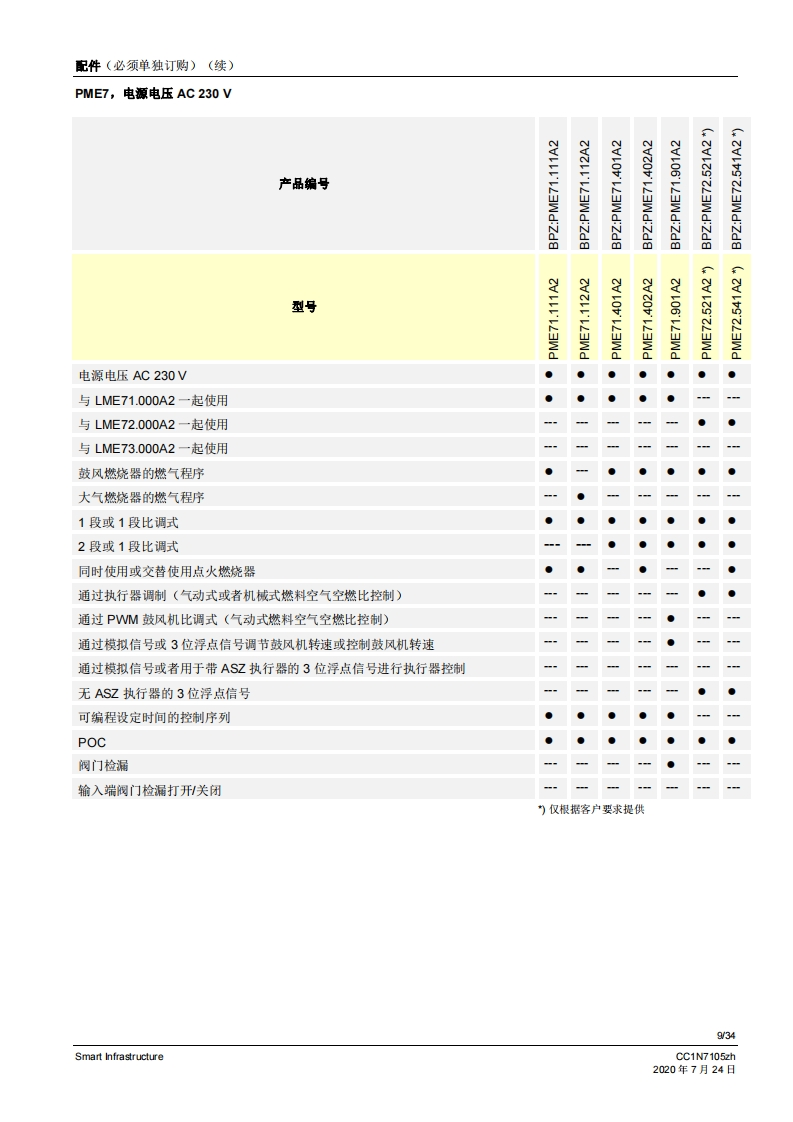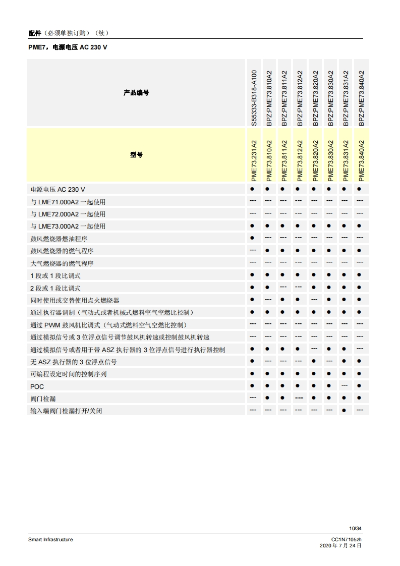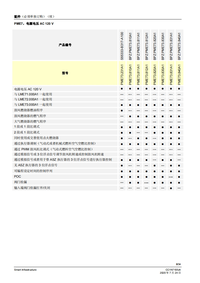 SIEMENS7105CE888燃烧控制器LME71...LME72...LME73...LME7是徽处理器控制的燃烧控制器,并配各相匹配的系统部件,适用于中高功率鼓风燃烧悬的控制和监测。LME7以及本资料专供在其设备中集成使用LME7的原始设备制造商(OEM)使用!应用LME7负责维修和监控分级式或调制式鼓风燃烧器以及间歇式运行的大气环境燃气燃烧器。可通过风门执行器-作用于机械或气动空燃比控制-或者通过脉冲宽度控制式风机和气动空燃比控制来设置空燃比。通过离子棒和紫外线火焰探测器QRA2/QRA4/QRA10、光敏电阻传感器QRB1/QRB3、黄色火焰传感器QRB4或蓝火焰探测器QRC进行火焰监控。符合EN267标准的应用:用于液态燃料的鼓风燃烧器符合EN676标准的应用:带鼓风机的气态燃料自动燃烧器符合EN746-2标准的应用:工业热工艺设备·针对火焰和燃料管理系统的安全要求第2部分根据DIN EN298进行型式检测并获得认证提示注煮!LME7基础文件(P7105)中说明的所有安全提示、警告说明和技术提示均适用于本文件!如不遵守,有安全功能失效和触电危险!V02.03及以上软件版本Smart InfrastructureCC1N7105zh2020年7月24日