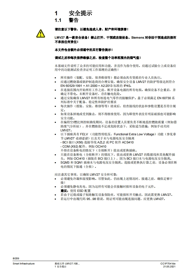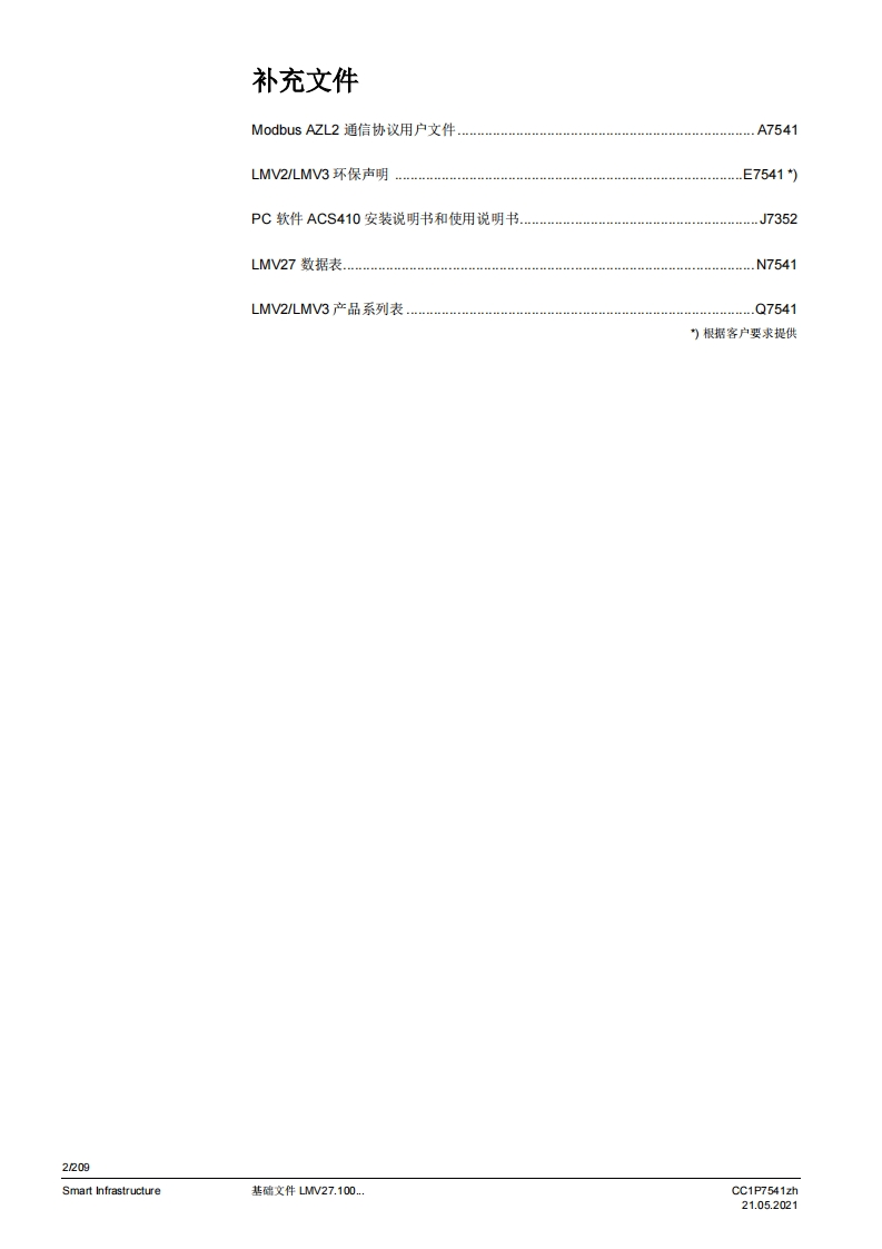 siemens西门子LMV27.100×2基础文件-中文安装操作说明书手册找手册网昨天发布关注私信4.62MB209页049siemens西门子LMV27.100×2基础文件-中文安装操作说明书手册此内容为付费资源,请付费后查看¥19¥21黄金会员免费钻石会员免费登录购买付费资源 第1页 / 共209页 第2页 / 共209页 第3页 / 共209页 第4页 / 共209页 第5页 / 共209页 第6页 / 共209页 第7页 / 共209页 第8页 / 共209页 第9页 / 共209页 第10页 / 共209页 试读已结束,还剩199页,您可下载完整版后进行离线阅读 THE END西门子 文本预览 SIEMENS写EMCN线CELMV27.100x2专用于鼓风燃烧器的内置燃料空气比例控制基础设备基础文件LMN27以及本基础文件专供产品中使用LMV27的原始设备制造商(OEM使用1软件版本V03.80CC1P7541zh21.05.2021Smart Infrastructure 查看更多 收起部分 喜欢就支持一下吧收藏