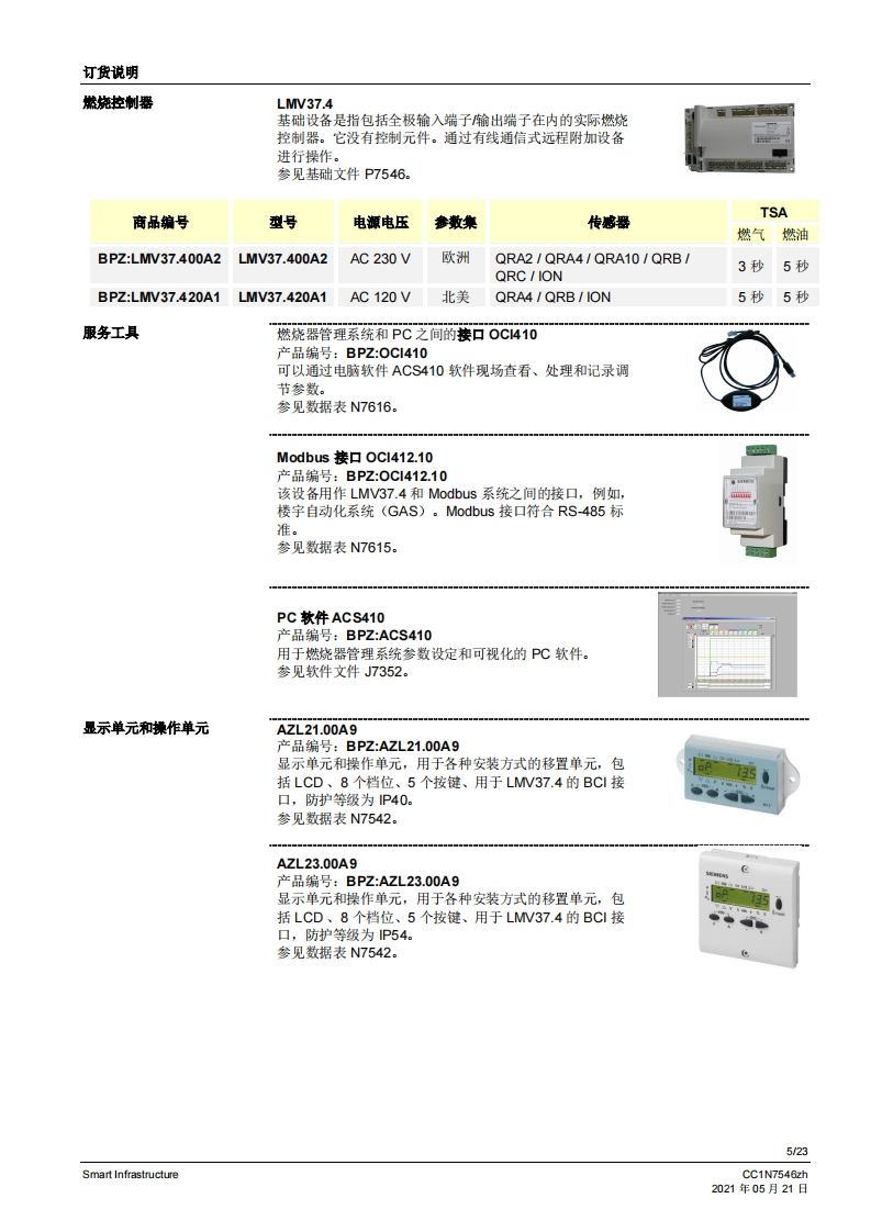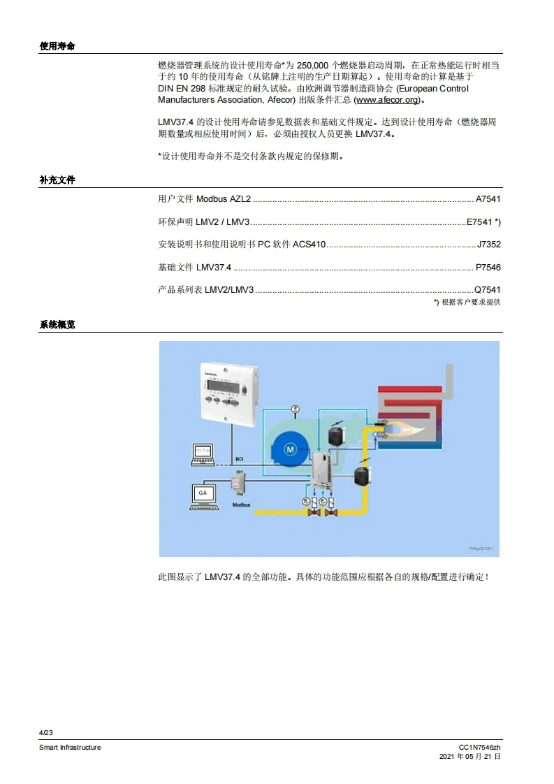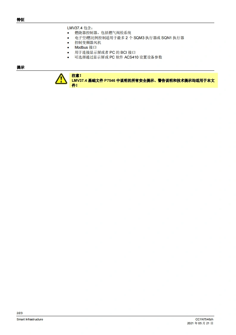 SIEMENS7546CE年p可o专用于鼓风燃烧器的内置空燃比例控制LMV37.400Ax的基础设备LMV37.420Ax燃烧器管理系统LMV37.4是徽处理器控制的燃烧控制器,并配备相四配的系统部件,适用于中高功率鼓风然烧器的控制和监测。LMN37.4及本教据表专供其产品内置或附装了LMN37.4的原始设备制造商(OEM)使用1应用任意大功率单燃料燃烧器的微处理器控制LM小V37.4,配有电子空燃比例控制,并最多带2个执行器和燃气阀的阀门检漏。系统部件(AZL2、执行器)将直接连接到LMV37.4上。系统通过触点反馈网持续监控LMV37.4所有安全相关的数字量输入和输出。根据DIN EN298进行型式检测并获得认证符合EN676标准的应用:带鼓风机的气态燃料自动燃烧器符合EN267标准的应用:用于液态燃料的鼓风燃烧器适用于欧洲间歇性运行时离子棒或光学传感器QRA、QRB或QRC可与LMV37.4连接使用。仅用高子棒才可实现连续运行。适用于北美地区间歇性运行时离子棒或光学传感器QRA或QRB可与LV37.4搭配使用。仅用离子棒才可实魂连续运行。CC1N7546zhSmart Infrastructure2021年05月21日