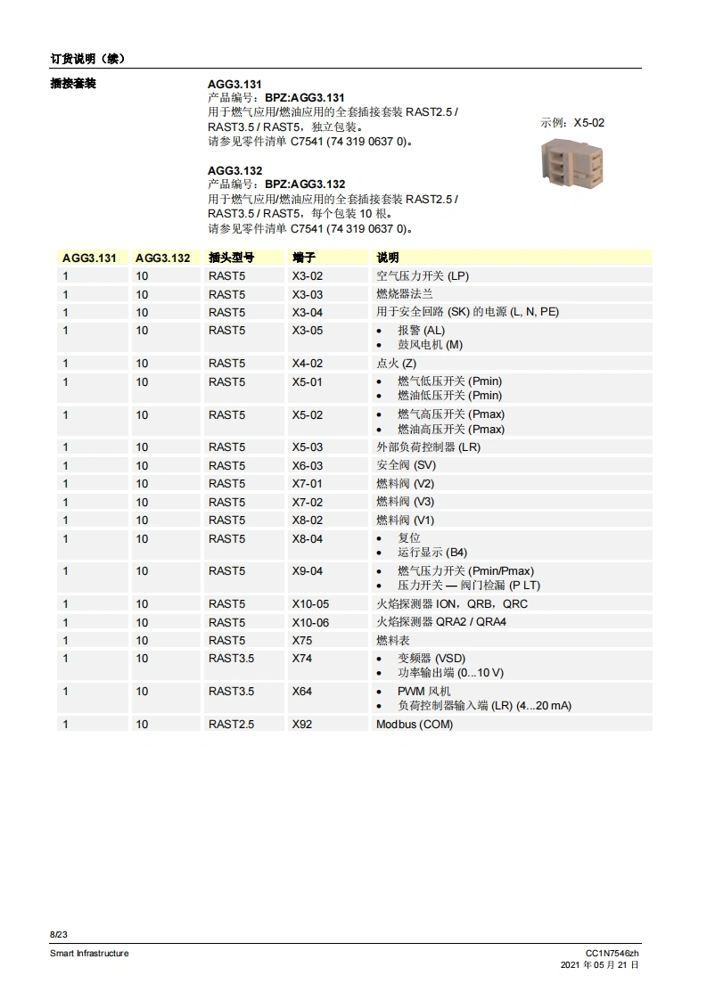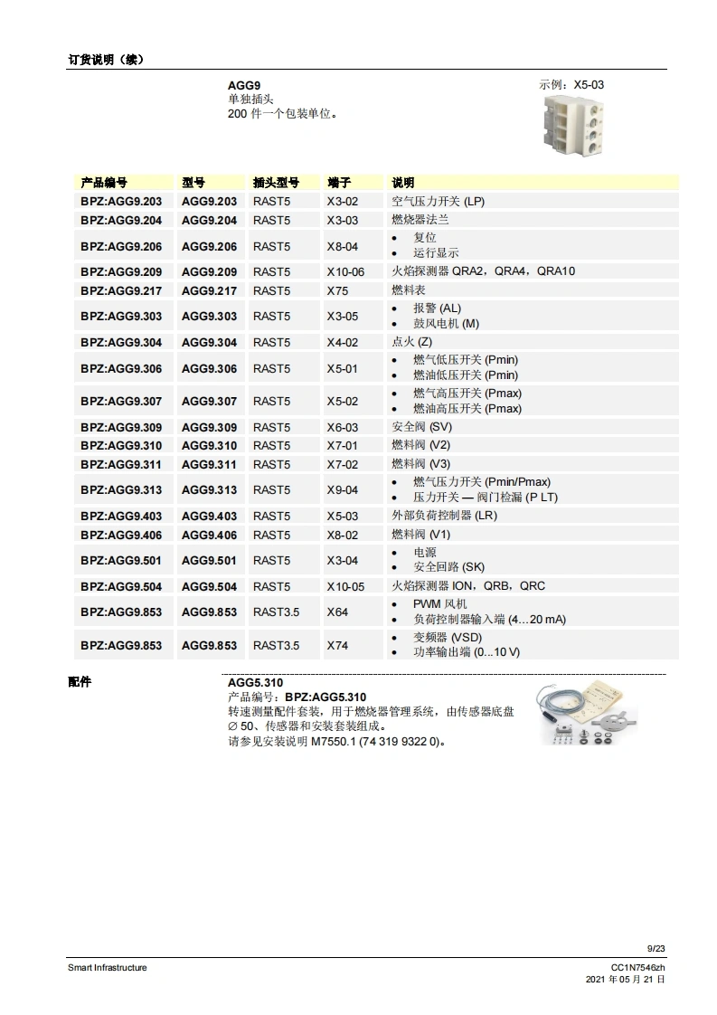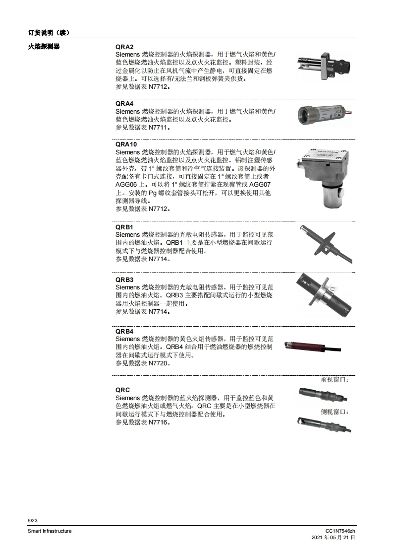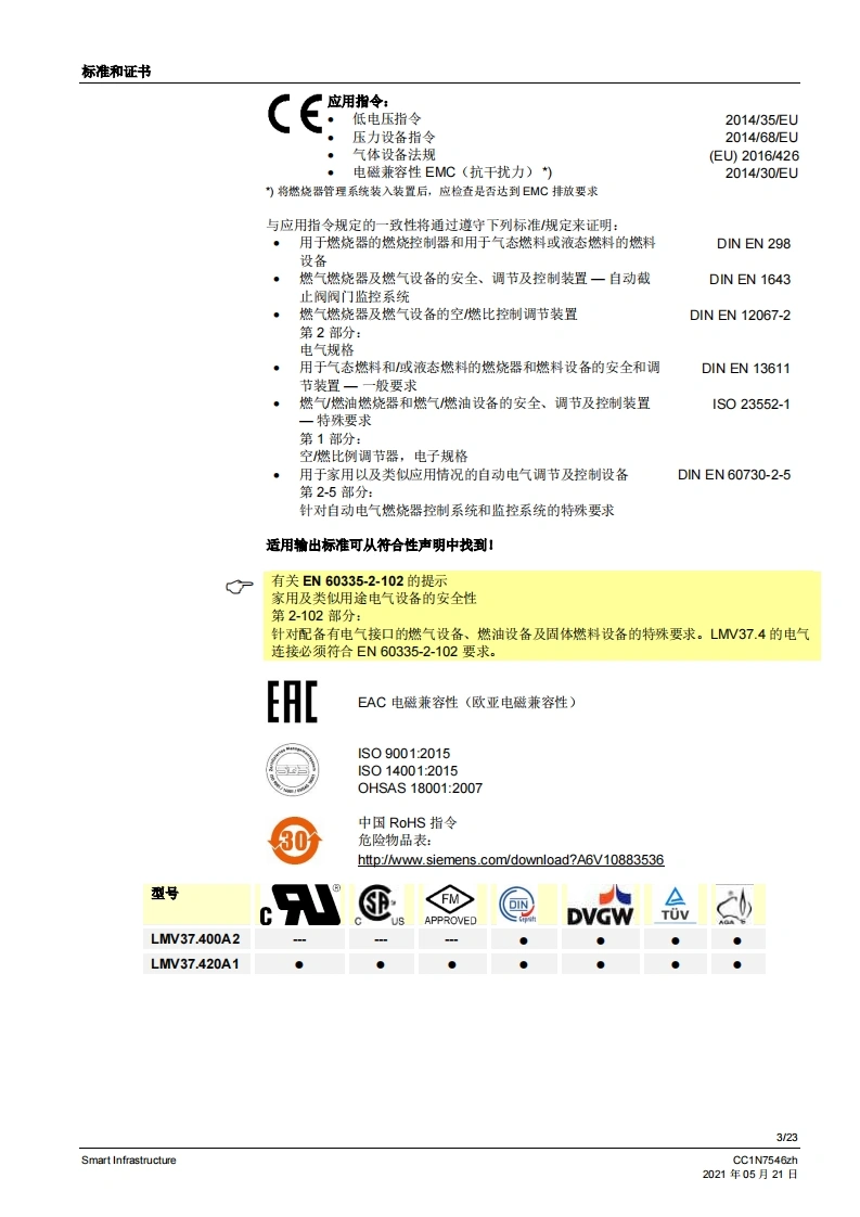 SIEMENS7546CE年p可o专用于鼓风燃烧器的内置空燃比例控制LMV37.400Ax的基础设备LMV37.420Ax燃烧器管理系统LMV37.4是徽处理器控制的燃烧控制器,并配备相四配的系统部件,适用于中高功率鼓风然烧器的控制和监测。LMN37.4及本教据表专供其产品内置或附装了LMN37.4的原始设备制造商(OEM)使用1应用任意大功率单燃料燃烧器的微处理器控制LM小V37.4,配有电子空燃比例控制,并最多带2个执行器和燃气阀的阀门检漏。系统部件(AZL2、执行器)将直接连接到LMV37.4上。系统通过触点反馈网持续监控LMV37.4所有安全相关的数字量输入和输出。根据DIN EN298进行型式检测并获得认证符合EN676标准的应用:带鼓风机的气态燃料自动燃烧器符合EN267标准的应用:用于液态燃料的鼓风燃烧器适用于欧洲间歇性运行时离子棒或光学传感器QRA、QRB或QRC可与LMV37.4连接使用。仅用高子棒才可实现连续运行。适用于北美地区间歇性运行时离子棒或光学传感器QRA或QRB可与LV37.4搭配使用。仅用离子棒才可实魂连续运行。CC1N7546zhSmart Infrastructure2021年05月21日