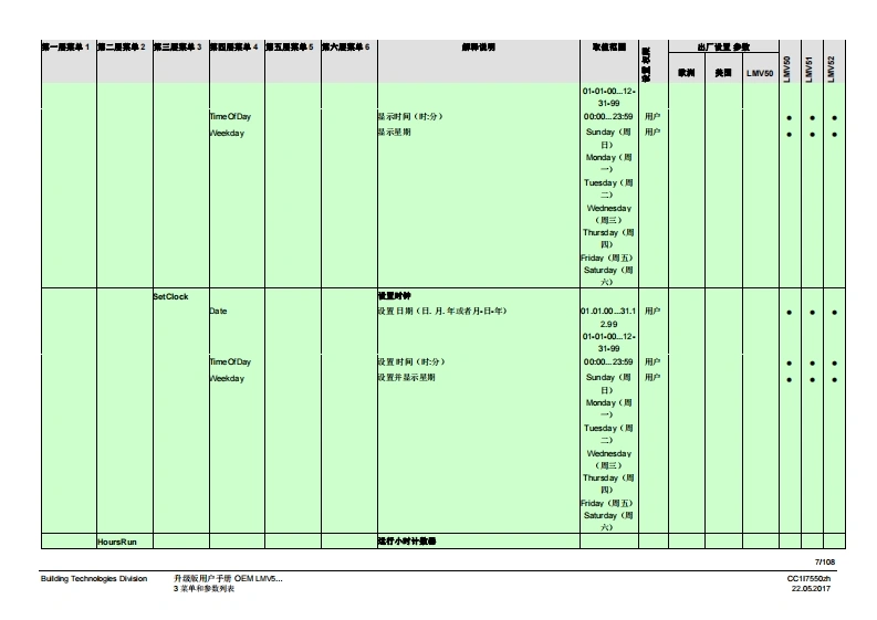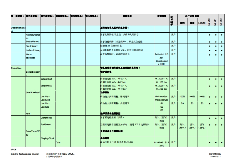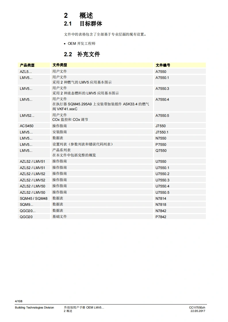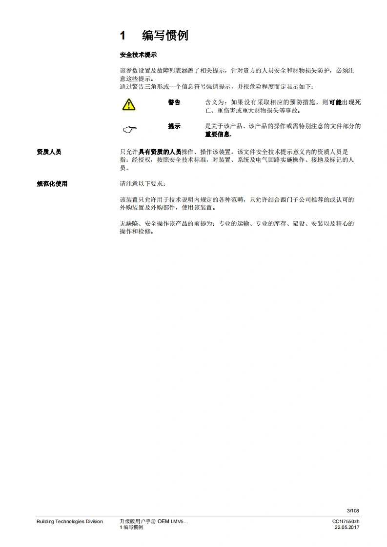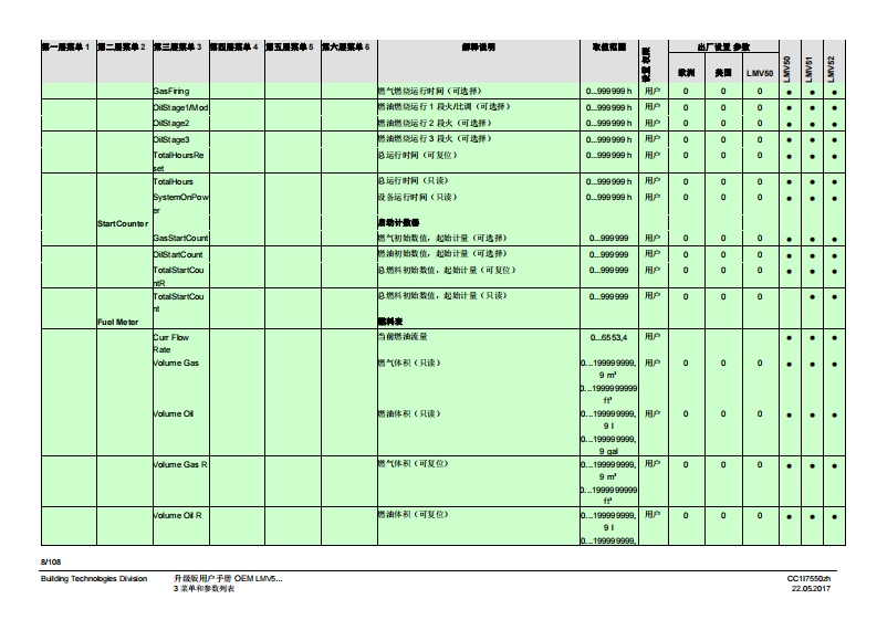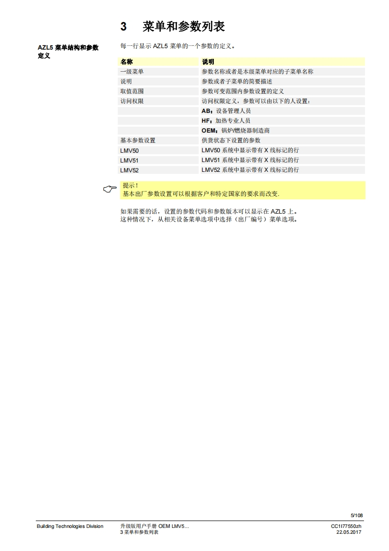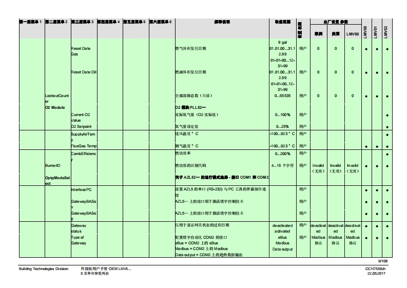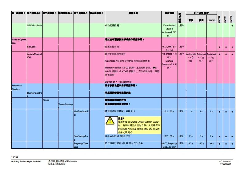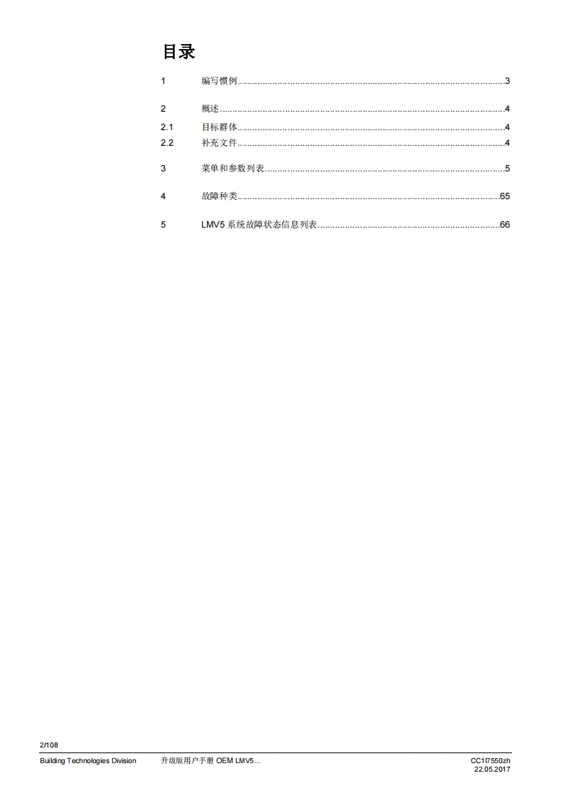 SIEMENS咖LMV50.../LMV51.../LMV52带主要功能的鼓风燃烧器燃烧器管理系统-燃烧器控制-燃料空气比例控制锅炉调节器/功率调节器LMV50...具有适用于工业应用的特殊功能LMV52...带有辅助的氧气调节系统升级版用户手册OEM参数设置与故障列表LMV5及其用户手册适用于将该燃烧设备集成进或结合其它产品使用的初装人员(OEM)!适用于软件版LMV50.V10.30LMV51.V05.20LMV51.3.V05.20LMV52.2V05.20LMV52.4.….V10.30内部功率调节器模块……V02.10内部变频器模块V01.50AZL52.V05.10PLL52V01.50CC117550zhBuilding Technologies Division22.05.2017
