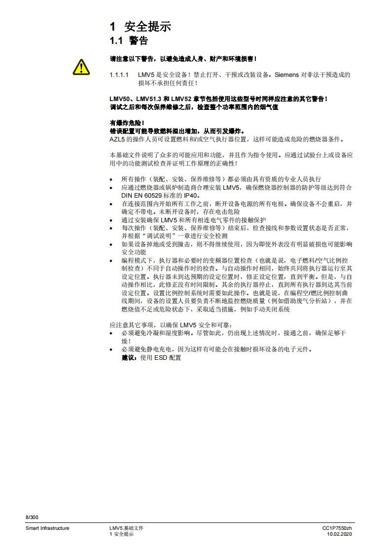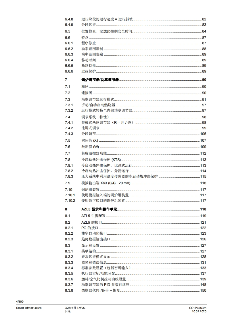 SIEMENSce师LMV50/LMV51/LMV52带主要功能的鼓风燃烧器燃烧器管理系统燃烧器控制燃料空气比例控制。锅炉调节器功率调节器LMV50具有适用于工业应用的特殊功能LMV52带有辅助的氧气调节系统基础文件LMV5以及本基础文件专供在其设备中集成使用燃烧器控制器的原始设各制造商(OEM)使用!适用于软件版本LMV50:V10.30LMV51:V05.20LMV51.3:V05.20LMV52.2:V05.20LMV52.4:V10.30Int.LC-模块:V02.10Int.VSD-模块:V01.50AZL52:V05.10PLL52:V01.50CC1P7550zhSmart Infrastructure10.022020