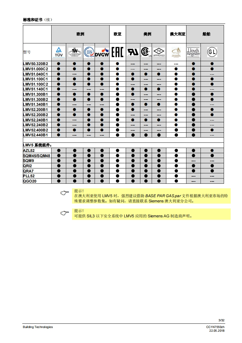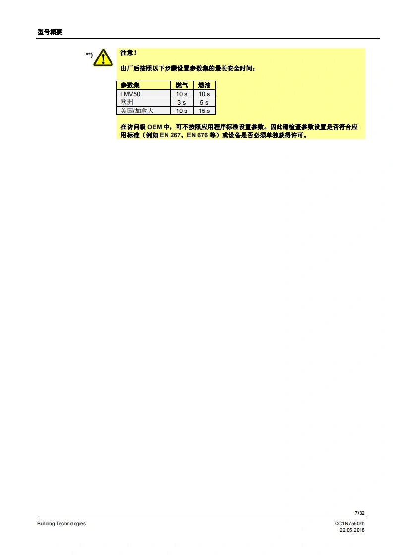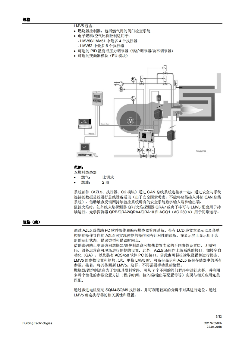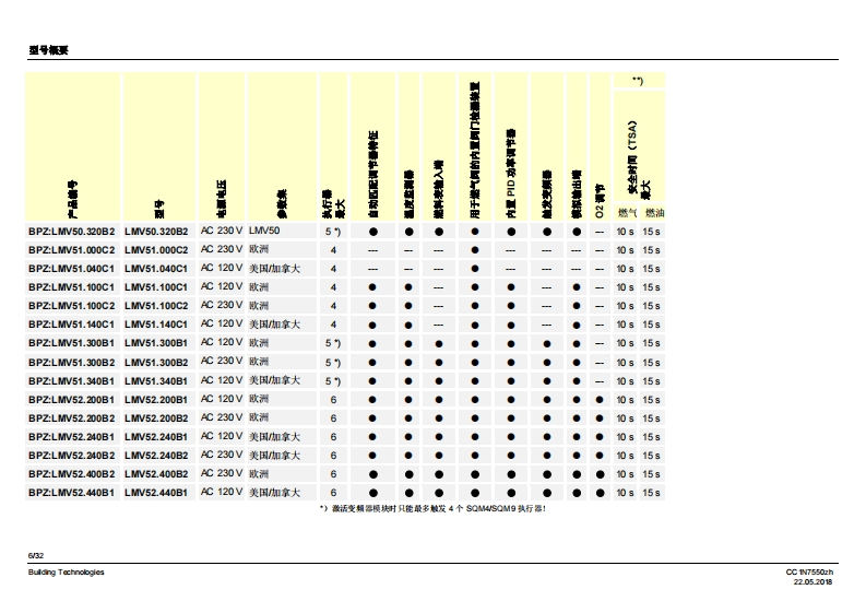 SIEMENS7550燃烧器管理系统LMV5...LMV50带有内置燃料空气比例控制和鼓风燃烧器功率调节功能的燃烧器管理系统。具有适用于工业应用的特殊功能。LMV51带有内置燃料空气比例控制和鼓风燃烧器功率调节功能的燃烧器管理系统。LMV52带有内置燃料空气比例控制和搭配辅助氧气调节系统的鼓风燃烧器功率调节功能的燃烧器管理系统。LV5以及本资料专供在其设备中集成使用MV5的原始设备制造商(OEM)使用I应用燃烧器管理系统LMV5是微处理器控制的自动装置,并配备相关的系统部件,用于大中型功率鼓风燃烧器的控制和监测。提示警告!LMV5基础文件P7550中给出的所有安全、警告和技术信息也必须显示在本文件中I适用于软件版本LMV50:V10.30MW51:V05.20LMV51.3:V05.20MW52.2:V05.20LMV52.4:V10.30内部功率调节器模块:V02.10内部变频器模块:V01.50AZL52V05.10PL52:V01.50Building TechnologiesCC1N7550zh22.052018