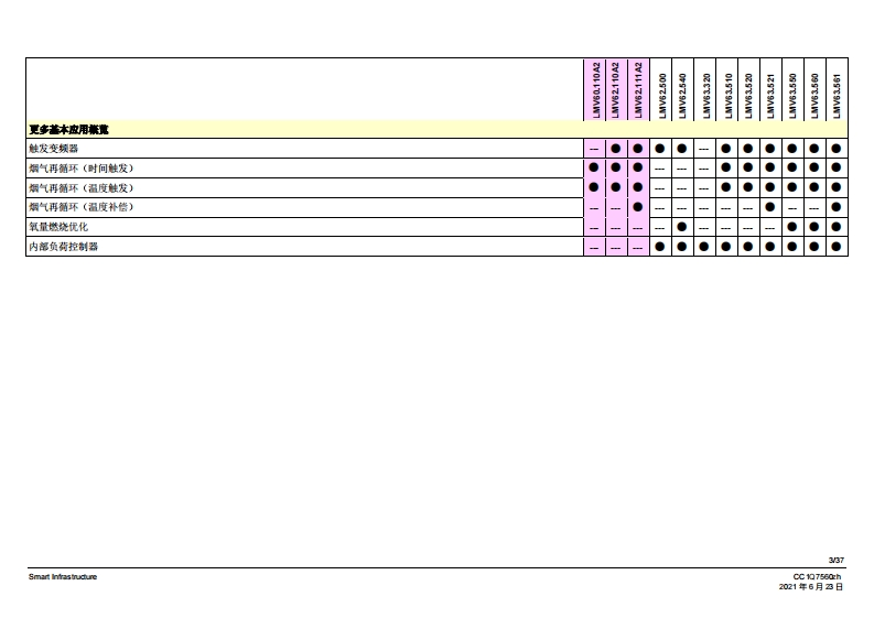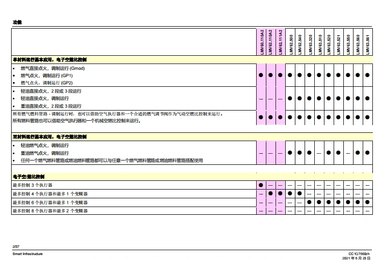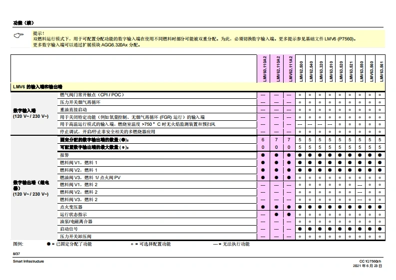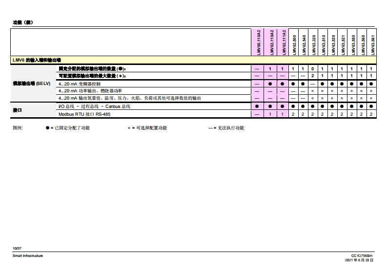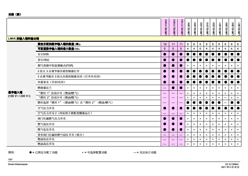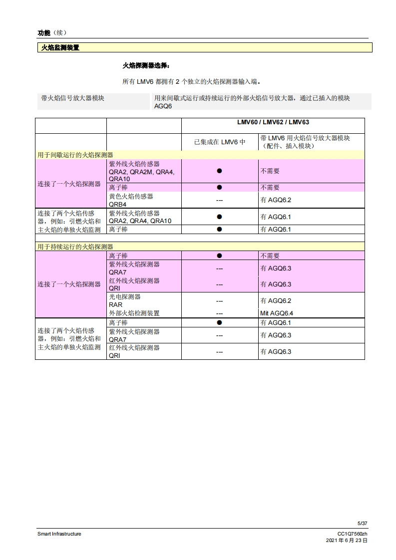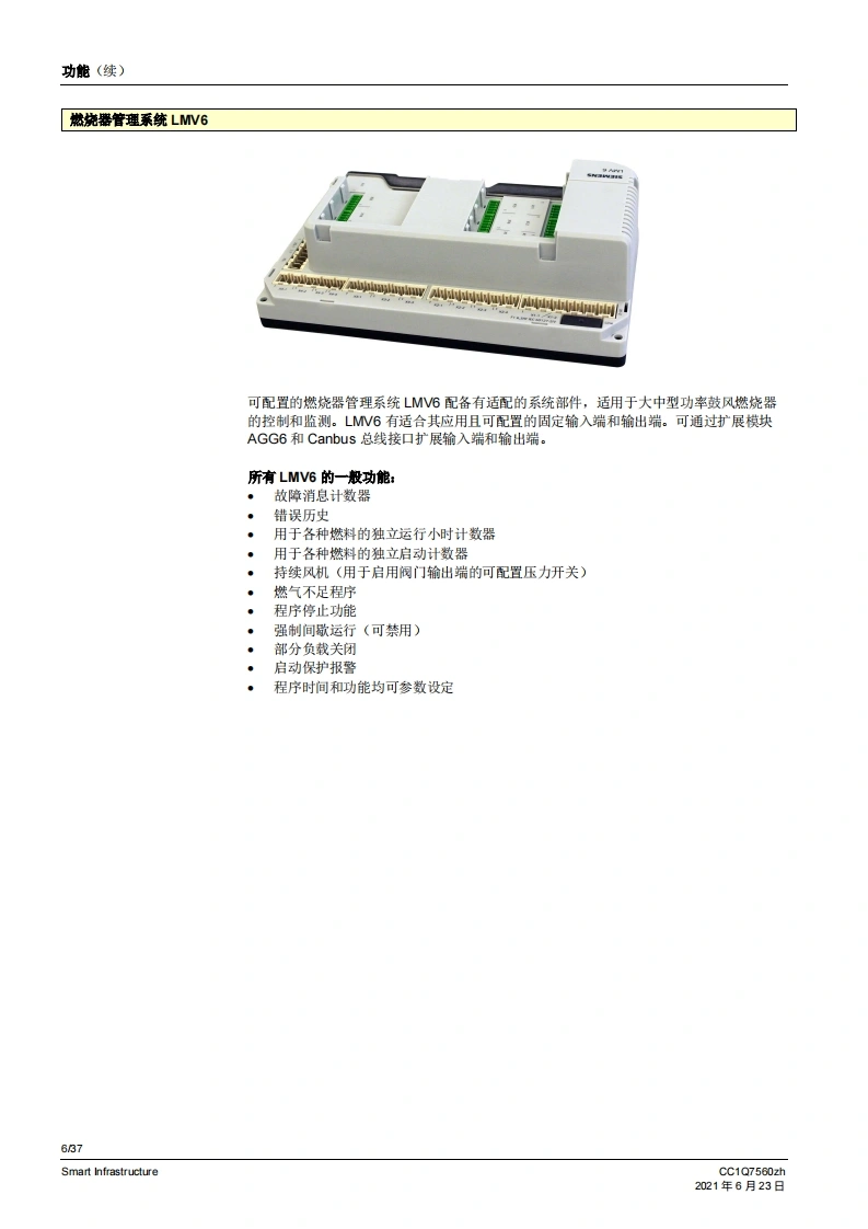 SIEMENS7560SIEMENS产品系列表LMV6…燃烧器管理系统LM6承担中等功率至高功率鼓风燃烧器的所有监测任务,可通过集成通讯接口实现模块化系统扩展。基础设备LV6包含:燃烧器控制器,包括燃气阀的阀门检查系统电子式燃料空气空燃比控制器,用于最多6个执行器可选:PD温度控制器压力控制器(内部负荷控制器)可选变频器控制可选氧量控制和氧量报警(含QGC》本文件是一份关于LMV6燃烧器管理系统产品系列最重要功能和组件的简要概览。提示!标记部分适用于第一个和第二个市场套餐。应用通过热水锅炉或蒸汽锅炉供暖的住宅建筑和非住宅建筑工业设备直接燃烧加热的热工设备目标群体·销售者内勤燃烧器OEM设备规划者·设备制造者·运营者CC1Q7560zhSmart Infrastructure2021年6月23日