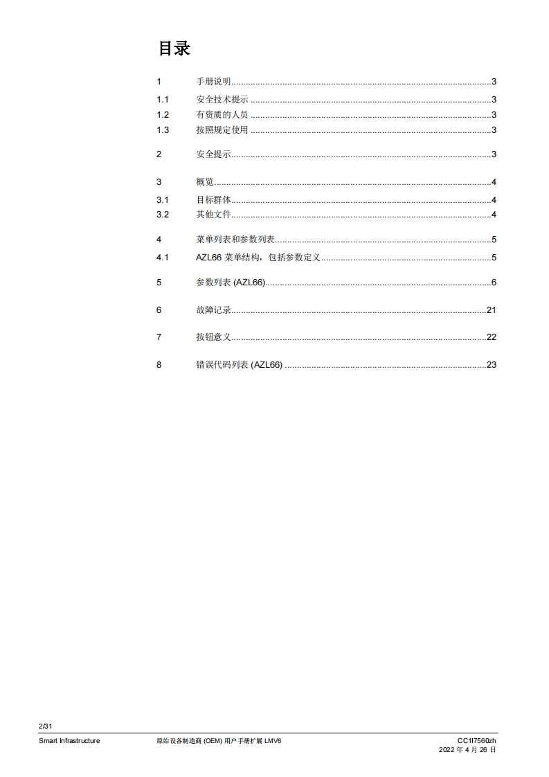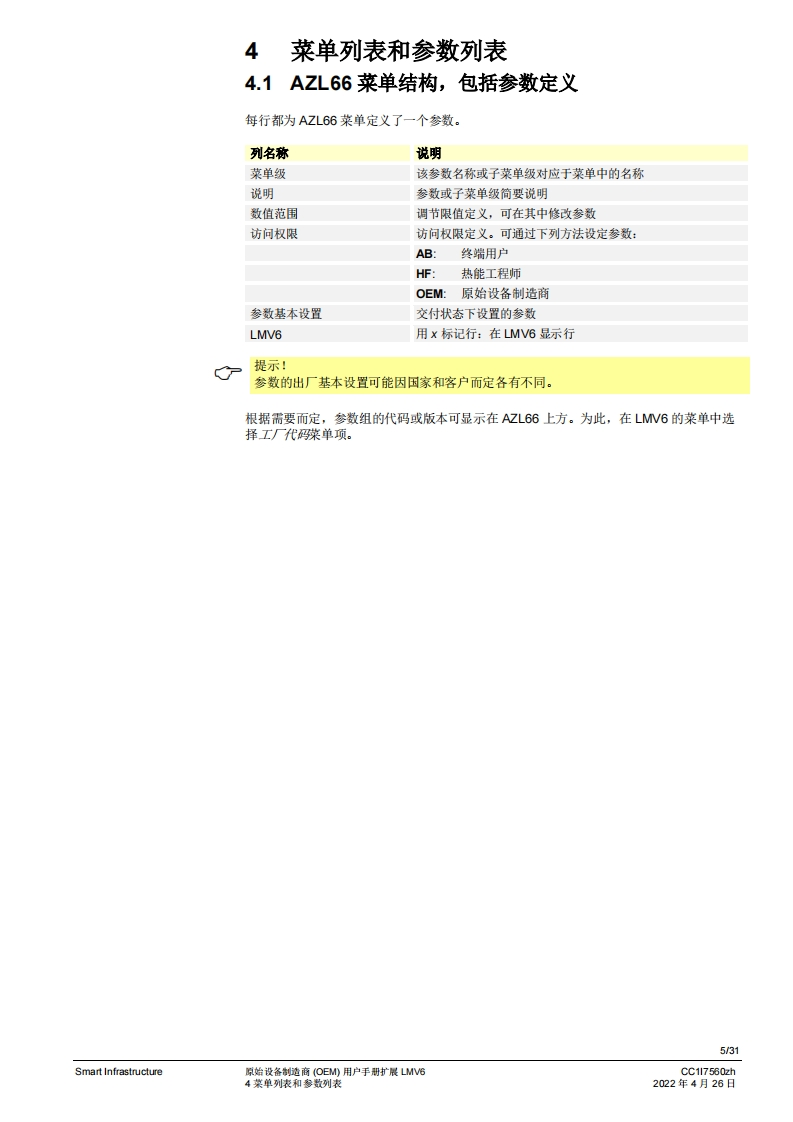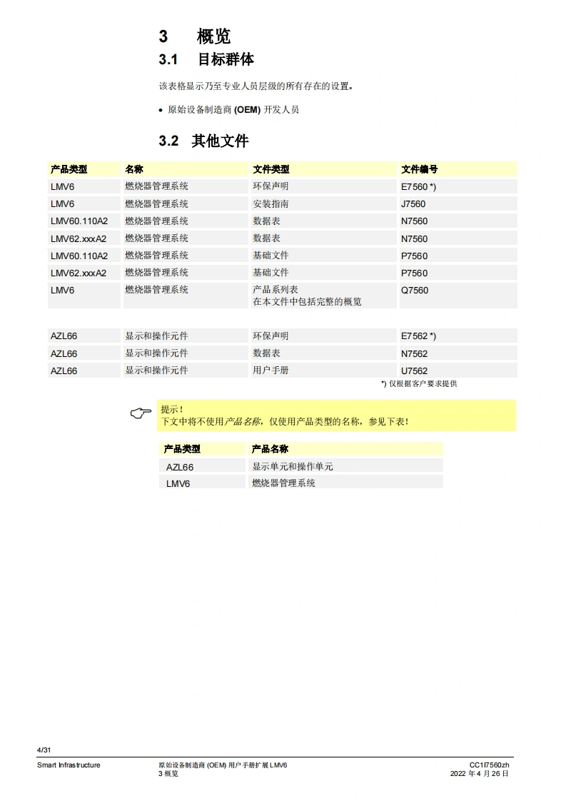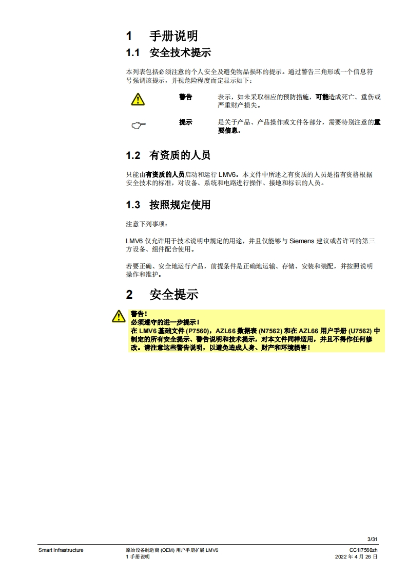 siemens西门子LMV6.参数故障列表-中文安装操作说明书手册找手册网昨天发布关注私信0.48MB31页025siemens西门子LMV6.参数故障列表-中文安装操作说明书手册此内容为付费资源,请付费后查看¥19¥21黄金会员免费钻石会员免费登录购买付费资源 第1页 / 共31页 第2页 / 共31页 第3页 / 共31页 第4页 / 共31页 第5页 / 共31页 第6页 / 共31页 第7页 / 共31页 第8页 / 共31页 第9页 / 共31页 第10页 / 共31页 试读已结束,还剩21页,您可下载完整版后进行离线阅读 THE END西门子 文本预览 SIEMENSSIEMENSLMV60.110A2LMV62.XXxA2燃烧器管理系统原始设备制造商(OEM)用户手册扩展参数列表和错误代码列表LMV6以及列表专供那些产品中内量或连接了LMV6的原始设备制造商(OEM)使用I适用于固件版本LMV60.110A2:.V2.100LMV6200A2:………….V2.100AZL66:V2.100Smart InfrastructureCC117560zh2022年4月26日 查看更多 收起部分 喜欢就支持一下吧收藏