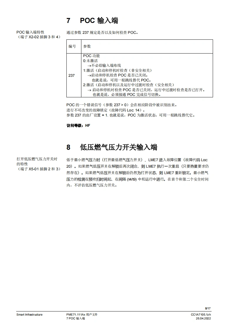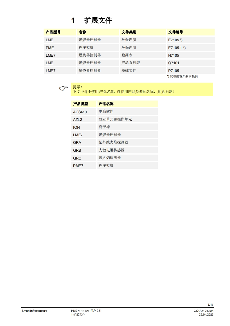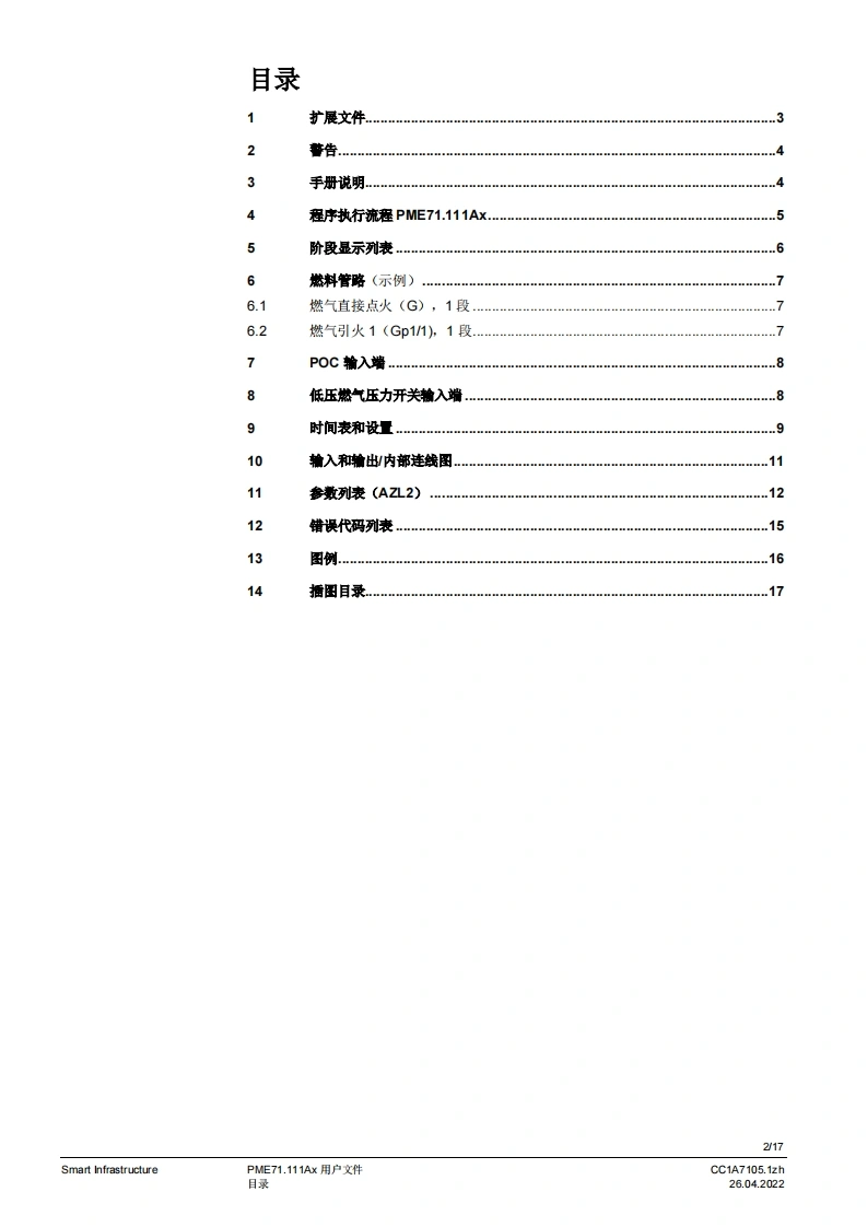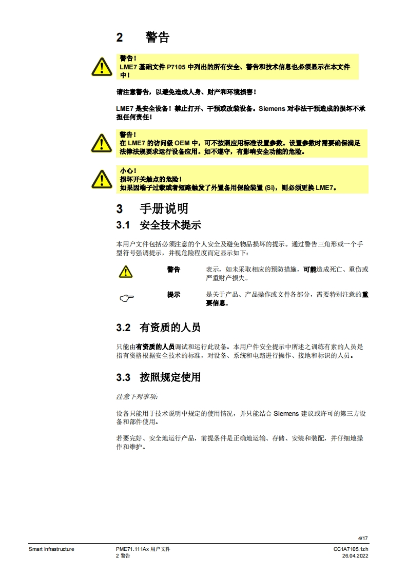SIEMENSw。PME7图示LME7图示PME71.111Ax燃烧器控制器LME71.000Ax程序模块用户文件应用:,1段式直接或引火鼓风燃烧器-德火时的响应时间3秒(可设为1秒/3秒)-比如用于符合EN676标准的燃烧器或符合EN746-2部分的热工艺设备PME7以及本用户文件专供产品中使用LME7和PME7的原始设备制造商(OEM)使用提示!本文件仅在与LME7基础文件P7105结合使用时有效:软件版本V02.03Smart InfrastructureCC1A7105.1zh26.04.2022