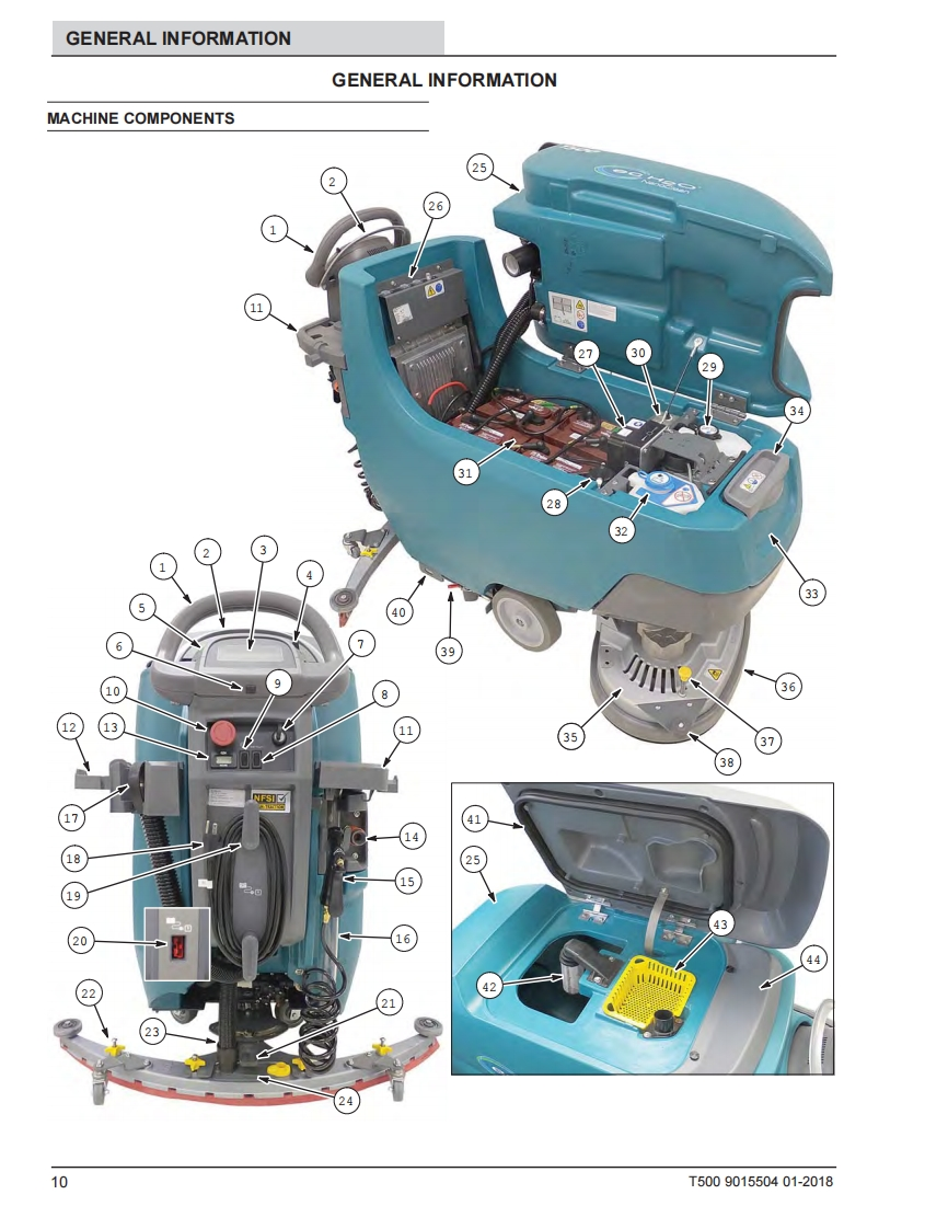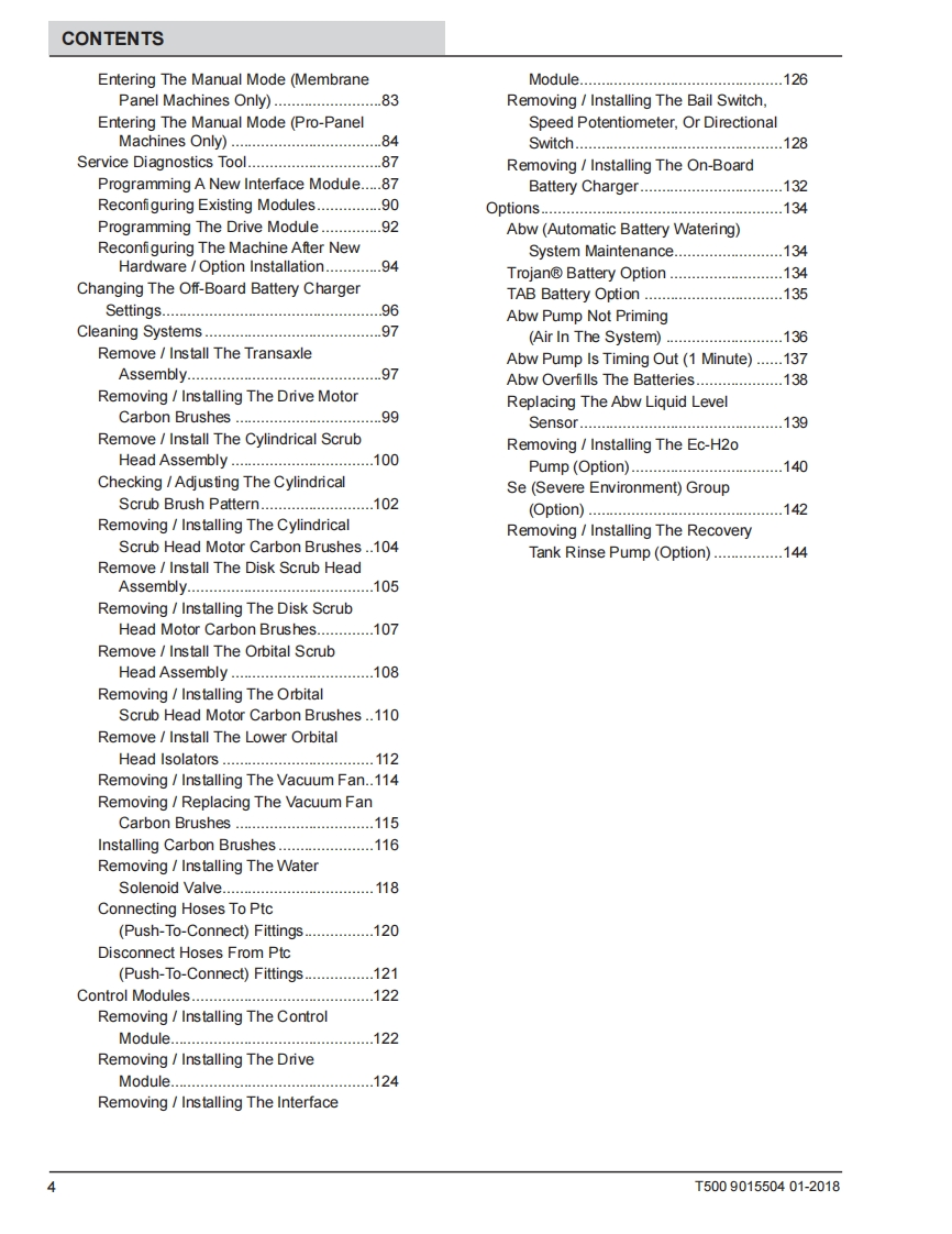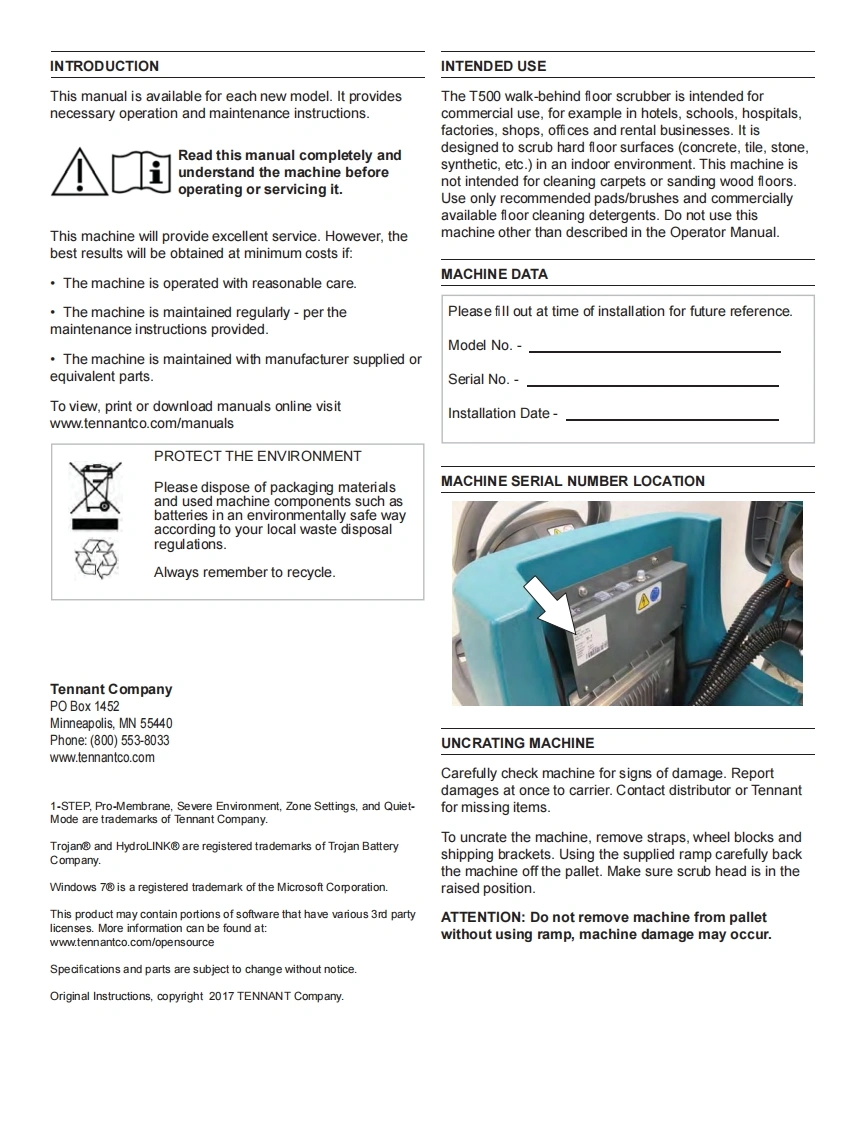 TENNANTT500(Battery)Automatic Floor ScrubberService Information ManualHygenic Fully Cleanable Recovery TankTennant True PartsIRIS a Tennant TechnologyPro-PanelTM ControlsInsta-FitTM AdapterH2CSmart-FillTMAutomatic Battery WateringAn ORBIO TechnologyNorth America International9015504可隆▣For the latest Parts Manuals and otherlanguage Operator Manuals,visit:Rev.01(1-2018)回妇www.tennantco.com/manuals