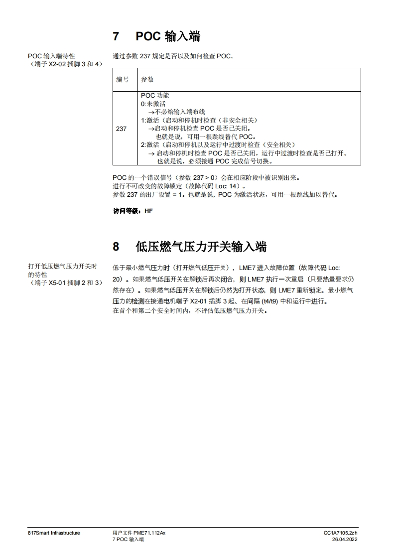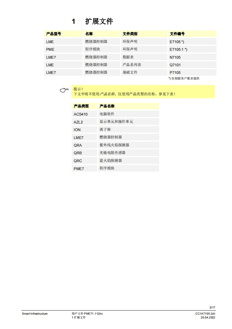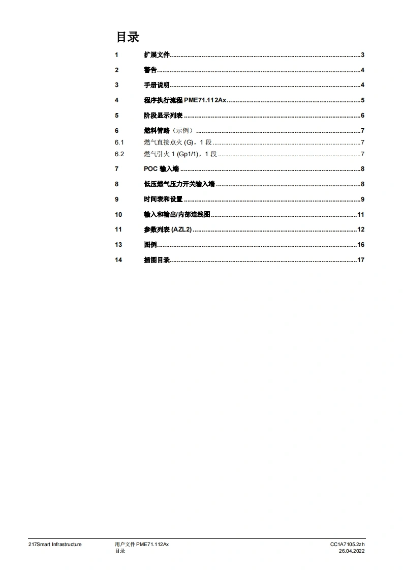 SIEMENS通w。一PME7图示LME7图示PME71.112Ax燃烧器控制器LME71.000Ax程序模块用户文件应用:·1段,直接点火或引火的大气式燃烧器德火时的响应时间3秒(可设为1秒/3秒)。比如用于符合EN676标准的燃烧器或符合EN746-2部分的热工艺设PME以及本用户文件专供产品中使用LME和PME的原始设备制造商(OEM)使用提示!本文件仅在与LME7基础文件P7105结合使用时有效!软件版本V02.03Smart InfrastructureCC1A7105.2zh26.04.2022