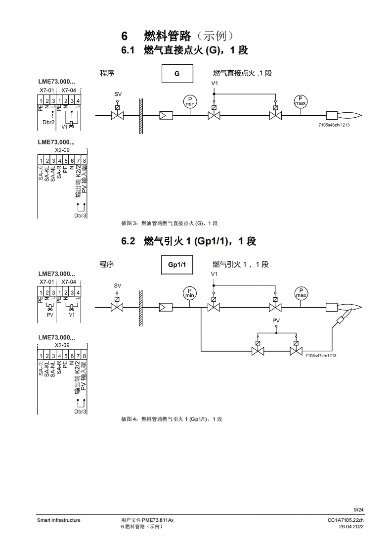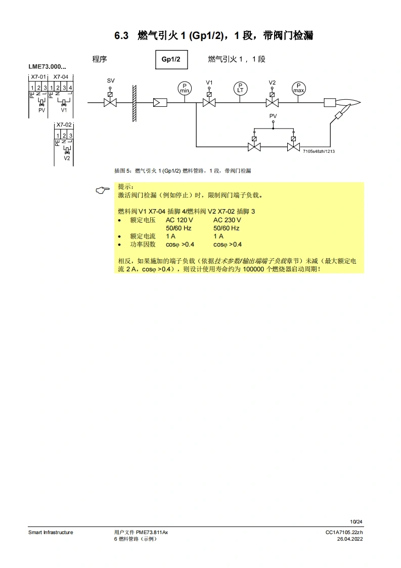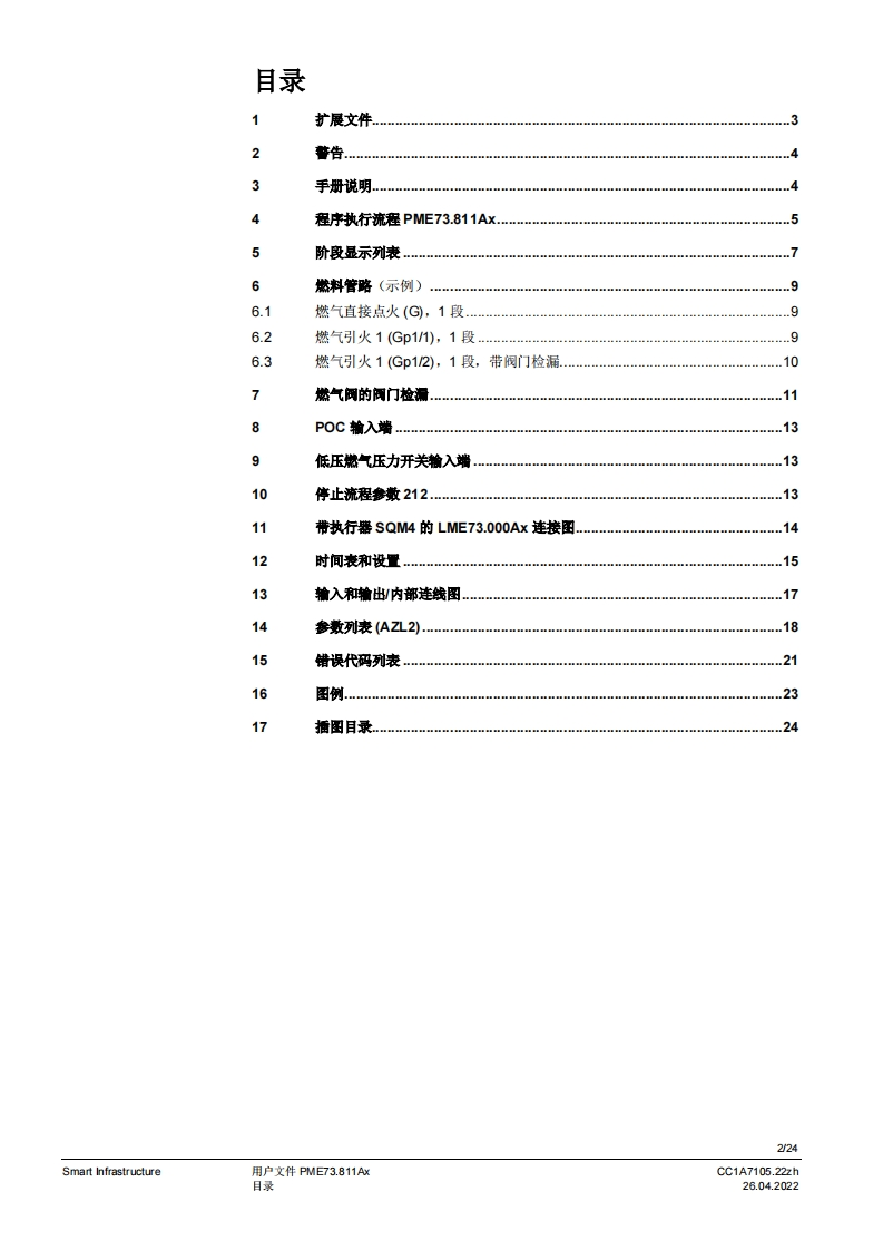 SIEMENS7SIEMENSUWE73096A2888到PME7图示LME7图示PME73.811Ax燃烧器控制器LME73.000Ax程序模块用户文件应用:·1段或比调式,直接或引火式鼓风然烧器·采用3位步进调节器或棋拟信号的集成执行器控制(需要执行器内的反债电位计)执行器没有“关”位置,点火位置=小火位量置集成阀门检漏(可设置参数)德火时的响应时间3秒(可设为1秒/3秒)比如用于符合EN676标准的燃烧器或符合EN746-2部分的热工艺设备PME7以及本用户文件专供产品中使用LME7和PME7的原始设备制造商(OEM)使用提示!本文件仅在与LE7基础文件P7105结合使用时有效:软件版本V02.03Smart InfrastructureCC1A7105.22zh26.04.2022