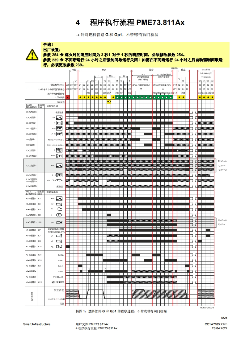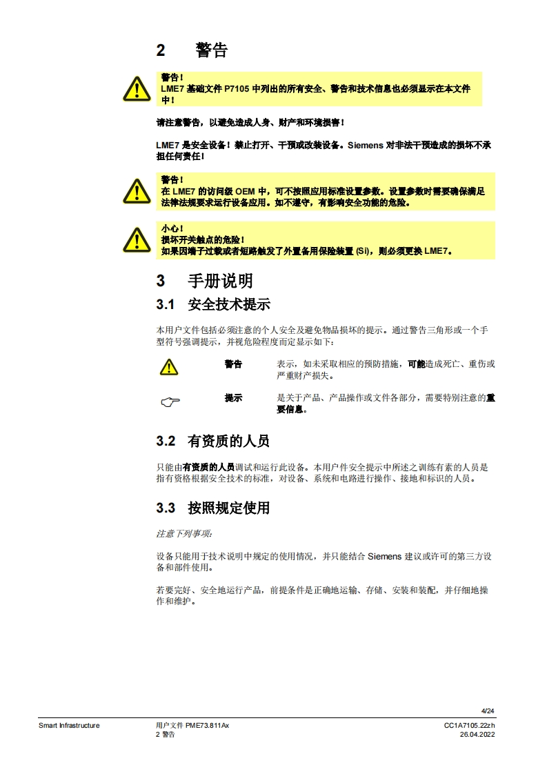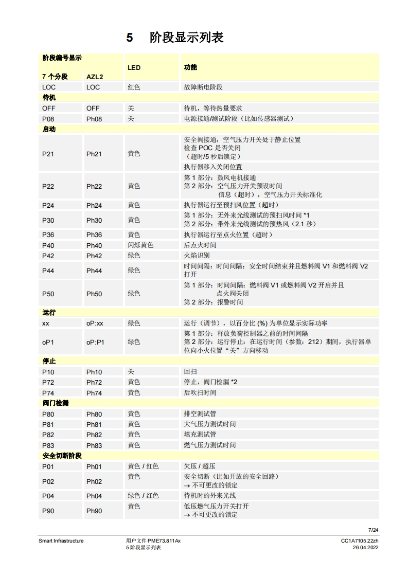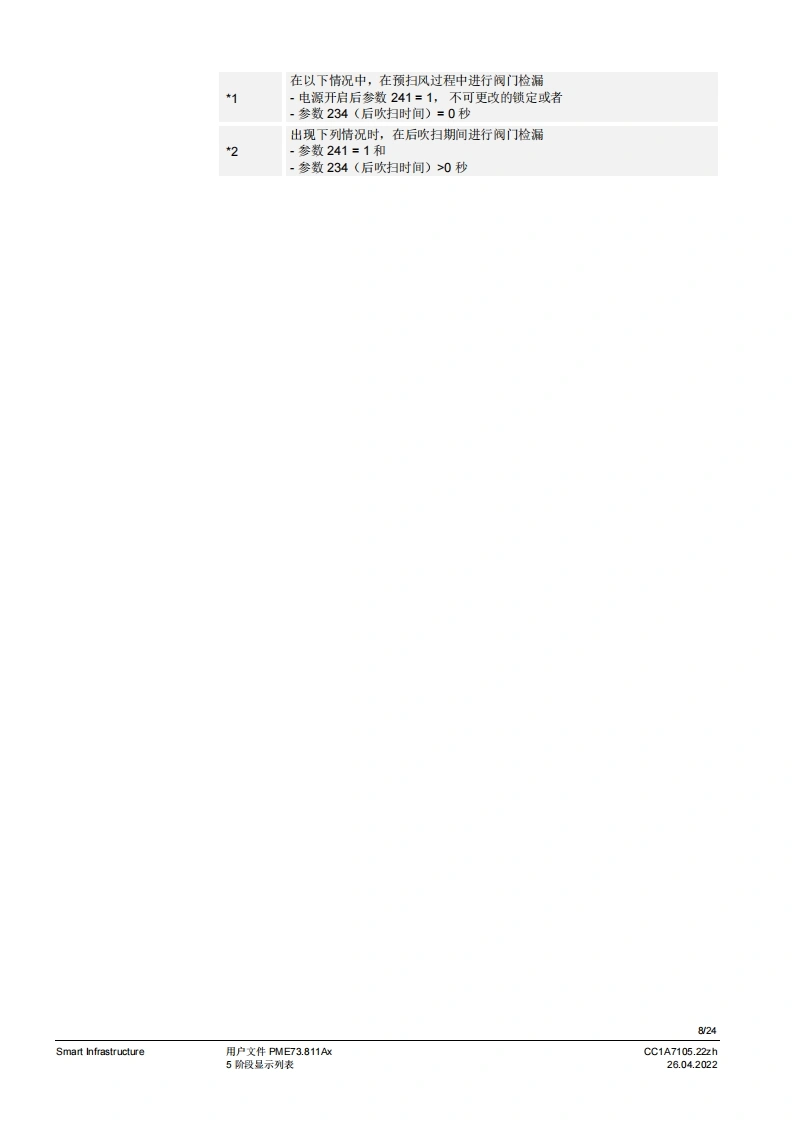 SIEMENS7SIEMENSUWE73096A2888到PME7图示LME7图示PME73.811Ax燃烧器控制器LME73.000Ax程序模块用户文件应用:·1段或比调式,直接或引火式鼓风然烧器·采用3位步进调节器或棋拟信号的集成执行器控制(需要执行器内的反债电位计)执行器没有“关”位置,点火位置=小火位量置集成阀门检漏(可设置参数)德火时的响应时间3秒(可设为1秒/3秒)比如用于符合EN676标准的燃烧器或符合EN746-2部分的热工艺设备PME7以及本用户文件专供产品中使用LME7和PME7的原始设备制造商(OEM)使用提示!本文件仅在与LE7基础文件P7105结合使用时有效:软件版本V02.03Smart InfrastructureCC1A7105.22zh26.04.2022