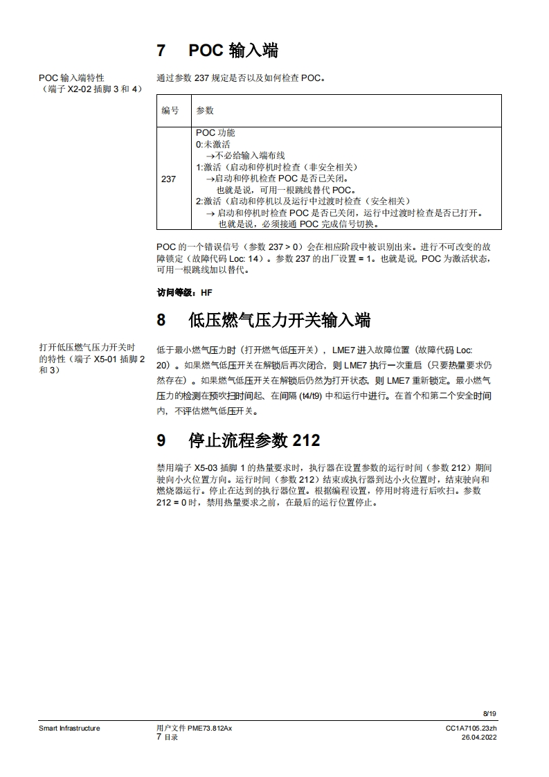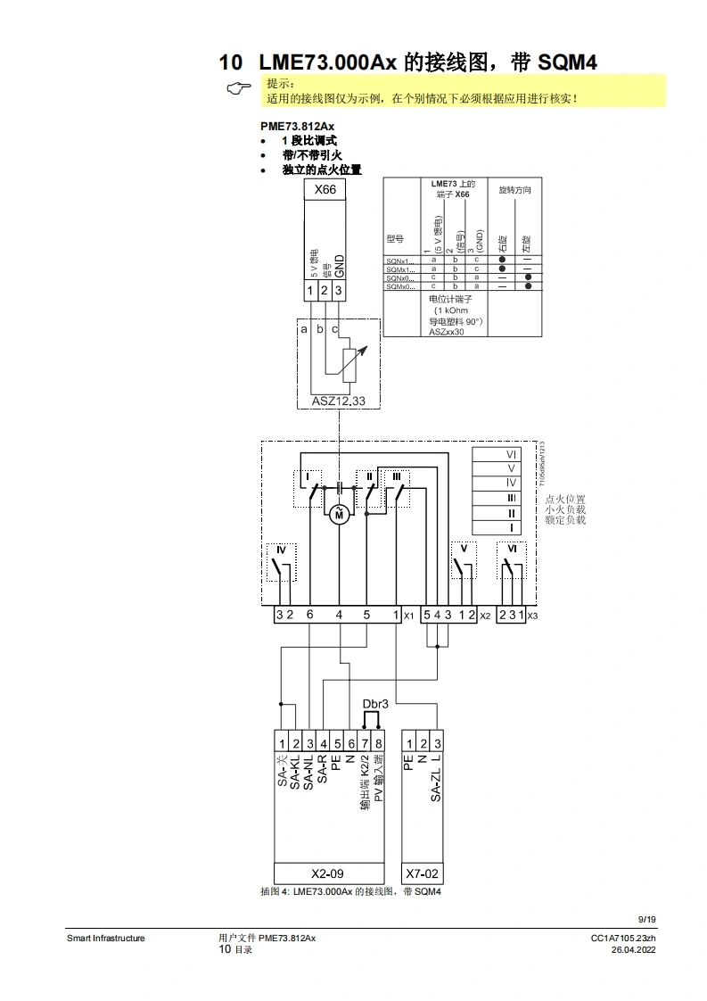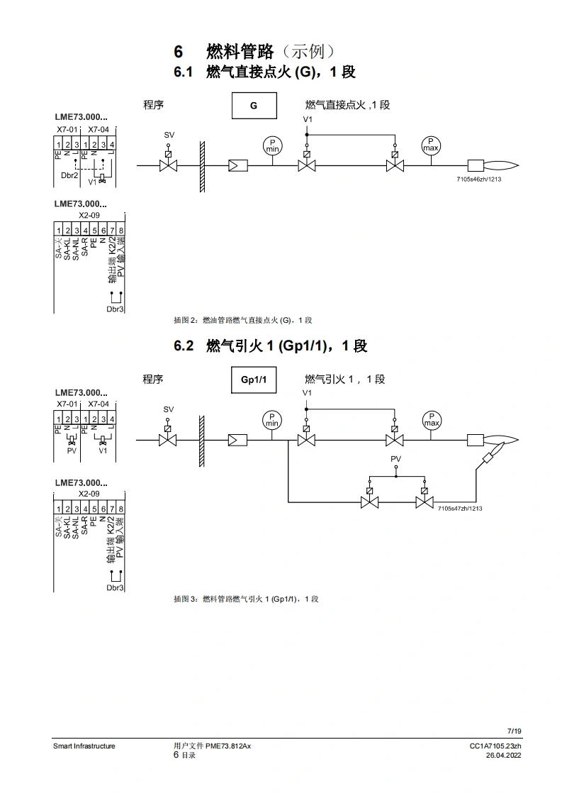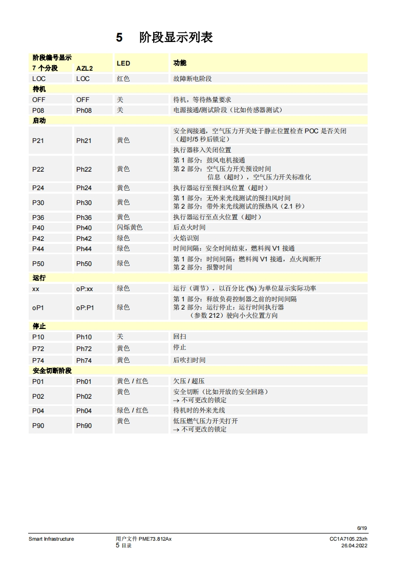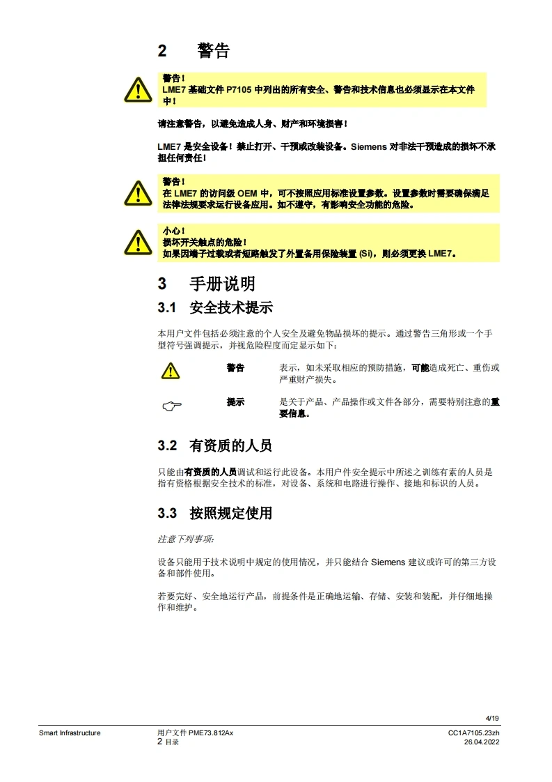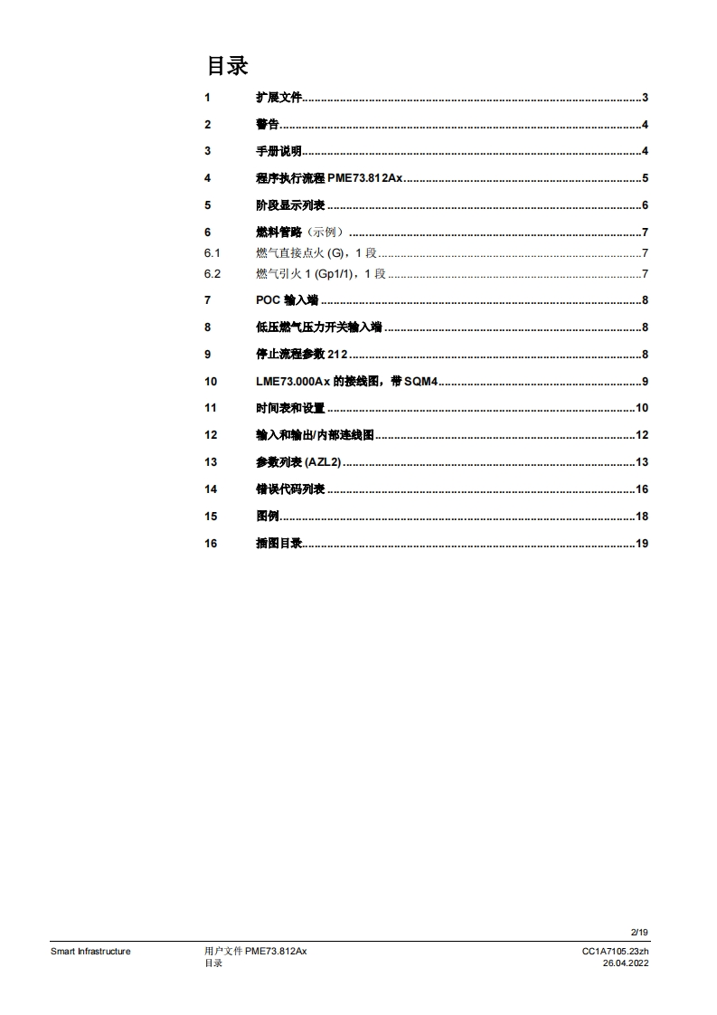SIEMENSSIEMENSLNE73005A2888乌翻PME7图示LME7图示PME73.812Ax燃烧器控制器LME73.000Ax程序模块用户文件应用:·1段或比调式、直接点火或引火的鼓风燃烧器·采用3位步进调节器或模拟信号的集成执行器控制(需要执行器内的反债电位计)执行器没有“关”位置,小火负载上方独立的点火位置媳火时的响应时间3秒(可设为1秒/3秒)·比如用于符合EN676标准的燃烧器或符合EN746-2部分的热工艺设备PME7以及本用户文件专供产品中使用LME7和PME7的原始设备制造商(OEM)使用提示!本文件仅在与LME7基础文件P7105结合使用时有效:软件版本V02.03Smart InfrastructureCC1A7105.23zh26.04.2022