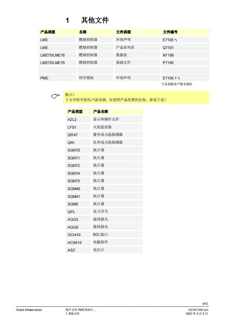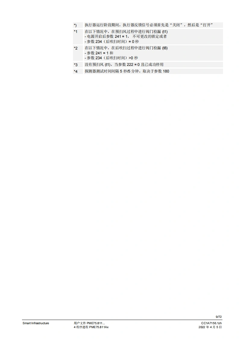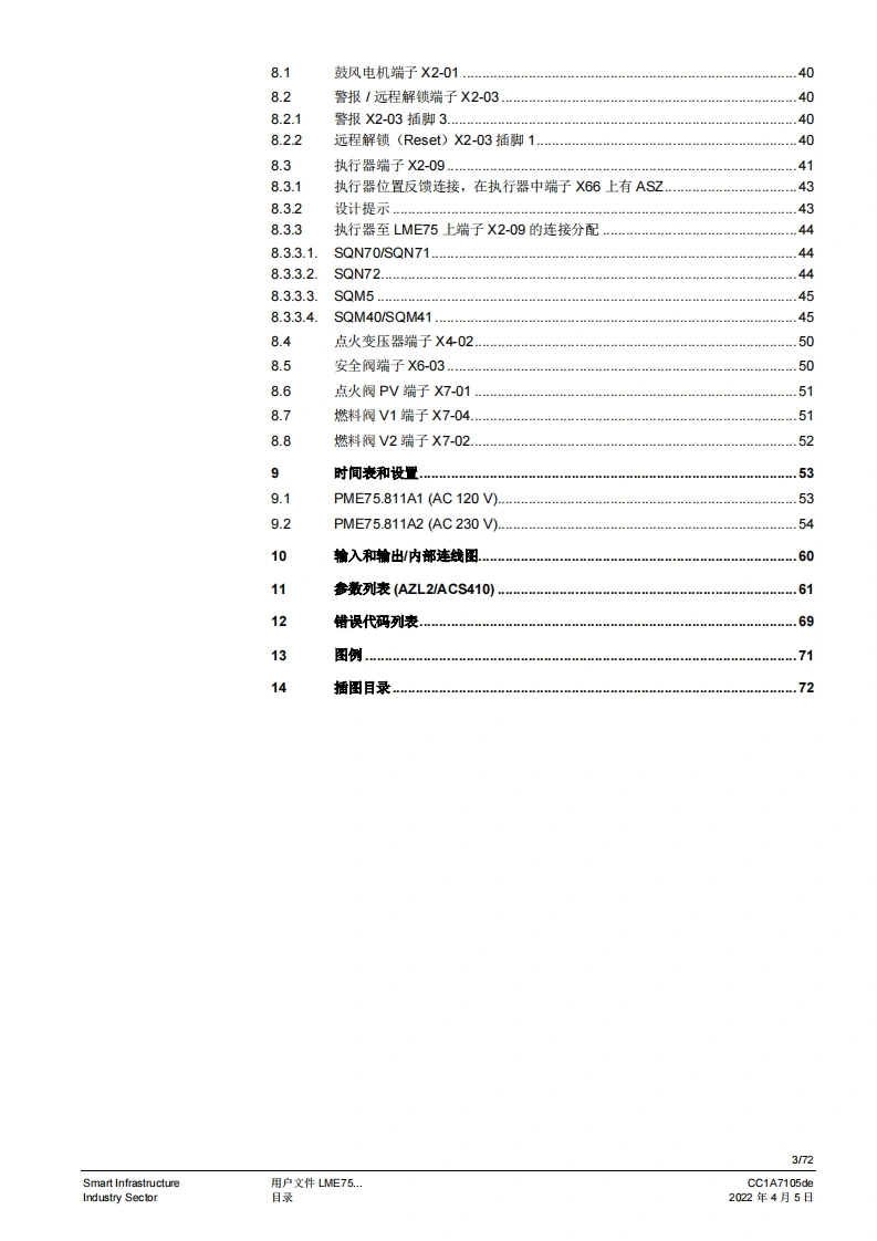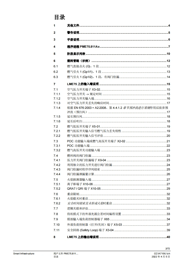 SIEMENS(E送888图示示例PME75图示示例LME75PME75.811Ax燃烧控制器LME75.000Ax的程序模块用户文件应用:1段或比调式,直接或引火式鼓风燃烧器执行器无“关闭”位量,点火负粮=小火负载位量通过三位浮点调节器或模拟信号工作的集成式执行器控制集成阀门检漏功能德火测试响应时间可编程设定。例如:符合EN676的燃烧器或者符合EN746第2部分的工业过程加热设备连续运行>24个小时的不间断运行PME75.811AX以及本用户文件专供那些产品中内或连接了带有PME75.811Ax的LME75.000Ax的原始设备制造商(OEM)使用1提示!本文档与LME75LME76基本文件(P7156)结合使用才有效:V03.00及以上软件版本Smart InfrastructureCC1A7156.1zh2022年4月5日
