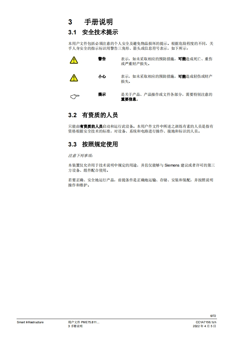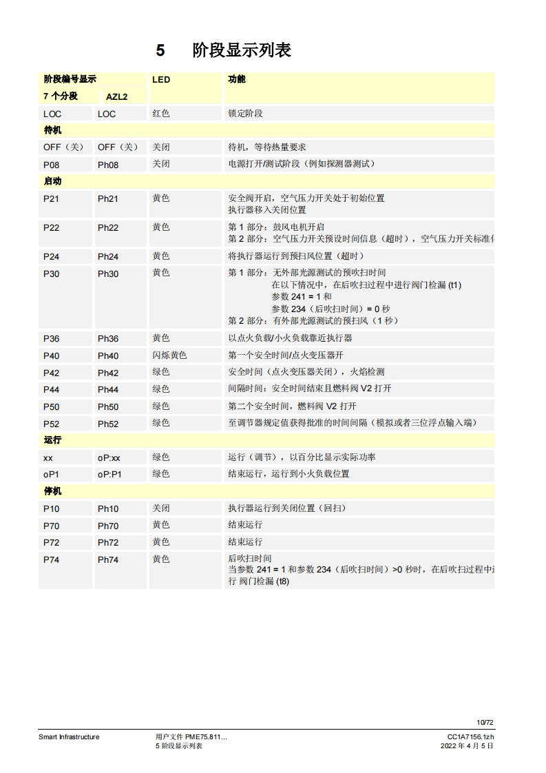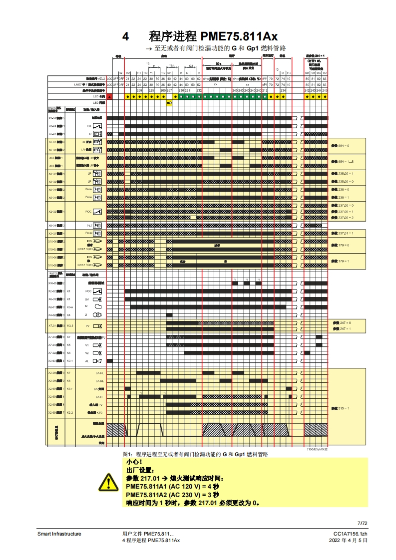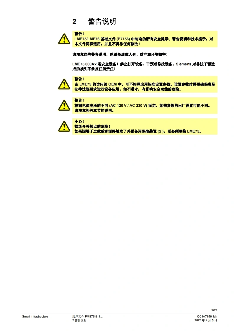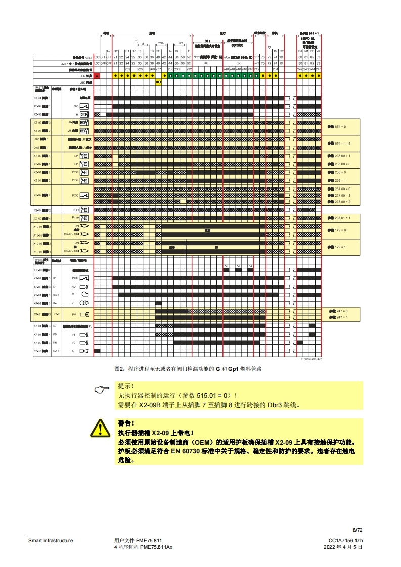 SIEMENS(E送888图示示例PME75图示示例LME75PME75.811Ax燃烧控制器LME75.000Ax的程序模块用户文件应用:1段或比调式,直接或引火式鼓风燃烧器执行器无“关闭”位量,点火负粮=小火负载位量通过三位浮点调节器或模拟信号工作的集成式执行器控制集成阀门检漏功能德火测试响应时间可编程设定。例如:符合EN676的燃烧器或者符合EN746第2部分的工业过程加热设备连续运行>24个小时的不间断运行PME75.811AX以及本用户文件专供那些产品中内或连接了带有PME75.811Ax的LME75.000Ax的原始设备制造商(OEM)使用1提示!本文档与LME75LME76基本文件(P7156)结合使用才有效:V03.00及以上软件版本Smart InfrastructureCC1A7156.1zh2022年4月5日