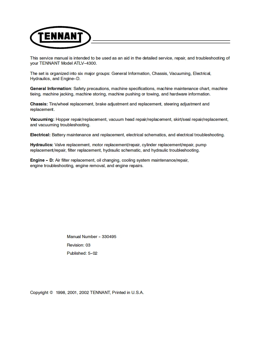 坦能清洗机洗地机tennant-atlv-4300-rider-floor-sweeper-service-manual维修手册含电器原理图找手册网昨天发布关注私信39.94MB206页037坦能清洗机洗地机tennant-atlv-4300-rider-floor-sweeper-service-manual维修手册含电器原理图此内容为付费资源,请付费后查看¥19¥21黄金会员免费钻石会员免费登录购买付费资源 第1页 / 共206页 第2页 / 共206页 第3页 / 共206页 第4页 / 共206页 第5页 / 共206页 第6页 / 共206页 第7页 / 共206页 第8页 / 共206页 第9页 / 共206页 第10页 / 共206页 试读已结束,还剩196页,您可下载完整版后进行离线阅读 THE ENDTENNANT(坦能) 文本预览 TENNANTATLVTM 4300Service Manual0330495Rev.03(5-02) 查看更多 收起部分 喜欢就支持一下吧收藏