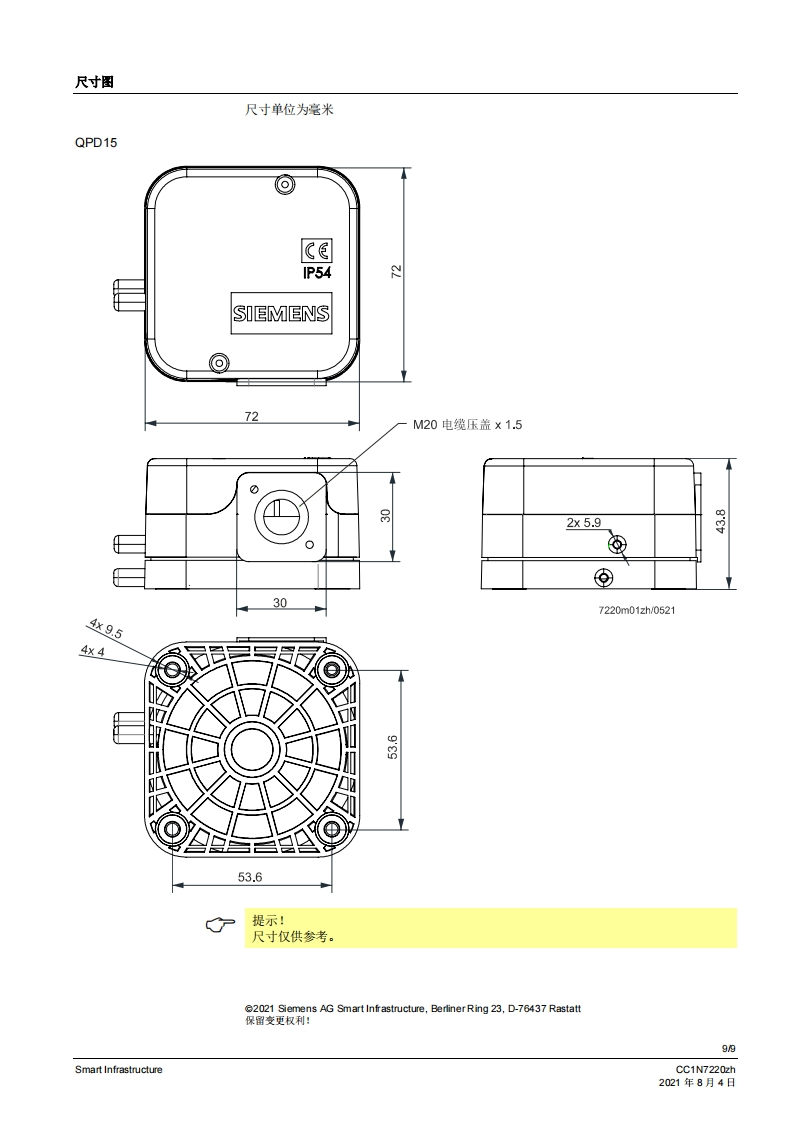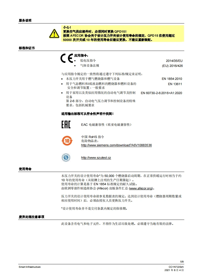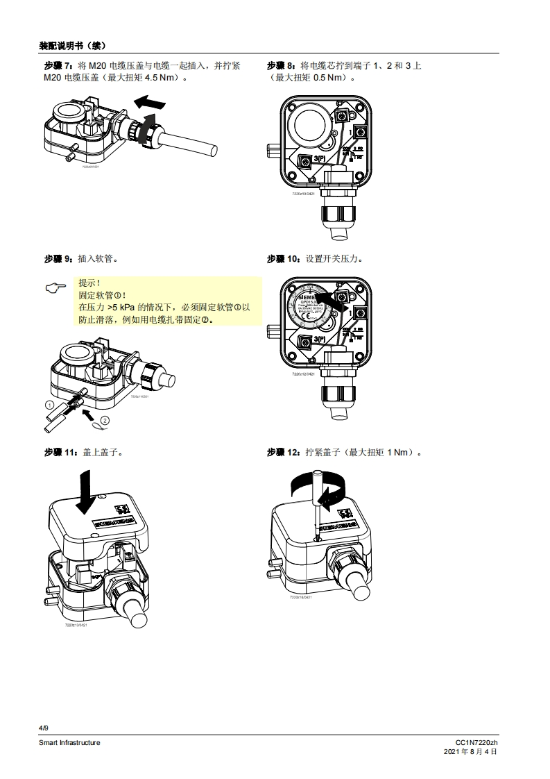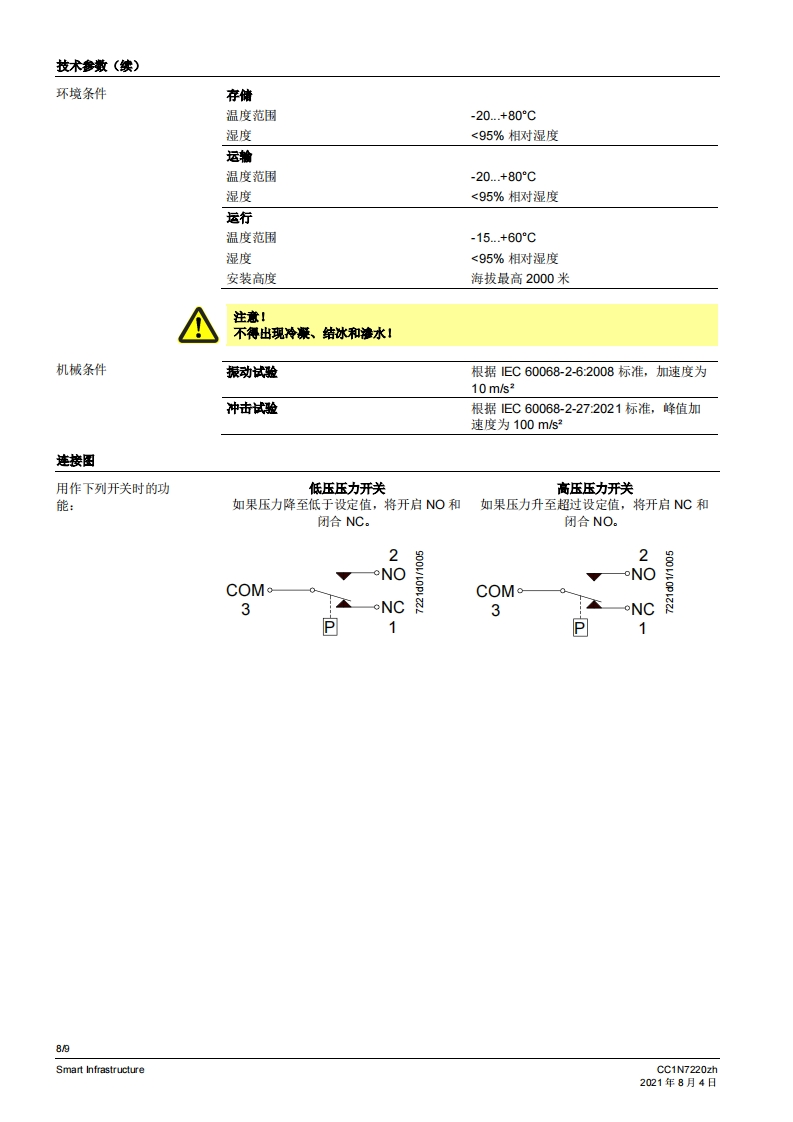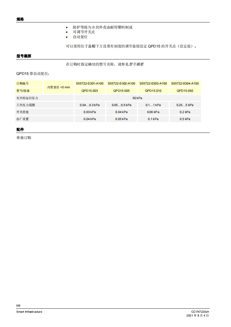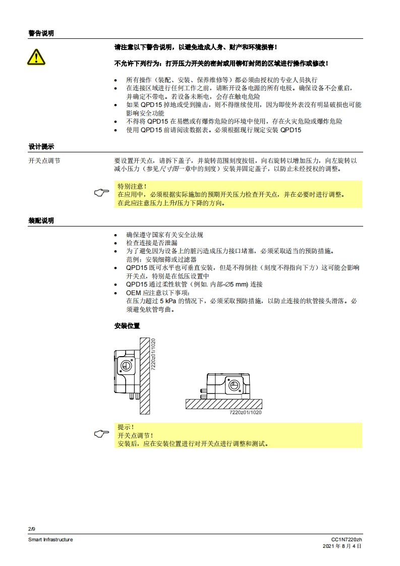 siemens西门子QPD.基础文件-中文安装操作说明书手册找手册网昨天发布关注私信0.77MB9页021siemens西门子QPD.基础文件-中文安装操作说明书手册此内容为付费资源,请付费后查看¥19¥21黄金会员免费钻石会员免费登录购买付费资源 第1页 / 共9页 第2页 / 共9页 第3页 / 共9页 第4页 / 共9页 第5页 / 共9页 第6页 / 共9页 第7页 / 共9页 第8页 / 共9页 第9页 / 共9页 已完成全部阅读,共9页 THE END西门子 文本预览 SIEMENS7220空气差压压力开关QPD15...本差压压力开关用于监测空气压力和空气流量.低于或超过设置的开关点时,中断或转换连接的电略。QPD15以及本资料专供在其设备中集成使用QPD15的原始设备制造商(OEM)使用!应用用于监测燃油油耗设备或燃气气耗设备(燃烧器、锅炉、熔炉)的气压或空气流量QPD15适用于绝对压力或差压可调节的工作压力范围高达5kPa(取决于压力范围)适用于高达50kPa的长期性运作压力·适用于空气CC1N7220zhSmart Infrastructure2021年8月4日 查看更多 收起部分 喜欢就支持一下吧收藏