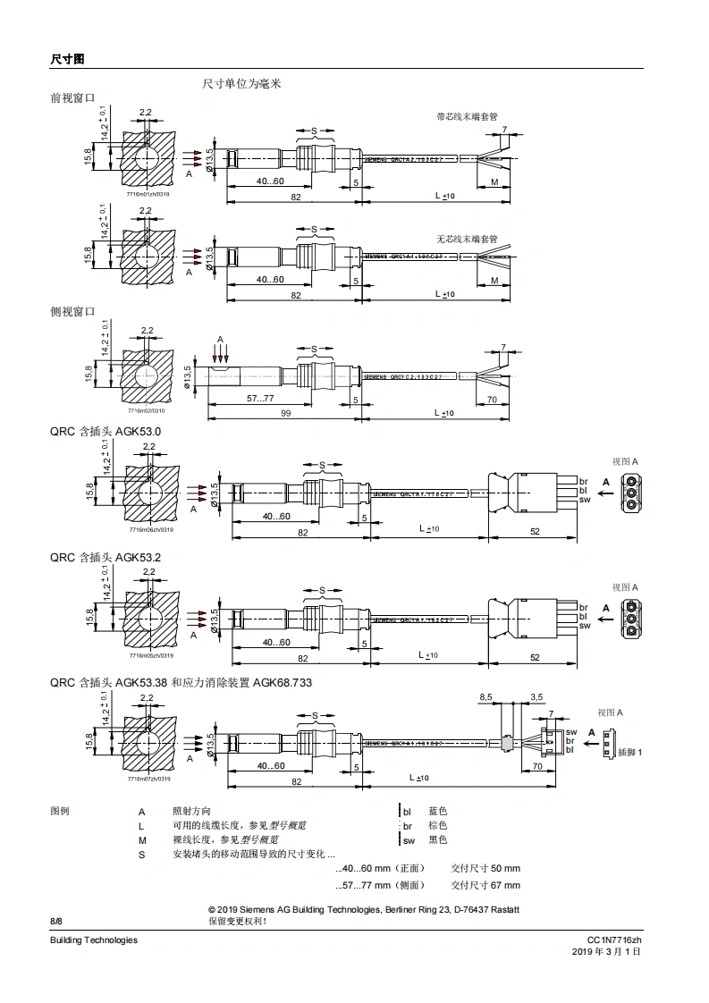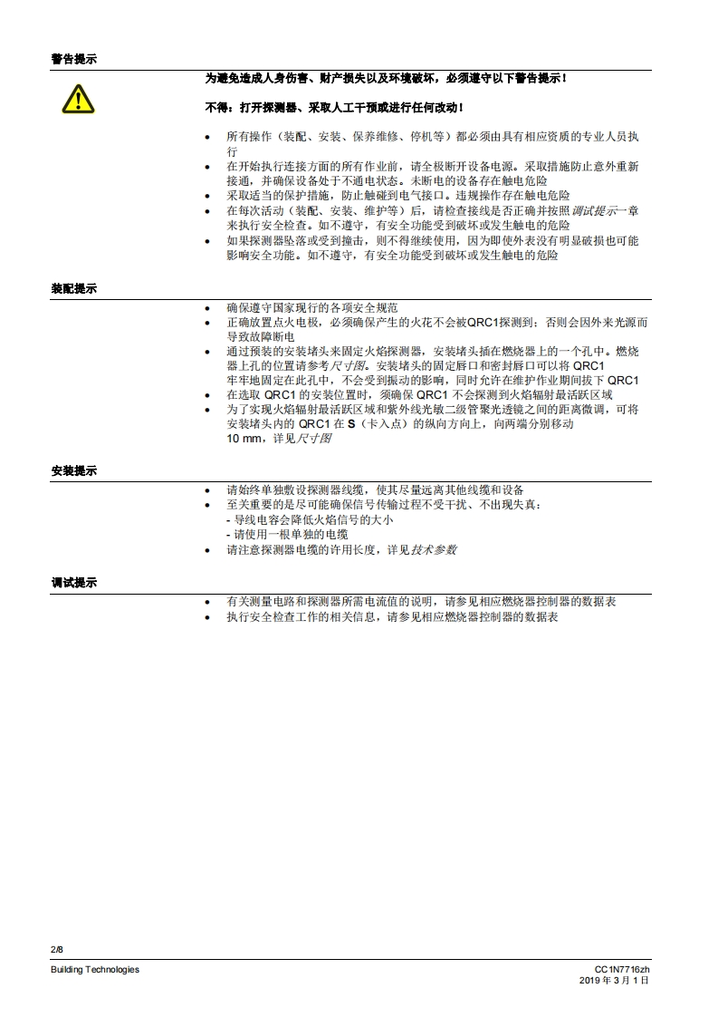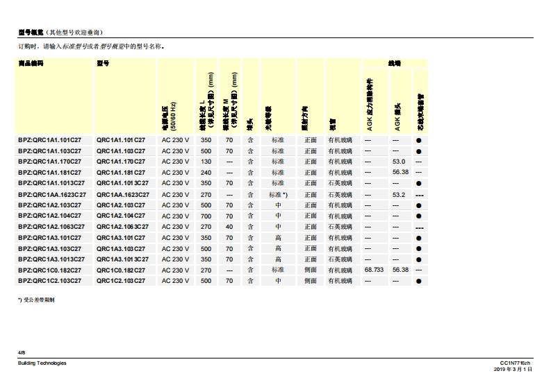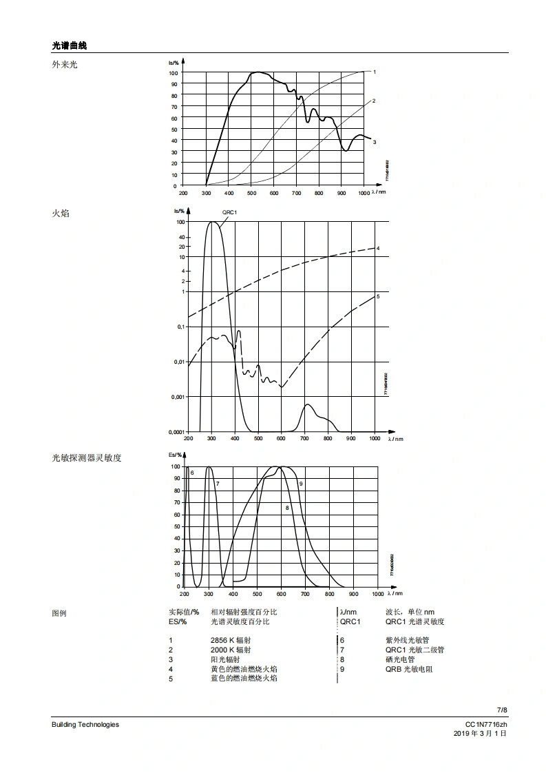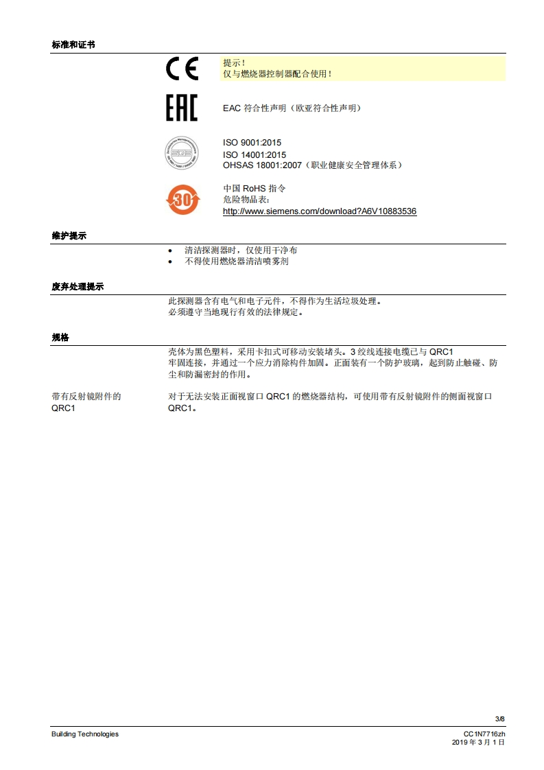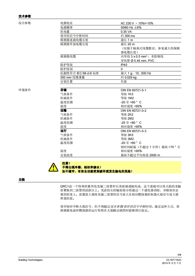 SIEMENS7716带前视窗口的QRC1带侧视窗口的QRC1蓝焰探测器QRC1...蓝焰探测器用于监测燃油或燃气燃烧时产生的蓝色和黄色的火焰。蓝焰探测器主要是在小型燃烧器处于间欧运行方式下与燃烧器控制器配合使用。QRC1以及本数据表专供那些产品中内置或连接了QRC1的原始设备制造商(OEM使用1应用QRC1是一种利用紫外线光敏技术的紧凑型火焰探测器,集成有前置放大器。设计款式分别有前视窗口和侧视窗口(90°)型。QRC1适用于下列燃烧器控制器,并且与配有安装堵头的QRB1型光敏电阻传感器插接兼容:燃烧器控制器数据表LAL1N7153LGB3N7435LME23N7101LME73N7105LMO14、LMO24、LMO44N7130LMO54N7137LMO64N7138LMV26N7547LMV27N7541LMV36N7544LMV37N7546LOA2(除LOA25之外)、LOA3N7118QRC1的最大光谱灵敏度约为300m,因此可完美覆盖燃油火焰和燃气火焰燃烧时发出的最大紫外线辐射范围。由于QC1也能感测到其他光源辐射光谱中的紫外线部分(如供暖机房、阳光等),因此仍需一如既往地遵守有关外来光源防护措施方面的常规规定。QRC1不允许探测到点火火花发出的紫外线,否则会在预通气期间由于外来光源而导致故障断电。CC1N7716zhBuilding Technologies2019年3月1日