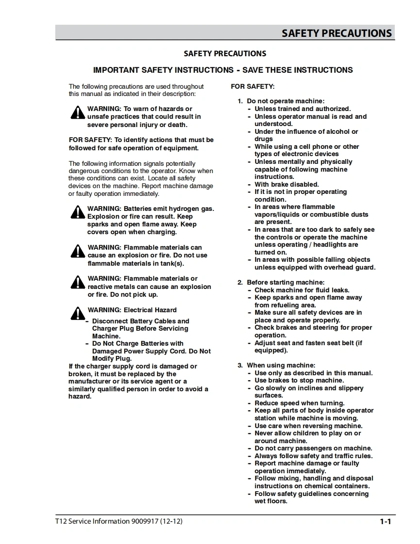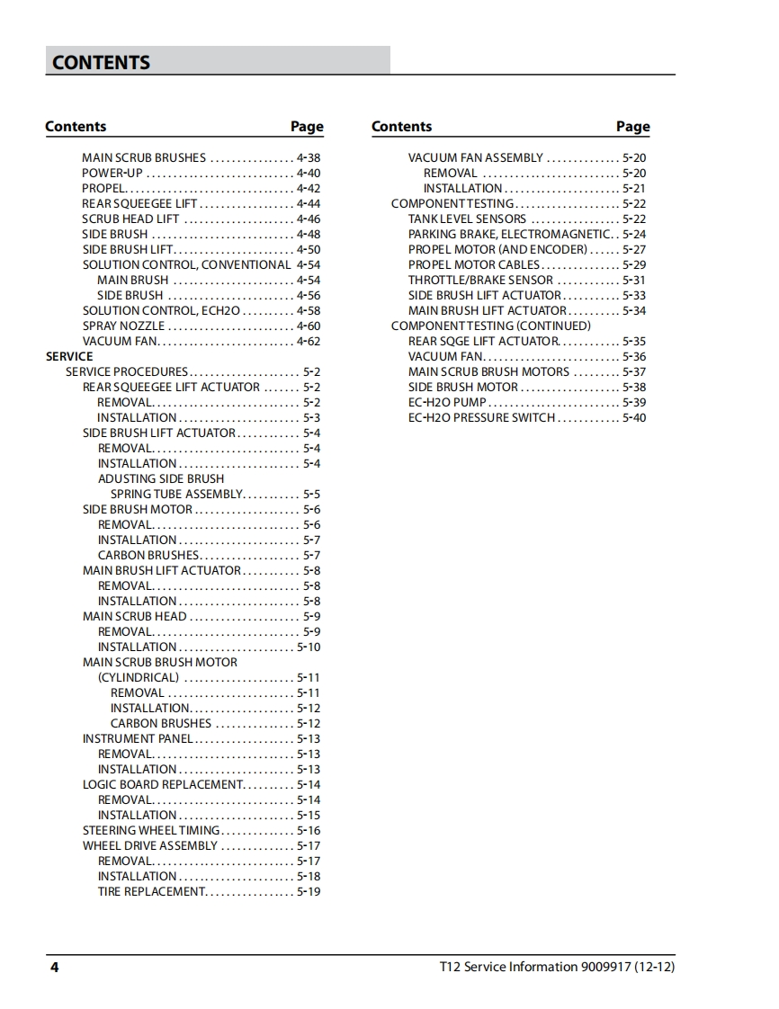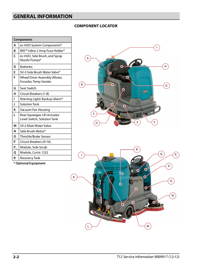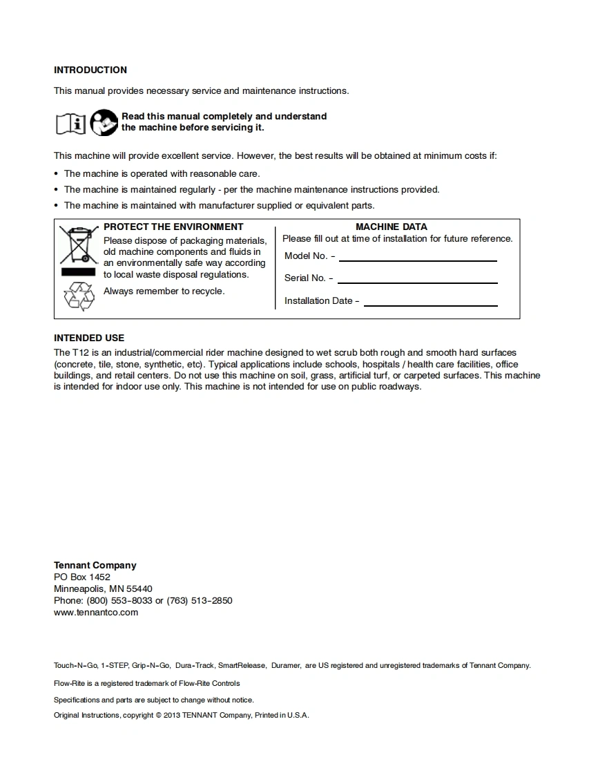 TENNANTT12(Battery)Rider ScrubberService Information ManualThe Safe Scrubbing AlternativeTennantTrue PartsIRIST a Tennant TechnologyH2OAn ORBIOTechnologyNorth America/International9009917To view,print or downloadRev.00(12-2012)the latest parts or operator'smanual,visit:mwmwww.tennantco.com/manuals
