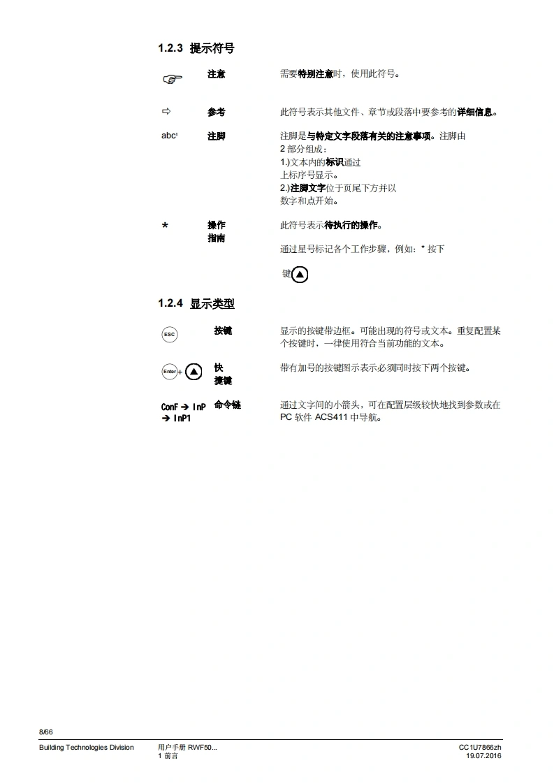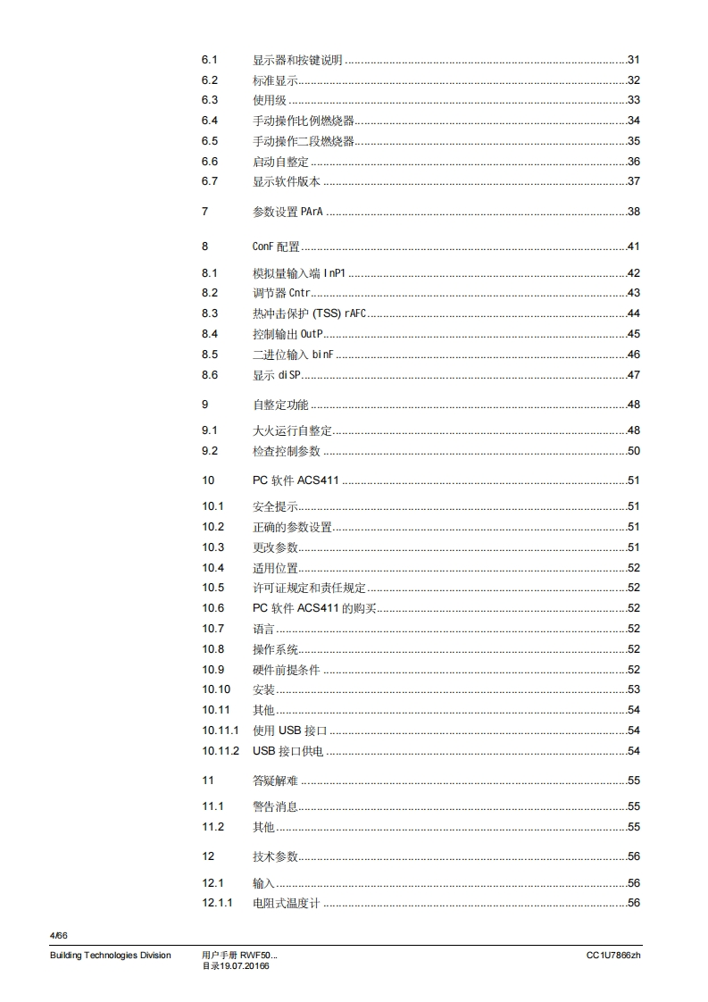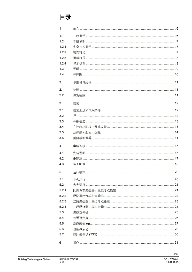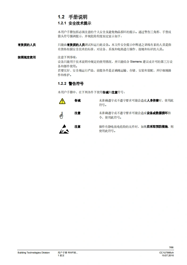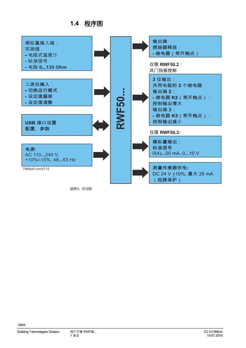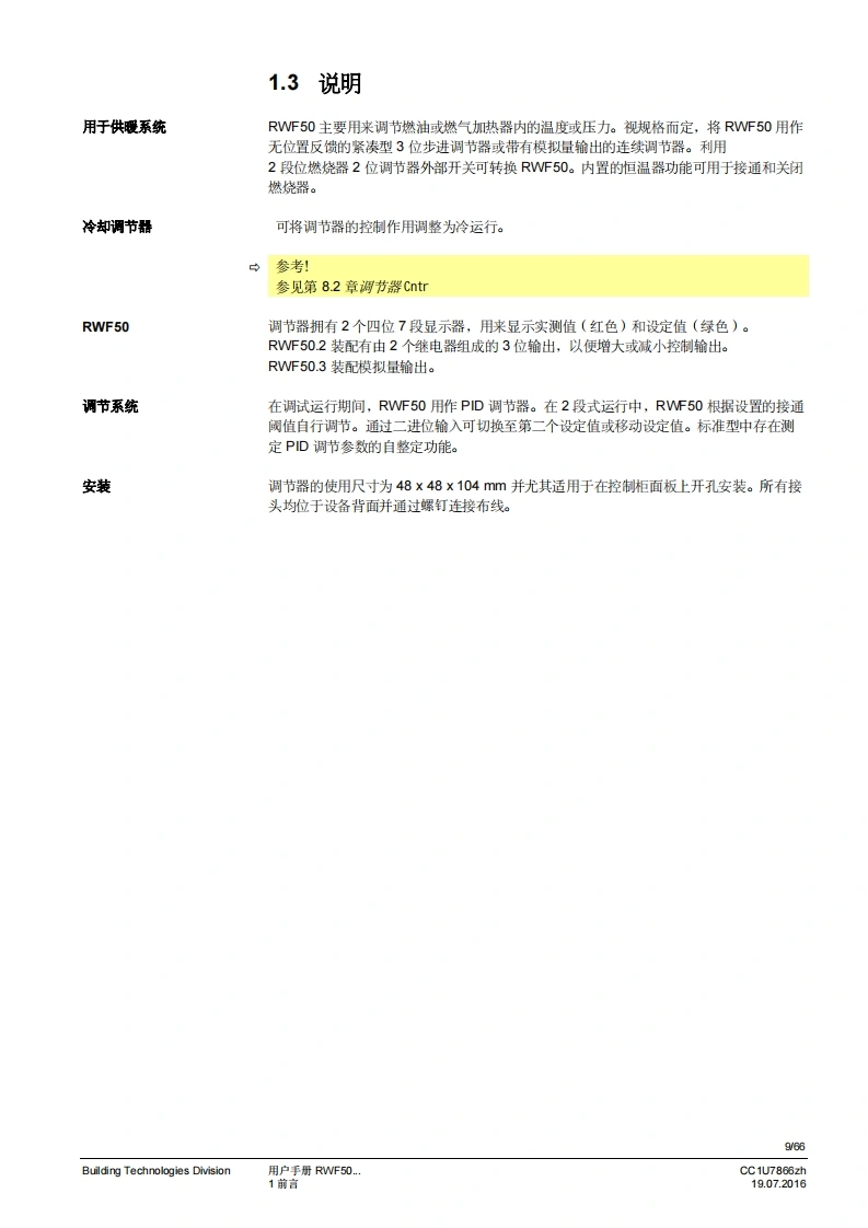 SIEMENSSIEMENS62.5RWF50.2RWF50.2和RWF50.3比例调节仪用于比调或多段燃烧器和空调系统的温度/压力优化控制用户手册RWF50.2IRWF50.3调节器以及本用户手册专供在其产品中使用RWF50.2或RWF50.3的原始设备制造商(OEM)使用!告诚RWF50数据表N7866中给出的所有安全、警告和技术信息也显示在本文件中。CC1U7866zhBuilding Technologies Division19.07.2016