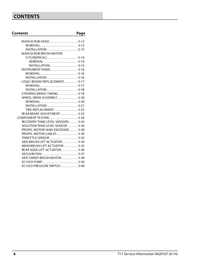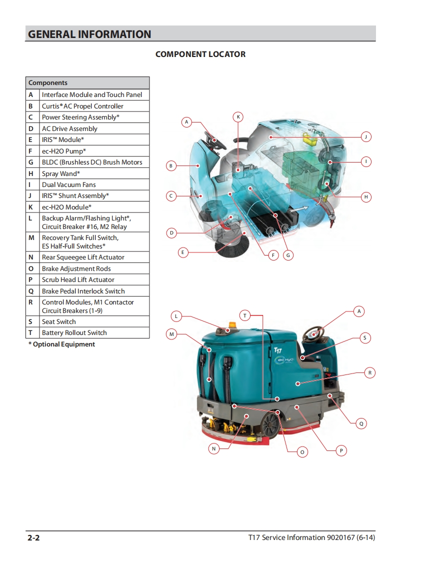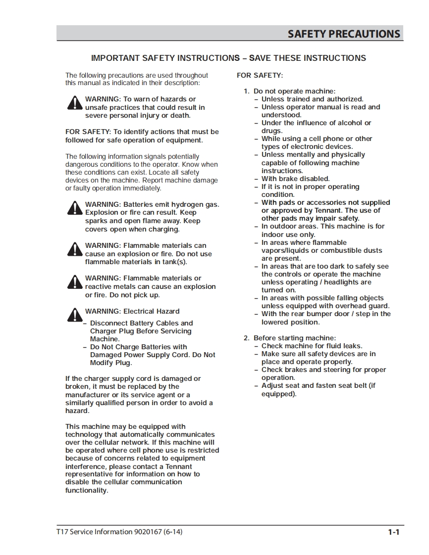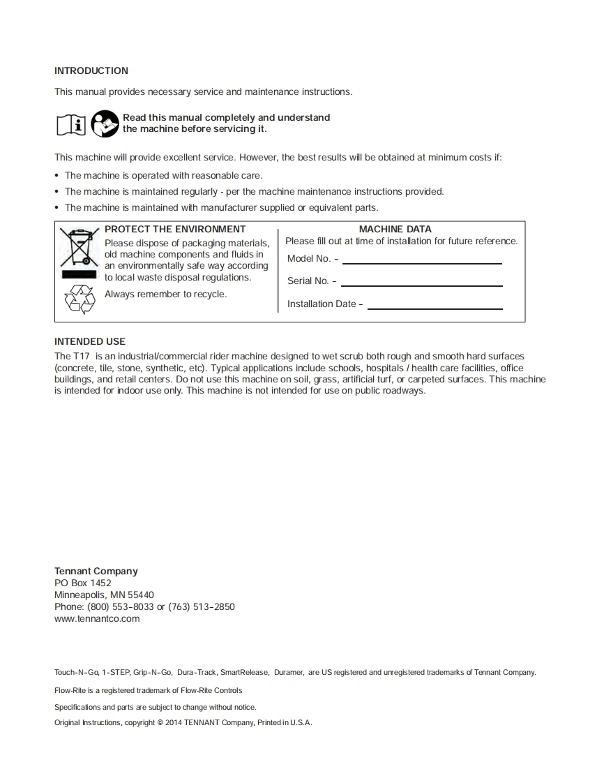 TENNANTT17(Battery)Rider ScrubberService Information ManualThe Safe Scrubbing AlternativeTennantTrue®PartsIRIST a Tennant TechnologyH2OAn ORBIO TechnologyNorth America International9020167To view.print or downloadRev.00(6-2014)the latest parts or operator'smanual,visit:www.tennantco.com/manuals