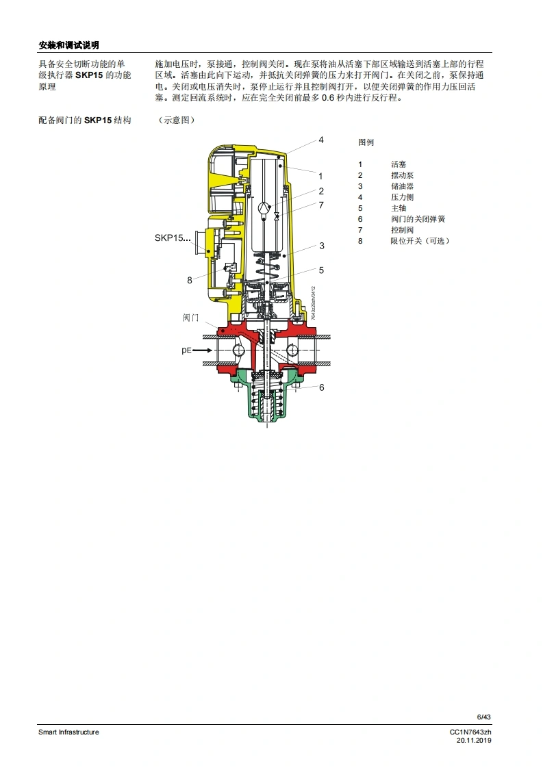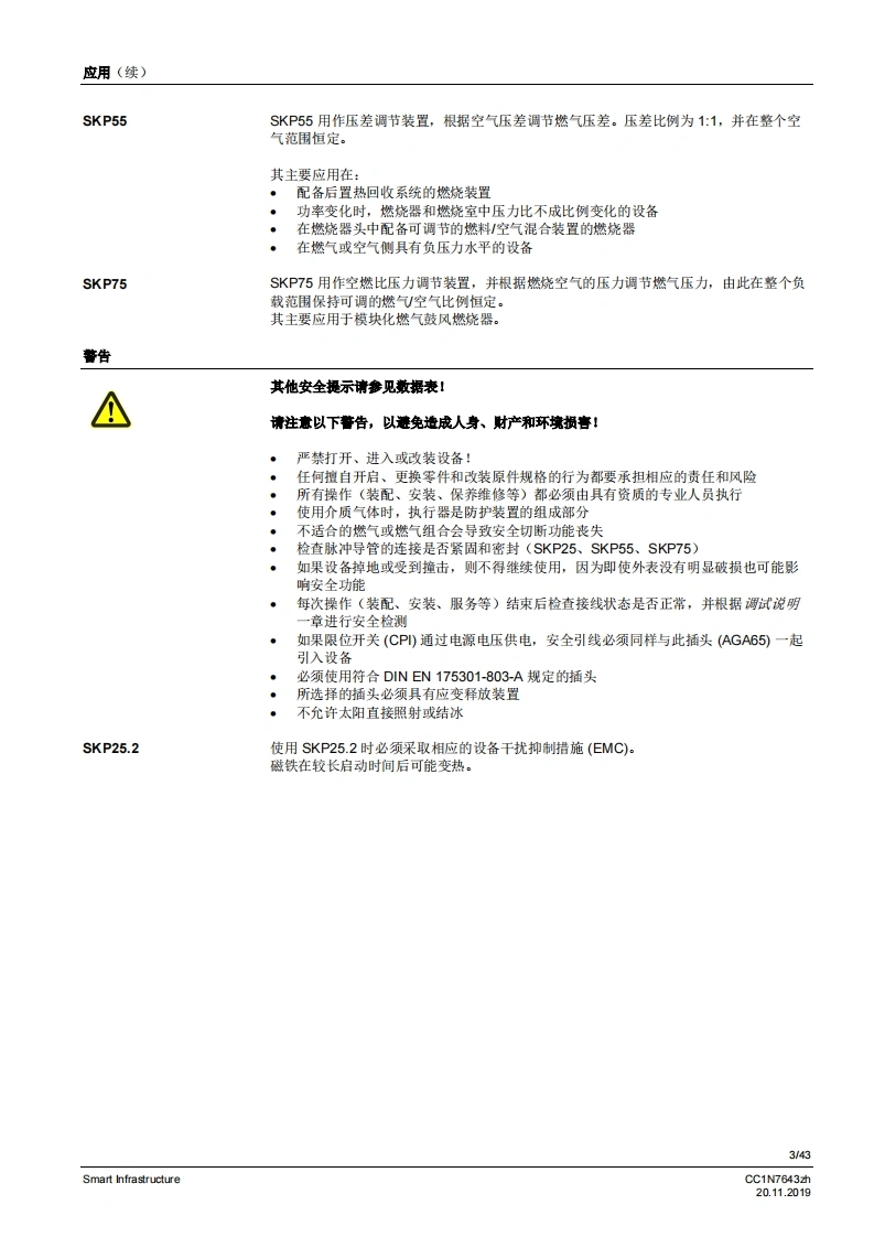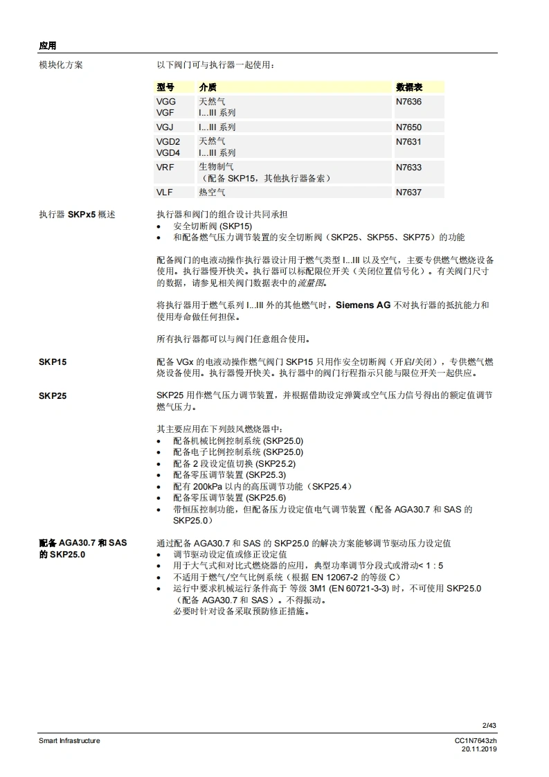 SIEMENS6437开启关闭开启关闭开启关闭开启关闭配备恒压调节装置配备压差调节装置配备空燃比压力调节装置SKP15SKP25SKP55SKP75用于燃气阀的执行器SKPx5符合EN161标准的安全截止阀,可与Siemens AG的阀门连接以起到开启/关闭作用慢开快关电流消耗极小适用于1.…l的气体可选择配备/未配备限位开关(工厂设量)插头连接运行状态显示阀门行程指示阀门的补充数据表,请参见《应用》美国型号各素SKPx5以及本数据表专供在其产品中使用SKPx5的原始设备制造商(OEM使用,CC1N7643zhSmart Infrastructure20.112019