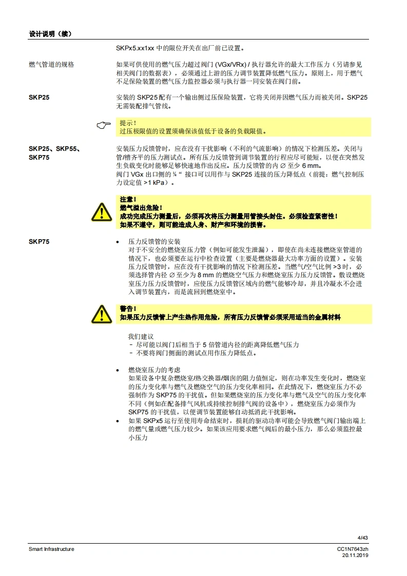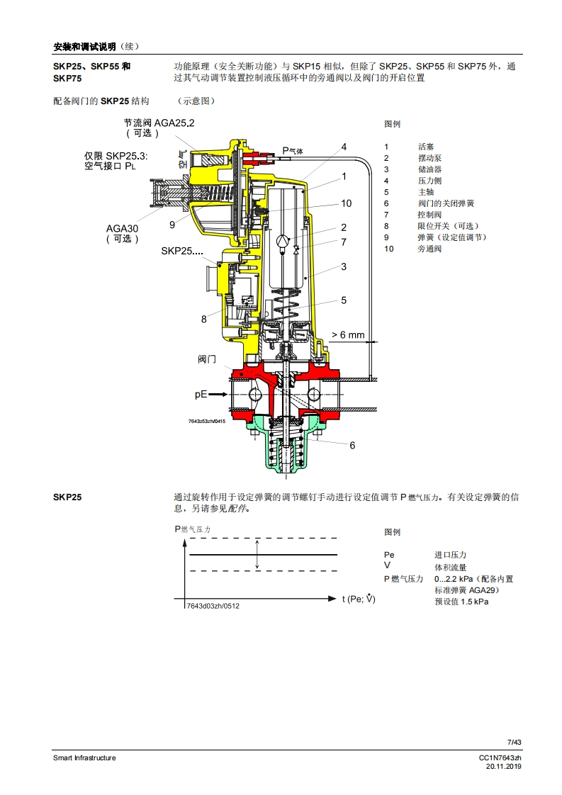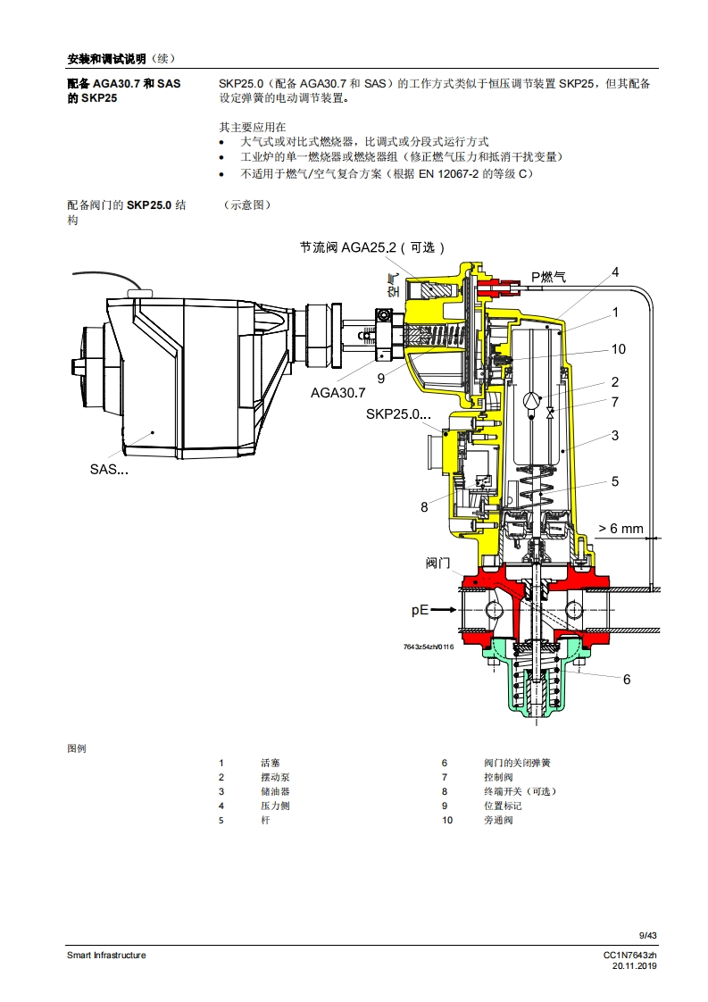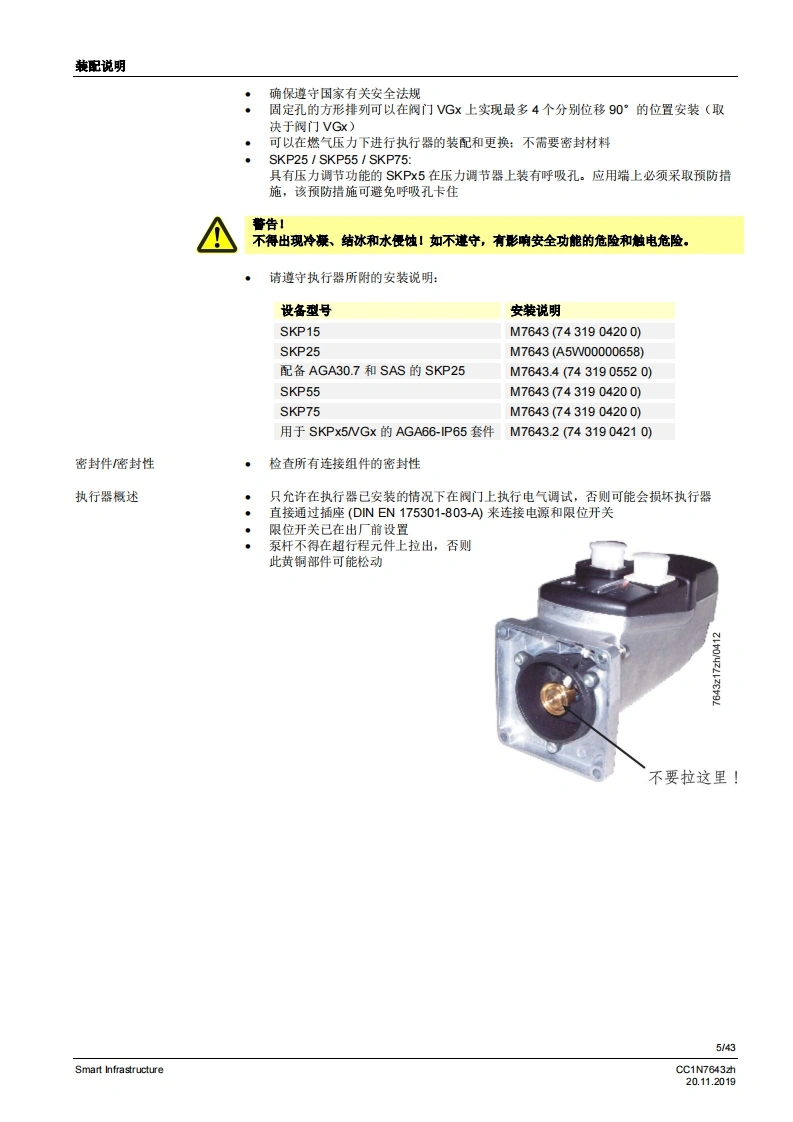 SIEMENS6437开启关闭开启关闭开启关闭开启关闭配备恒压调节装置配备压差调节装置配备空燃比压力调节装置SKP15SKP25SKP55SKP75用于燃气阀的执行器SKPx5符合EN161标准的安全截止阀,可与Siemens AG的阀门连接以起到开启/关闭作用慢开快关电流消耗极小适用于1.…l的气体可选择配备/未配备限位开关(工厂设量)插头连接运行状态显示阀门行程指示阀门的补充数据表,请参见《应用》美国型号各素SKPx5以及本数据表专供在其产品中使用SKPx5的原始设备制造商(OEM使用,CC1N7643zhSmart Infrastructure20.112019