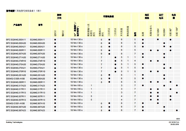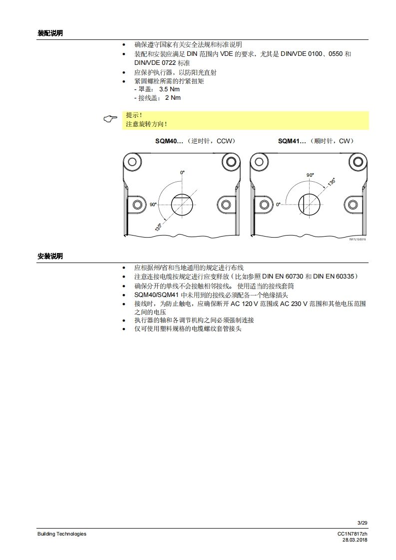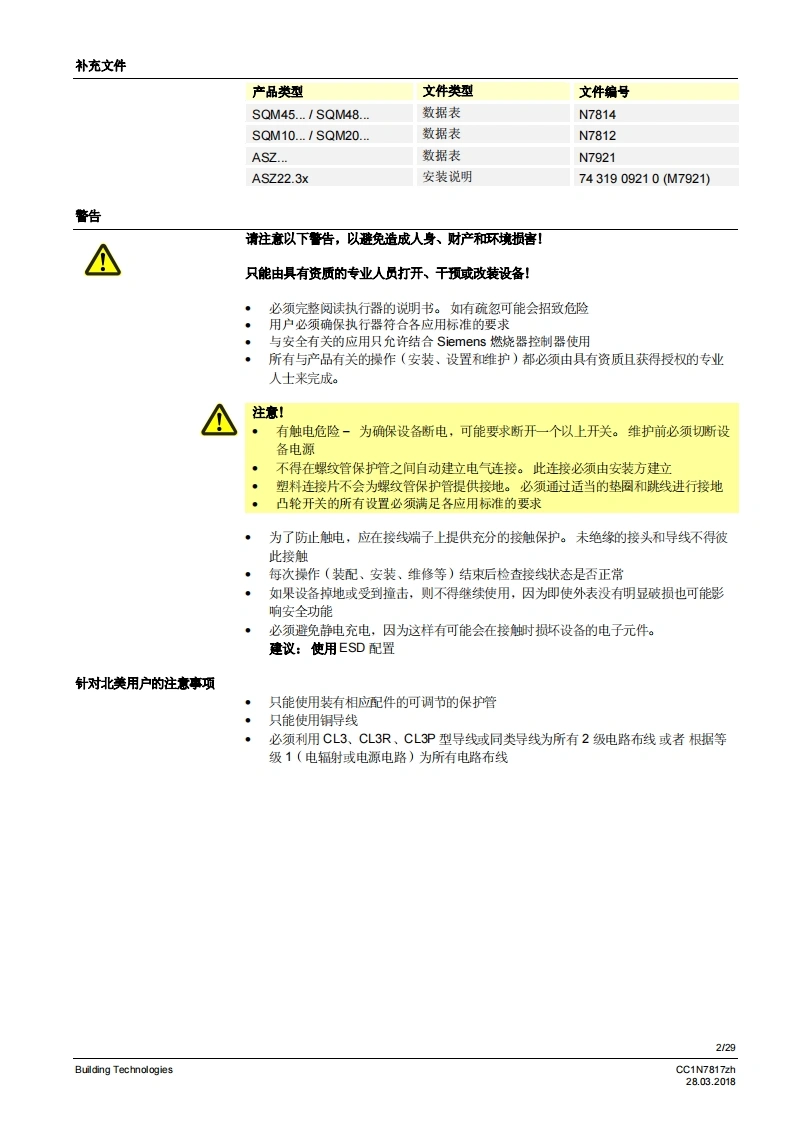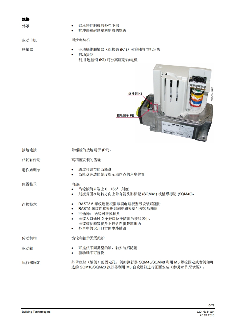 SIEMENS7817执行器SQM40/SQM41燃气及空气阀执行器SQM40...SQM41...电动执行器扭矩高达18Nm顺时针和逆时针转运行时间5至65秒不同类型的连接轴可选模拟量输入系统配有模拟量控制输入端内部位置指示驱动轴可以脱离带有UL认证、CSA认证和GL船级社认证的型号SQM40/SQM41以及本数据表专供在产品中使用SQM40/SQM41的原始设备制造商(OEM使用!应用执行器SQM40/SQM41专为驱动油压调节器、蝶阀、风门或者其他需要转动的应用情况而设计。适用领域主要是大中型功率燃油和燃气燃烧器以及热工艺设备。这款执行器主要用于根据负荷控制燃气流量、燃油及燃烧空气量:·结合3位浮点调节器或连续调节器(如4~20mA)和/域…·…直接通过燃烧器控制器操作CC1N7817zhBuilding Technologies28.03.2018