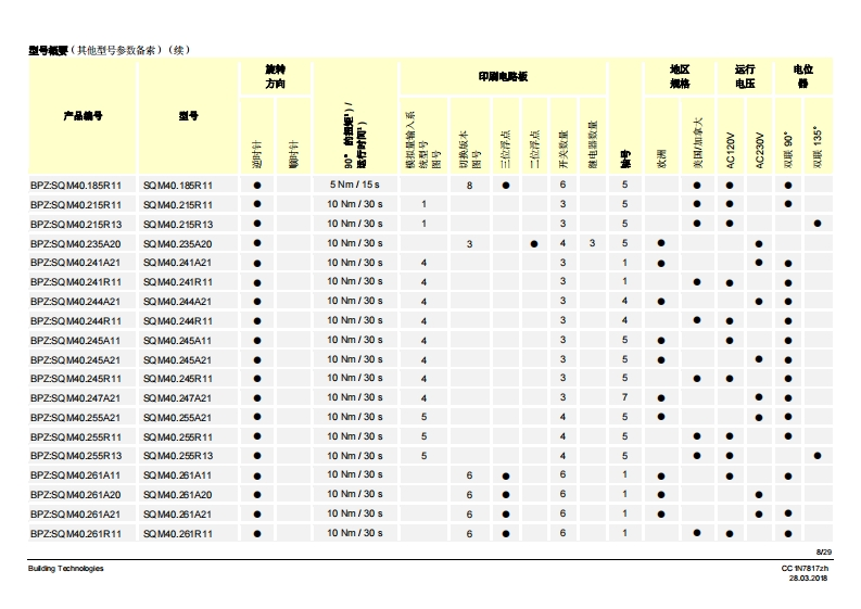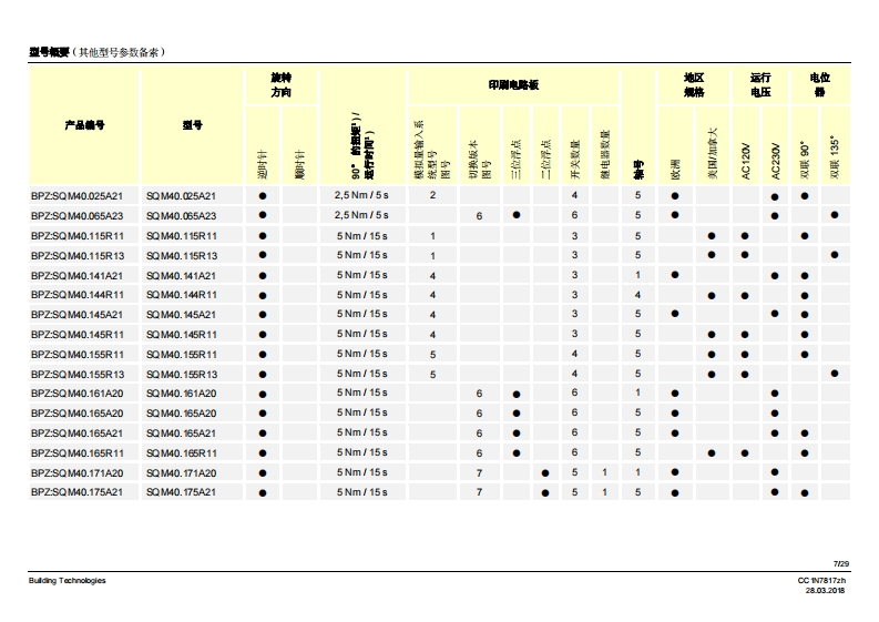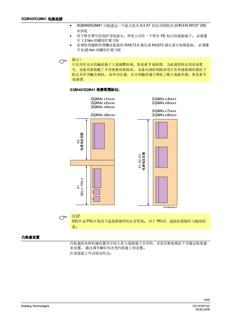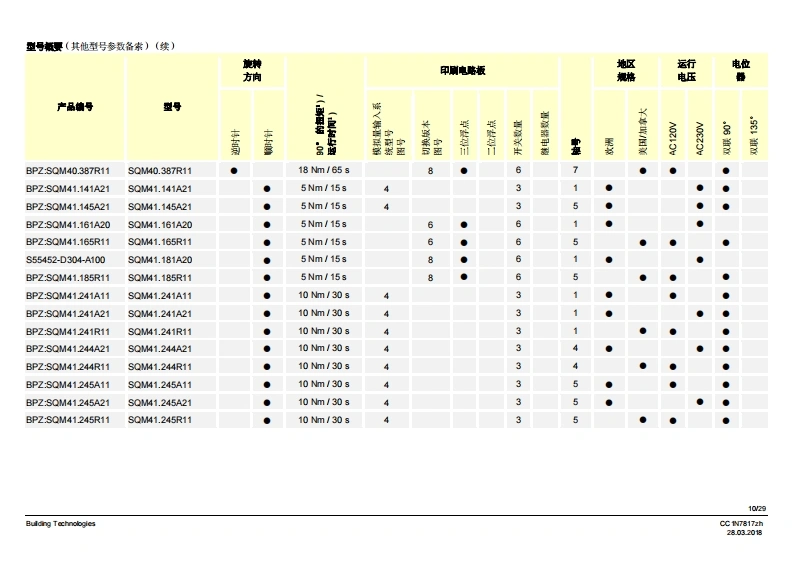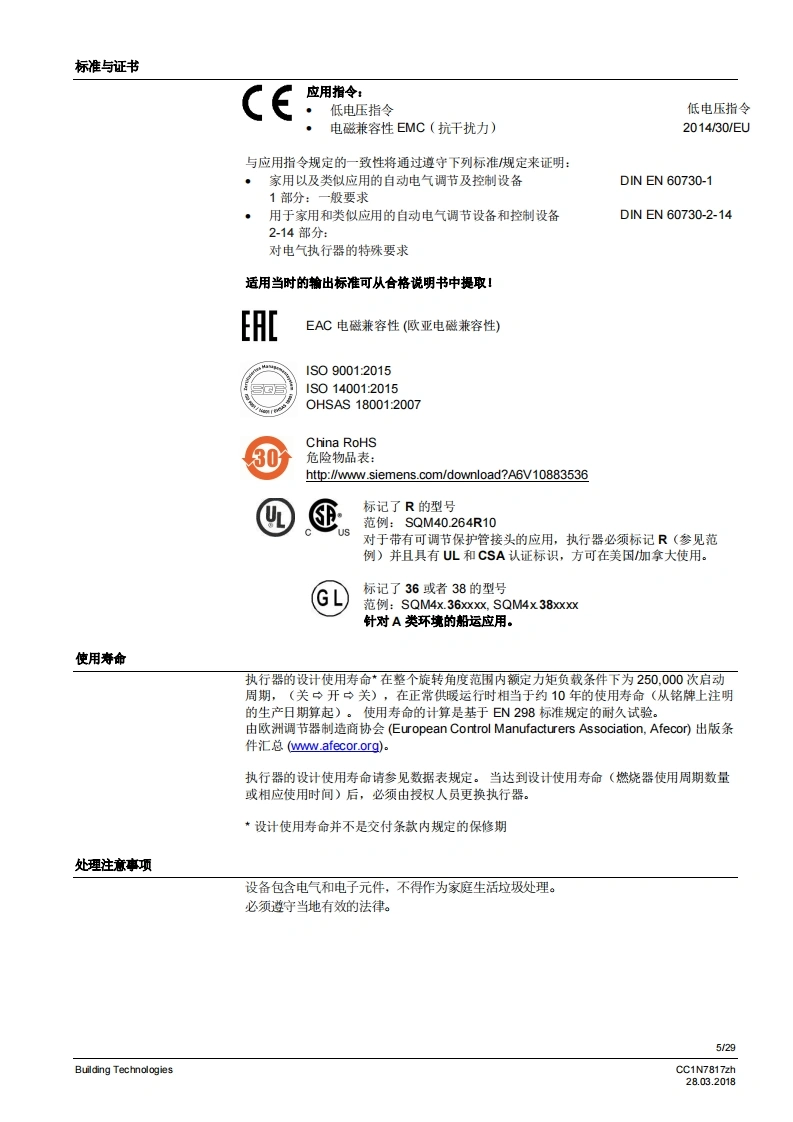 SIEMENS7817执行器SQM40/SQM41燃气及空气阀执行器SQM40...SQM41...电动执行器扭矩高达18Nm顺时针和逆时针转运行时间5至65秒不同类型的连接轴可选模拟量输入系统配有模拟量控制输入端内部位置指示驱动轴可以脱离带有UL认证、CSA认证和GL船级社认证的型号SQM40/SQM41以及本数据表专供在产品中使用SQM40/SQM41的原始设备制造商(OEM使用!应用执行器SQM40/SQM41专为驱动油压调节器、蝶阀、风门或者其他需要转动的应用情况而设计。适用领域主要是大中型功率燃油和燃气燃烧器以及热工艺设备。这款执行器主要用于根据负荷控制燃气流量、燃油及燃烧空气量:·结合3位浮点调节器或连续调节器(如4~20mA)和/域…·…直接通过燃烧器控制器操作CC1N7817zhBuilding Technologies28.03.2018