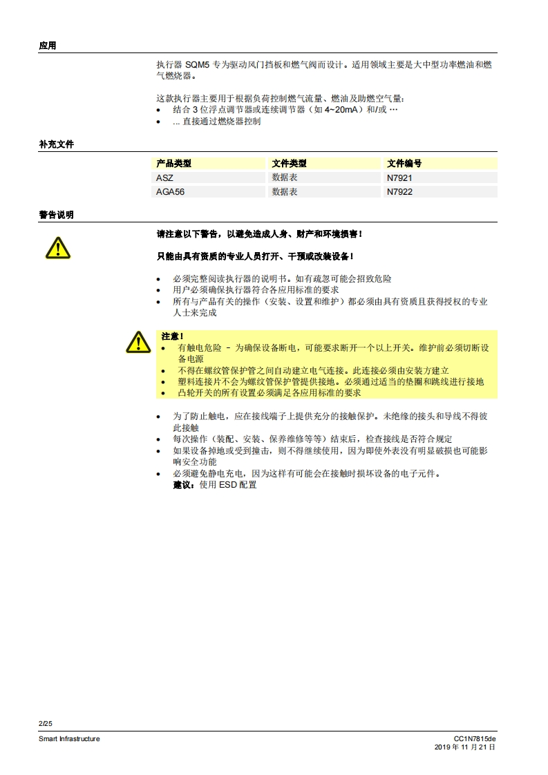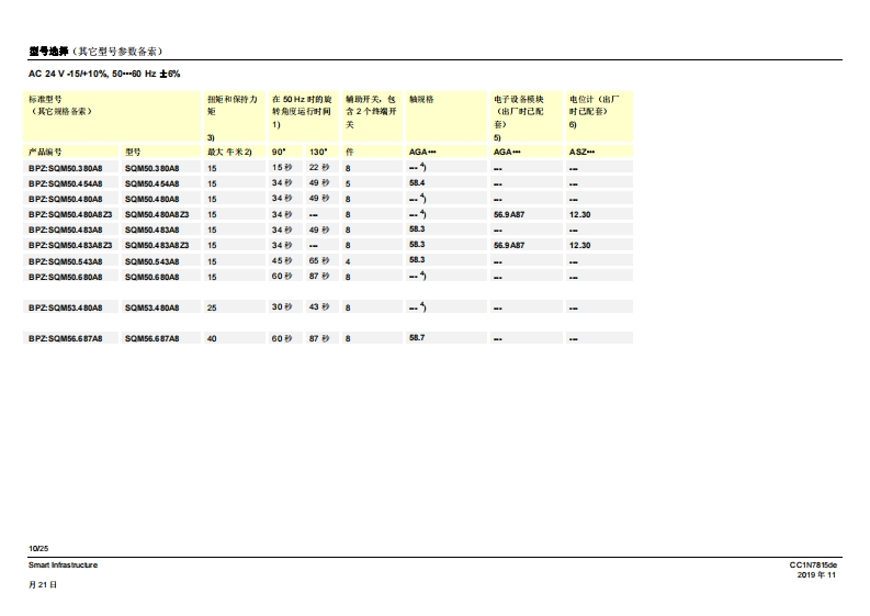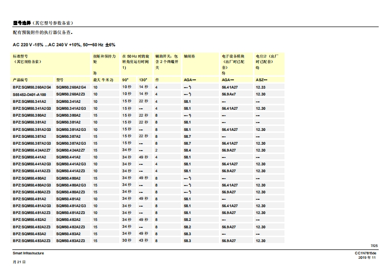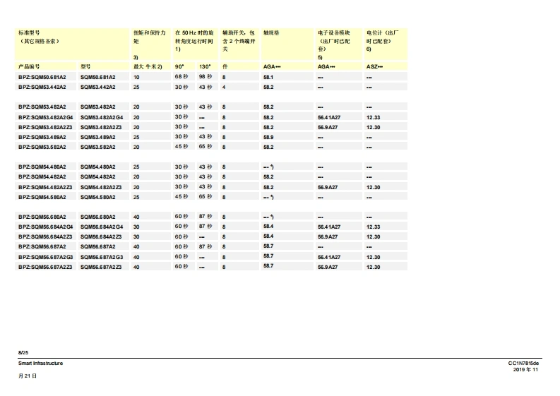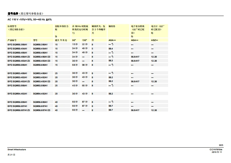SIEMENS7815SQM5传动机构侧配有7号驱动轴SQM5背面,SQM5背面,无第二从动连接轴的规格有2个从动连接轴的规格燃气及空气阀执行器SQM5...配备电子模块电动执行器扭矩高达40牛米顺时针和逆时针转动型号运行时间从10至90秒不同类型的轴规格可选带1个或2个从动连接轴,可更换从动轴或可单独使用可利用借助连续信号进行控制和位置反馈的电子棋块进行扩展内部和外部位量指示可单独脱高从动轴和凸轮轴带有U儿认证的型号SQM5以及本教据表专供那些产品中内置或连接了SQM5的原始设备制造商(OEM)使用!CC1N7815zhSmart Infrastructure2019年11月21日