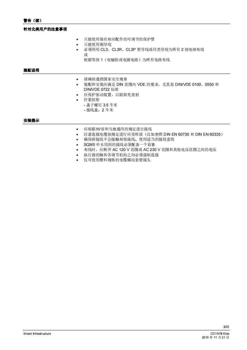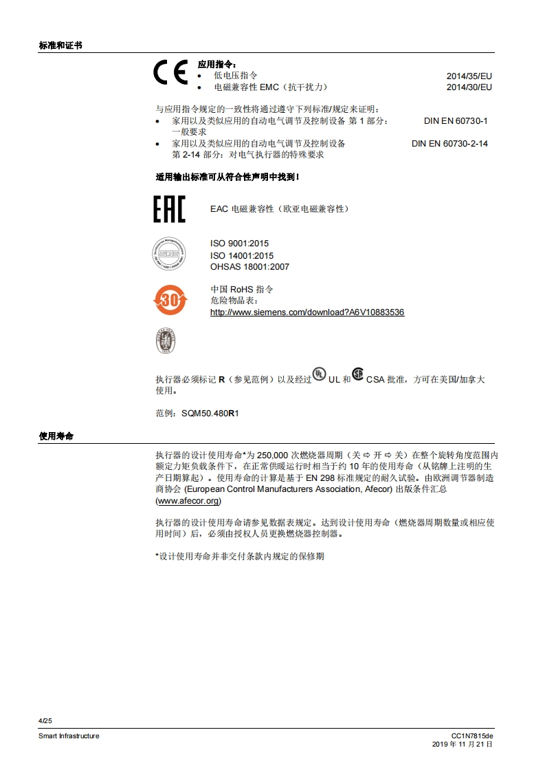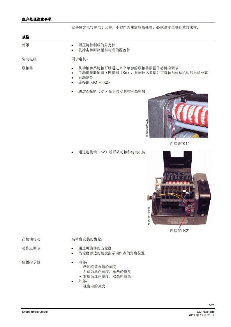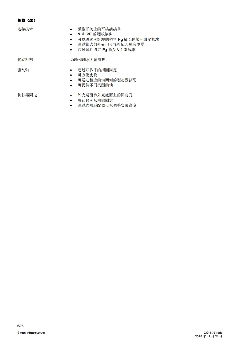 SIEMENS7815SQM5传动机构侧配有7号驱动轴SQM5背面,SQM5背面,无第二从动连接轴的规格有2个从动连接轴的规格燃气及空气阀执行器SQM5...配备电子模块电动执行器扭矩高达40牛米顺时针和逆时针转动型号运行时间从10至90秒不同类型的轴规格可选带1个或2个从动连接轴,可更换从动轴或可单独使用可利用借助连续信号进行控制和位置反馈的电子棋块进行扩展内部和外部位量指示可单独脱高从动轴和凸轮轴带有U儿认证的型号SQM5以及本教据表专供那些产品中内置或连接了SQM5的原始设备制造商(OEM)使用!CC1N7815zhSmart Infrastructure2019年11月21日