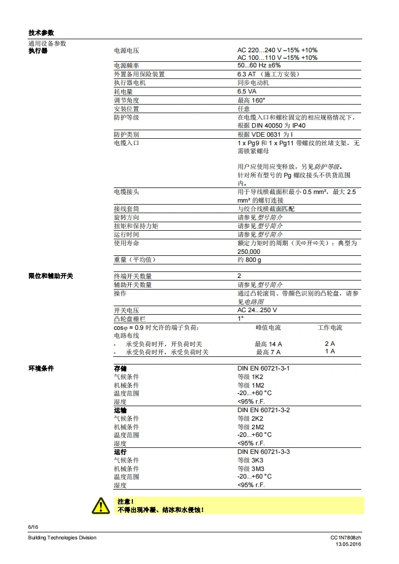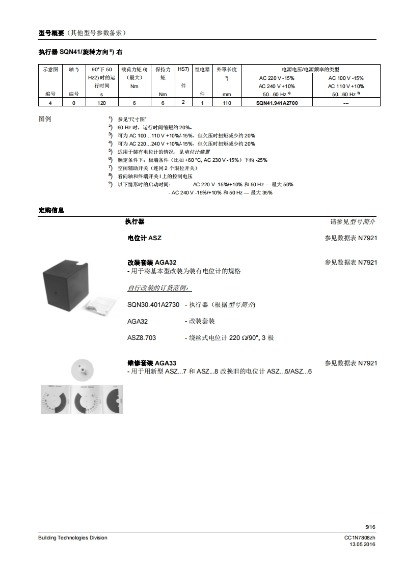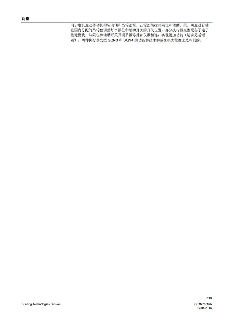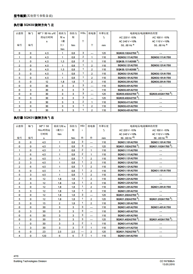 SIEMENS7808执行器SQN3...SQN4...用于中小型功率燃油或燃气燃烧器上风门挡板和燃料调节阀的电动执行器。SQN3/SQN4以及本数据表专供在产品中使用SQN3/SQN4的原始设备制造商(OEM)使用1应用/特征执行器SQN3/SQN4设计用于中小型功率燃油或燃气燃烧器上气门和风门挡板的驱动装置,以根据负荷控制燃料及燃烧空气量:与P-PI或PD调节器连接,比如RWF直接通过不同的燃烧器控制器,比如LOA,LMO,LMG,LFL与单线控制器、双线控制器或三点调节器连接·均配有抗冲击、耐热的塑料外罩、用于电气连接的螺钉接线端子可脱离、无需维护的传动机构内部和外部位置指示用于动作点调节,可轻松调节的限位和铺助开关·保持力矩:SQN30.8.3NmSQN46 Nm·运行时间:SON34.5.30sSQN4120s·旋转方向:SQN30向左旋转SQN31/SQN41向右旋转CC1N7808zhBuilding Technologies Division13.052016