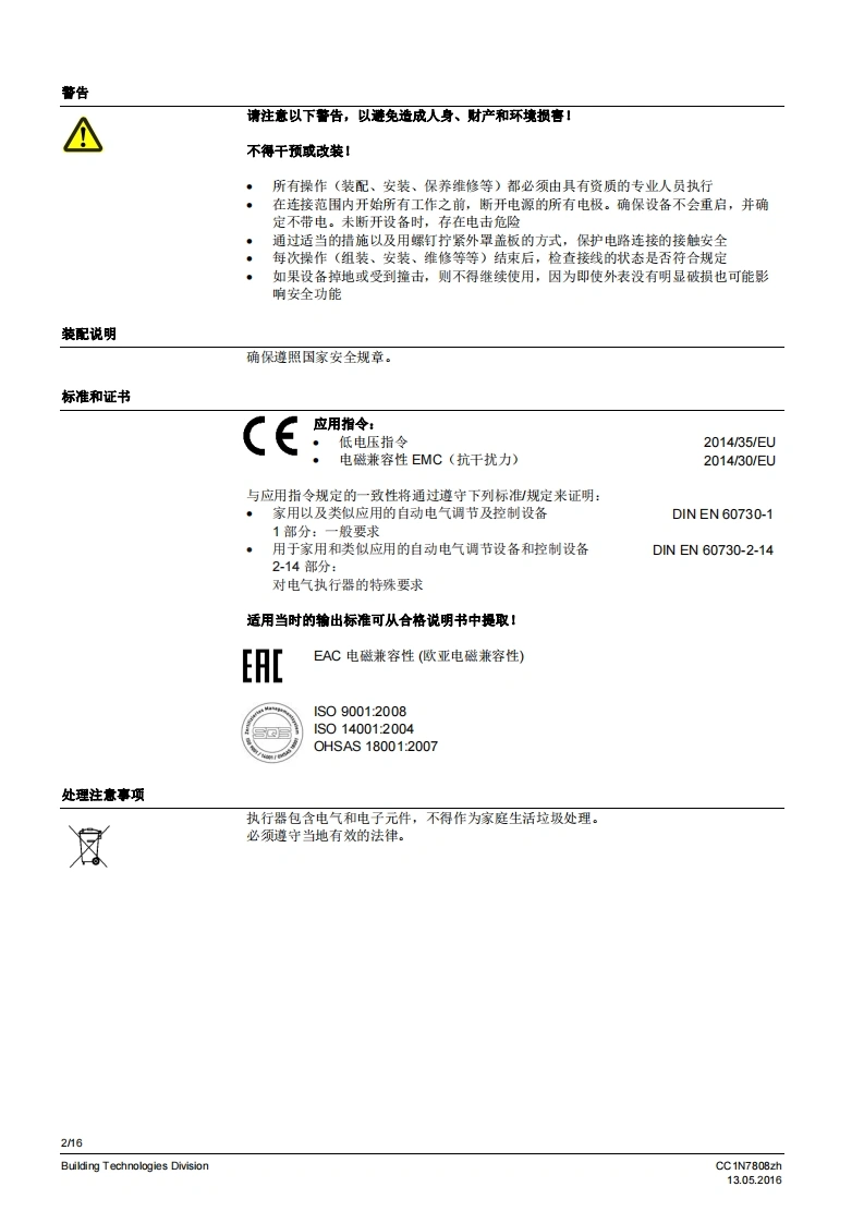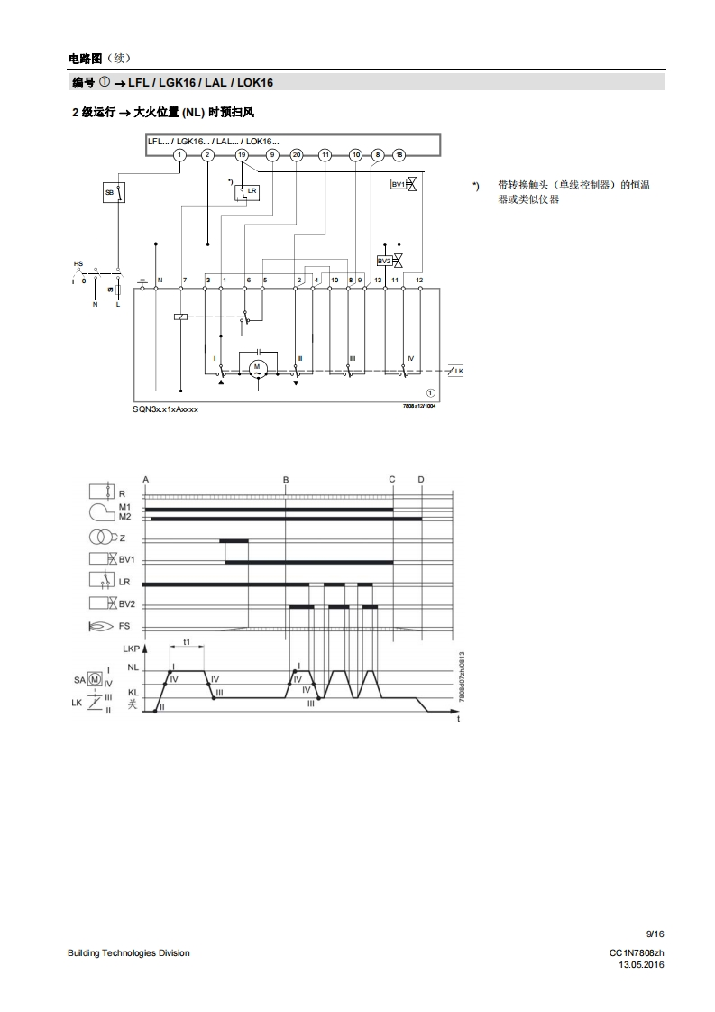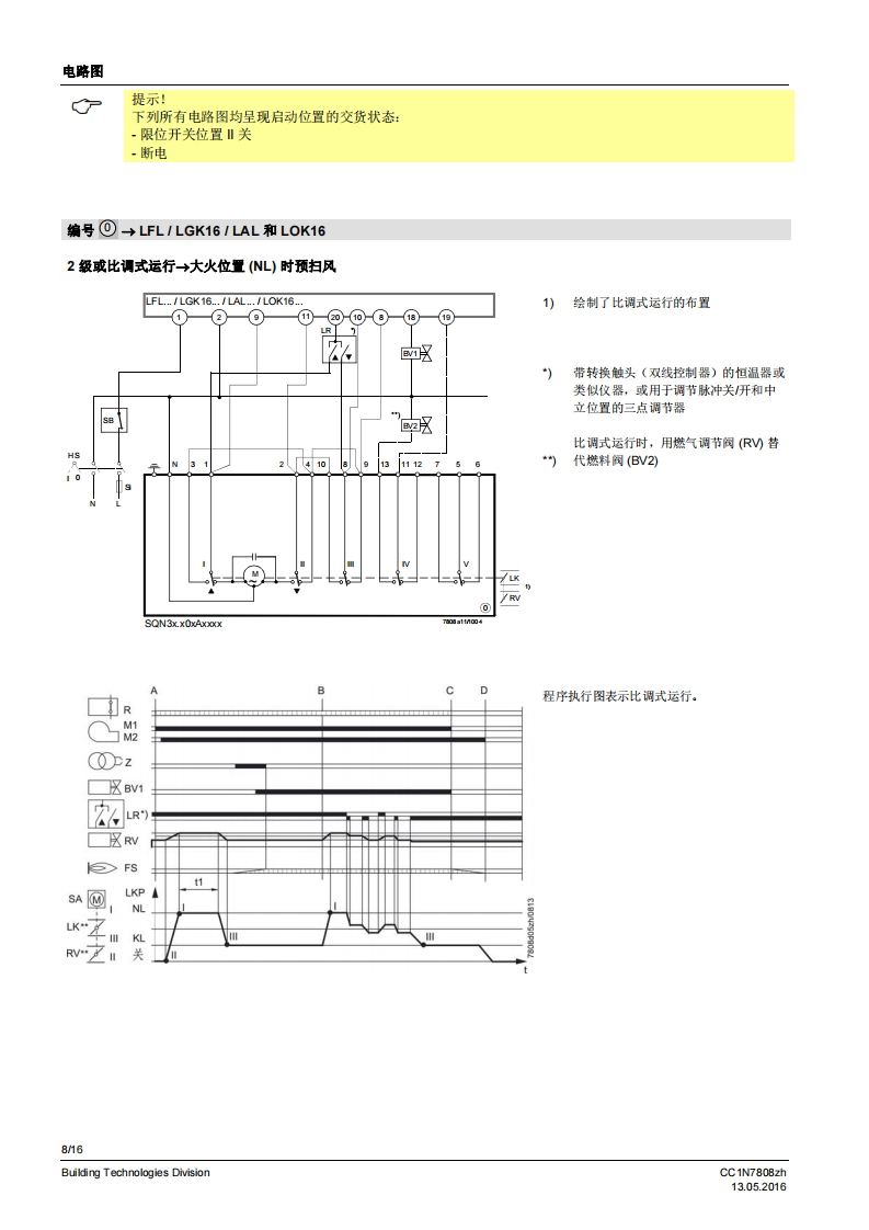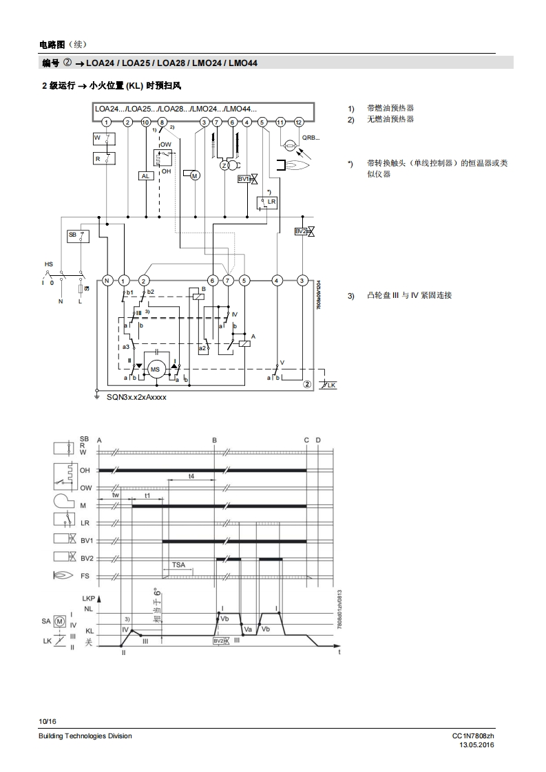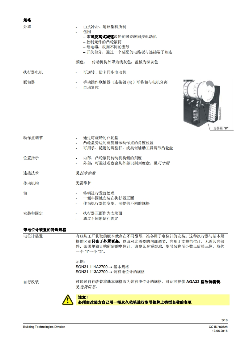 SIEMENS7808执行器SQN3...SQN4...用于中小型功率燃油或燃气燃烧器上风门挡板和燃料调节阀的电动执行器。SQN3/SQN4以及本数据表专供在产品中使用SQN3/SQN4的原始设备制造商(OEM)使用1应用/特征执行器SQN3/SQN4设计用于中小型功率燃油或燃气燃烧器上气门和风门挡板的驱动装置,以根据负荷控制燃料及燃烧空气量:与P-PI或PD调节器连接,比如RWF直接通过不同的燃烧器控制器,比如LOA,LMO,LMG,LFL与单线控制器、双线控制器或三点调节器连接·均配有抗冲击、耐热的塑料外罩、用于电气连接的螺钉接线端子可脱离、无需维护的传动机构内部和外部位置指示用于动作点调节,可轻松调节的限位和铺助开关·保持力矩:SQN30.8.3NmSQN46 Nm·运行时间:SON34.5.30sSQN4120s·旋转方向:SQN30向左旋转SQN31/SQN41向右旋转CC1N7808zhBuilding Technologies Division13.052016