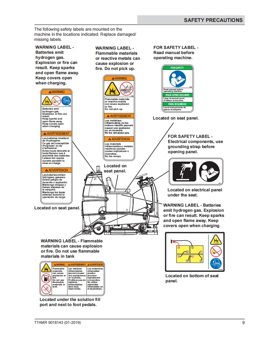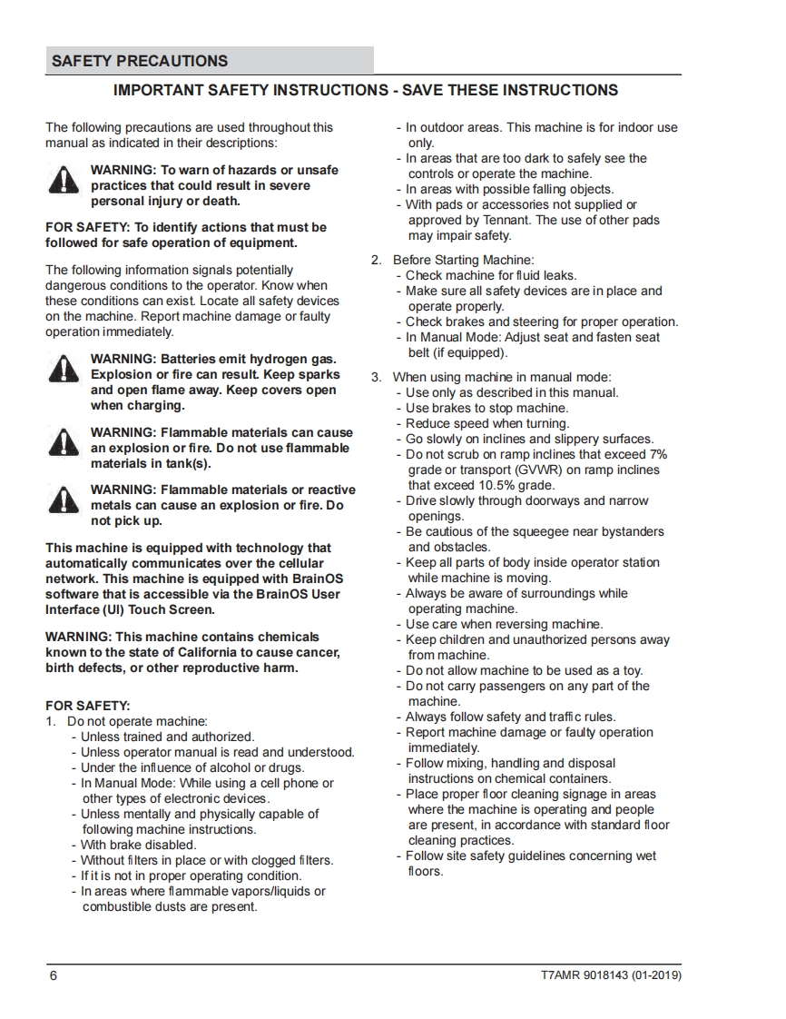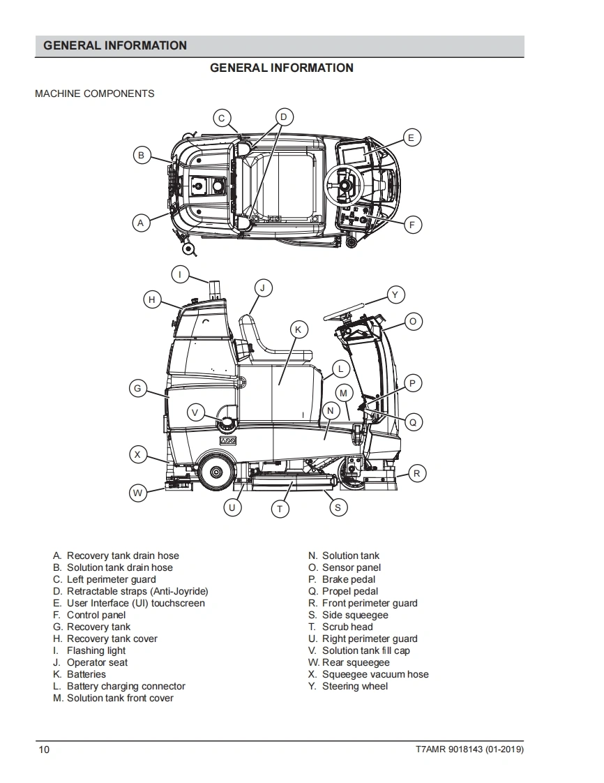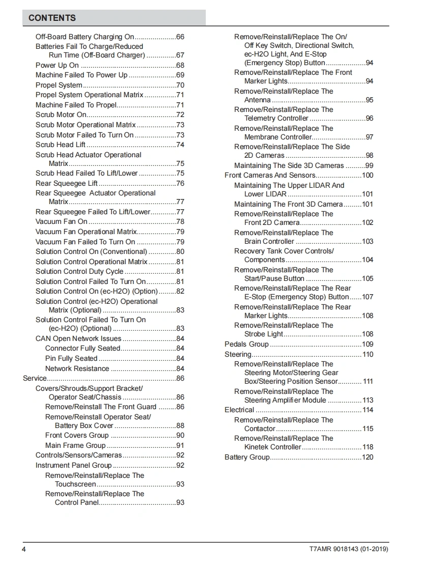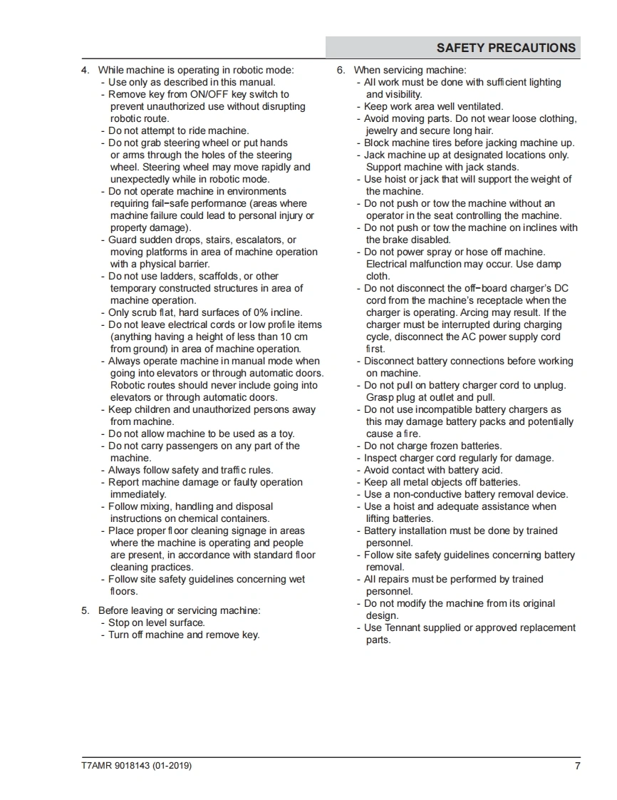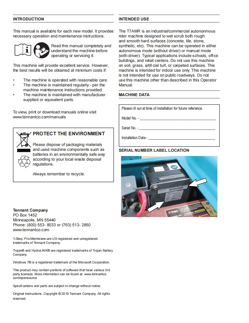 TENNANTT7AMRRider-ScrubberEnglish ENService ManualHygenic Fully Cleanable Recovery TankH2TennantTrue PartsNanoCleanATTENTION:DO NOT tip the machine onto its side to replace parts or perform anymaintenance procedures.Sensitive robotic components could be damaged or bumpedout of adjustment if the machine is tipped onto its side.ATTENTION:DO NOI remove and/or adjust the upper or lower LIDARs,any of the3D cameras,or remove/move shrouds or brackets on which these components aremounted.Due to calibration the LIDARS and 3D cameras cannot be adjusted in the field.9018143For the latest Parts Manuals and otherlanguage Operator Manuals,visit:Rev.00(01-2019)www.tennantco.com/manuals