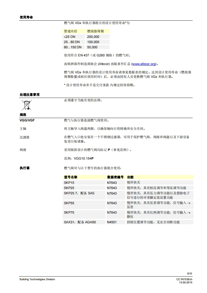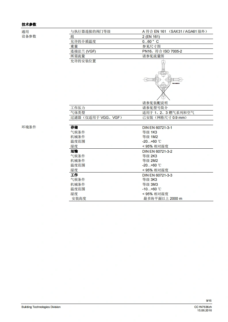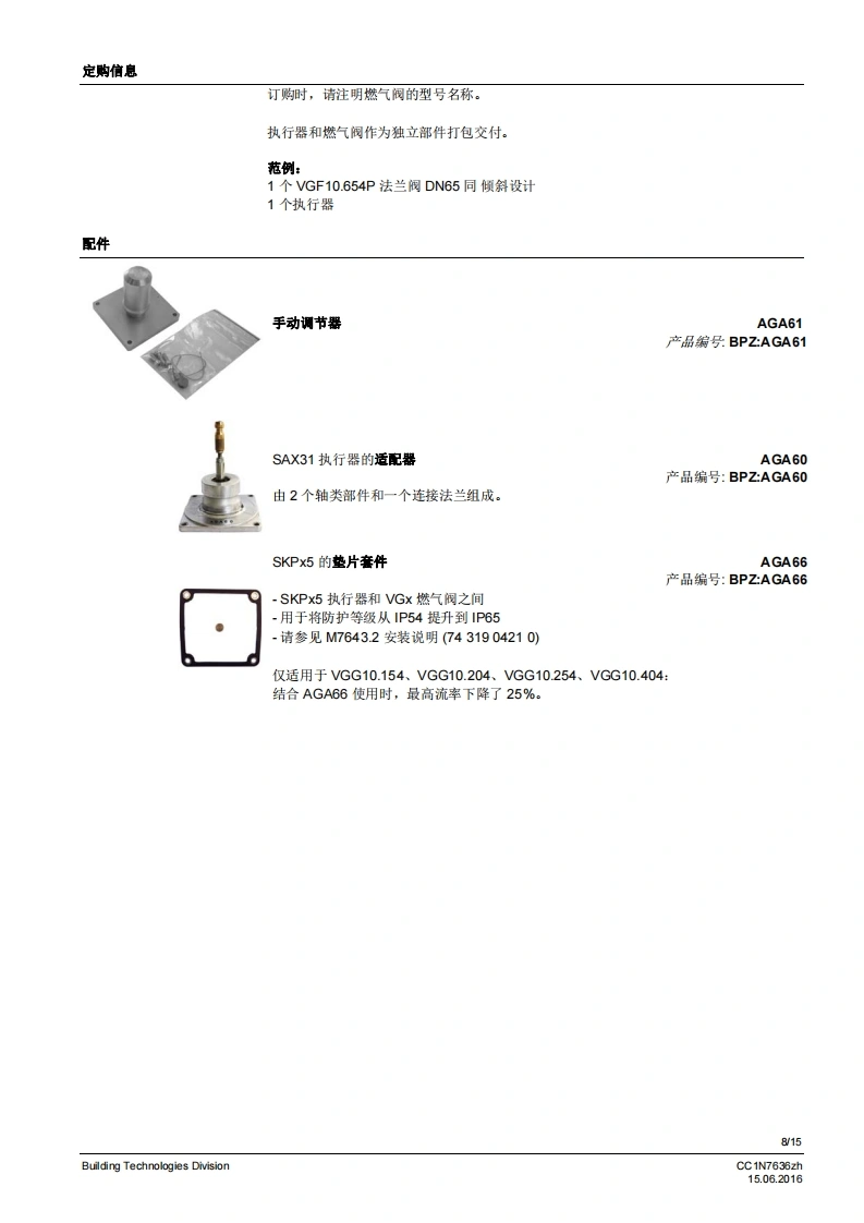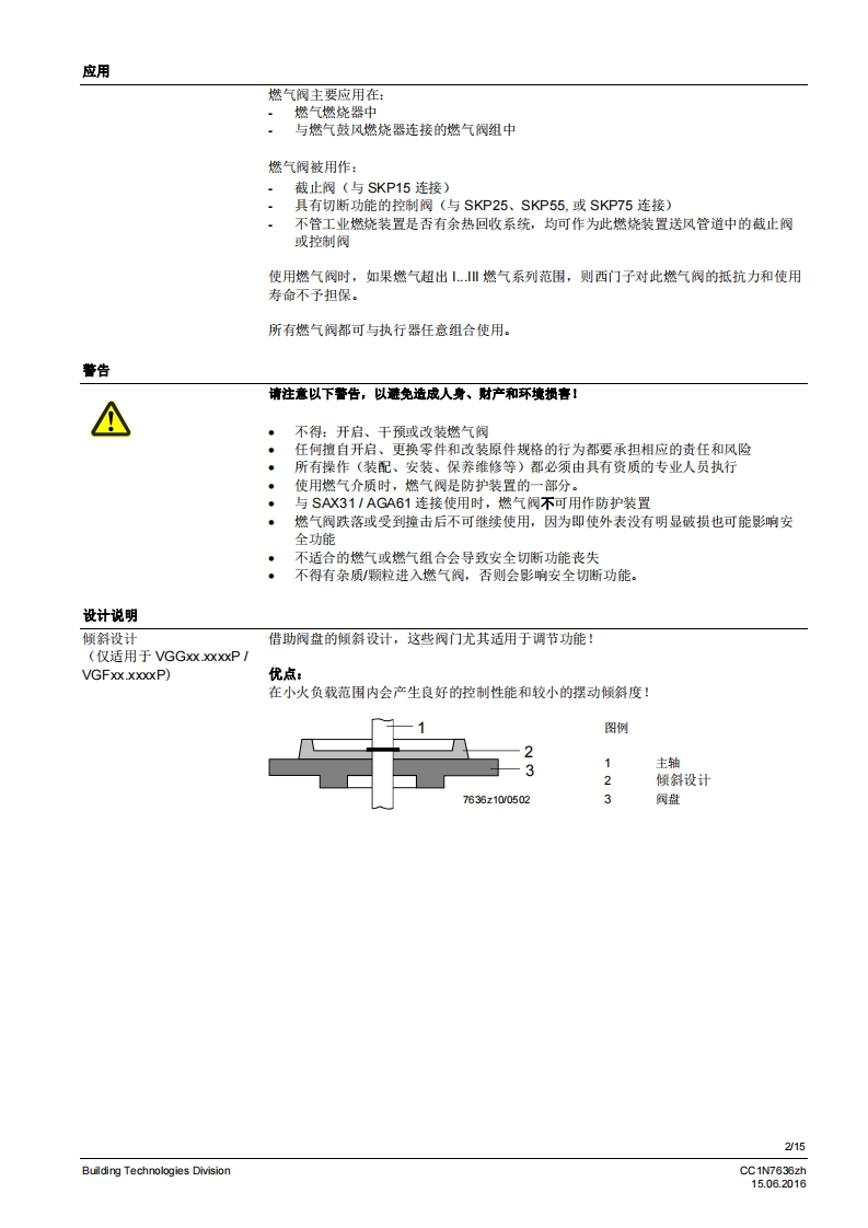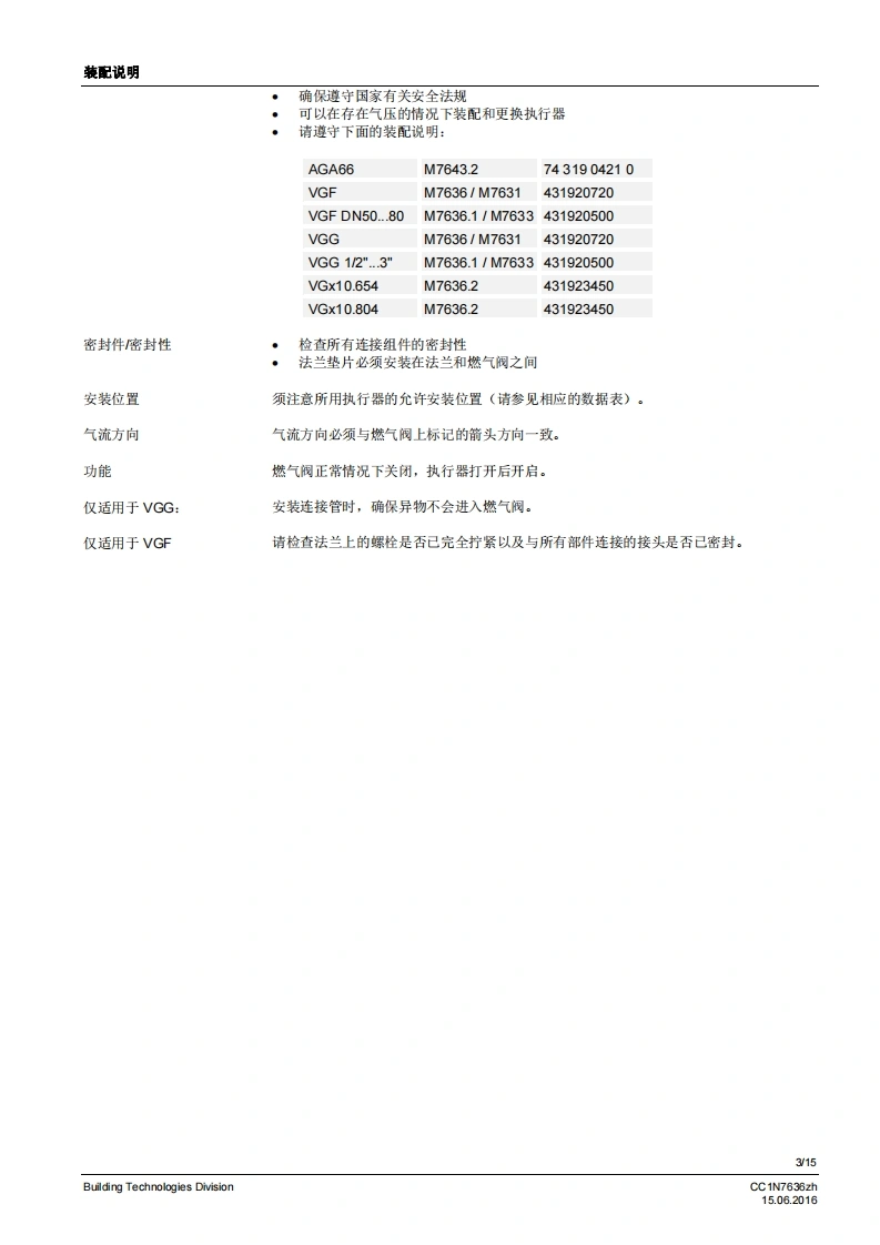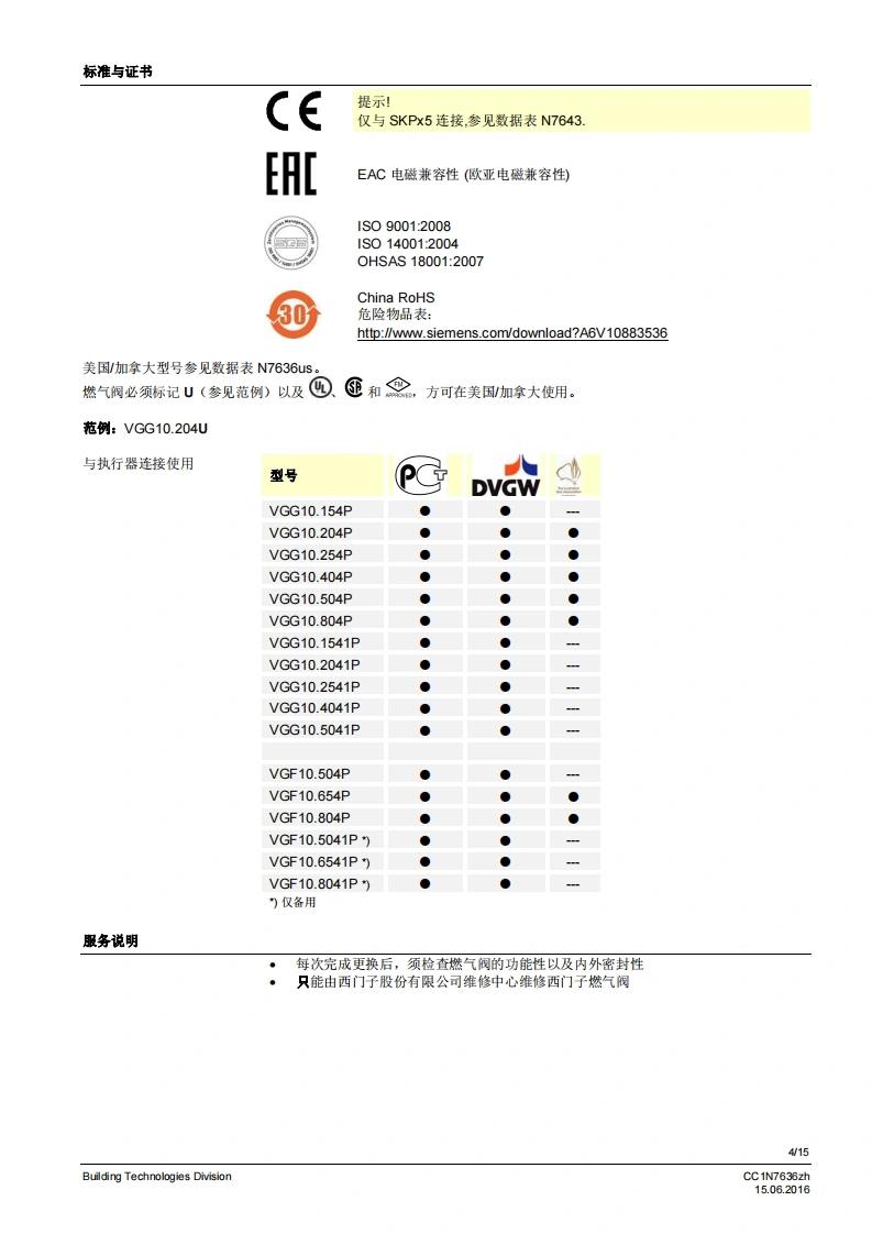 SIEMENS636VGG...VGF...燃气阀VGG...VGF...等级A的单阀用于安装在燃气阀组中安全截止阀符合EN161,可与执行器连接适用于L川的气体与执行器连接的燃气阀慢开快关常闭2通阀·为“.DN80通过执行器SKPx5操作作为与执行器SAX31和AGA60连接的控制机构,而不是作为安全载止阀作为与AGA61连接的控制机构,而不是作为安全戴止阀执行器的附加数据表请参见规格VGx以及本数据表专供在产品中使用VGx的原始设备制造商(OEM)使用ICC1N7636zhBuilding Technologies Division15.06.2016