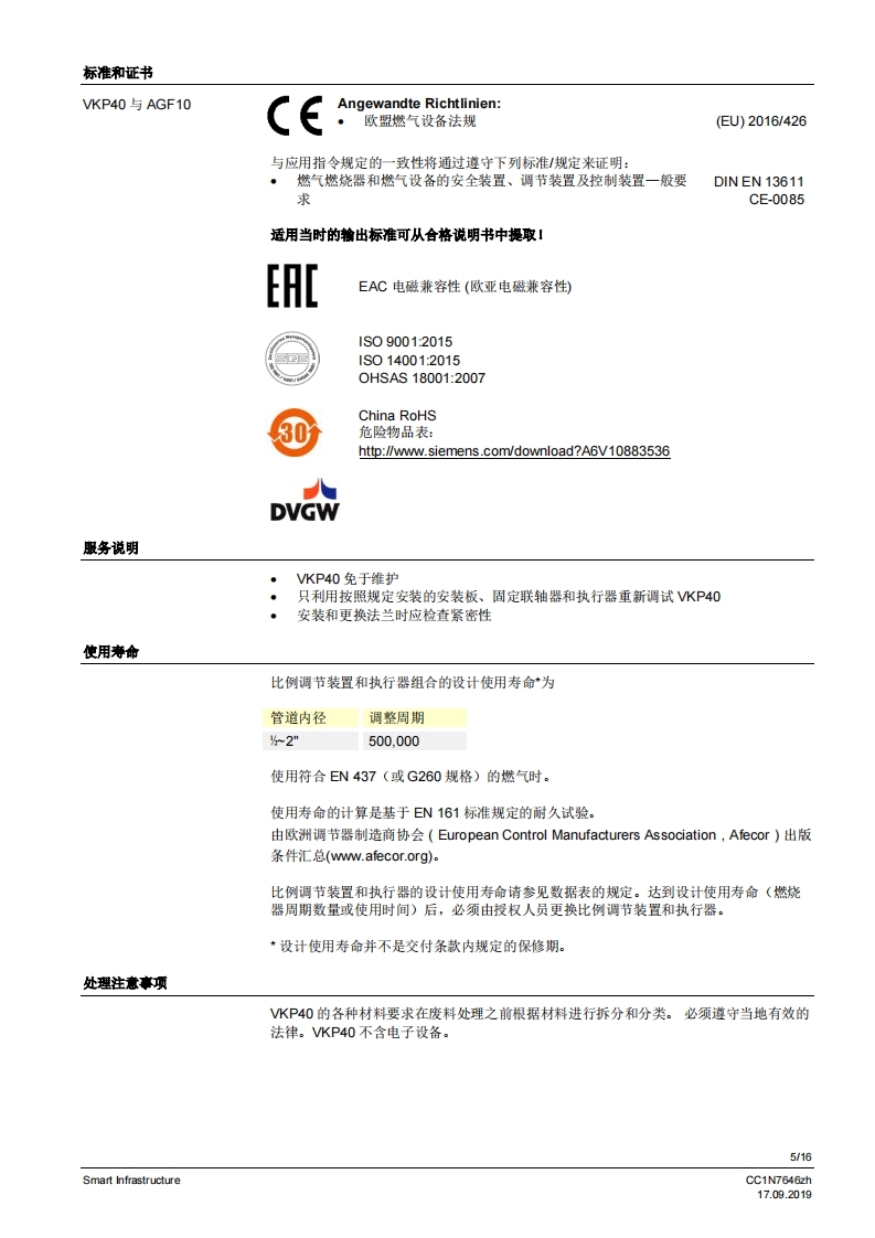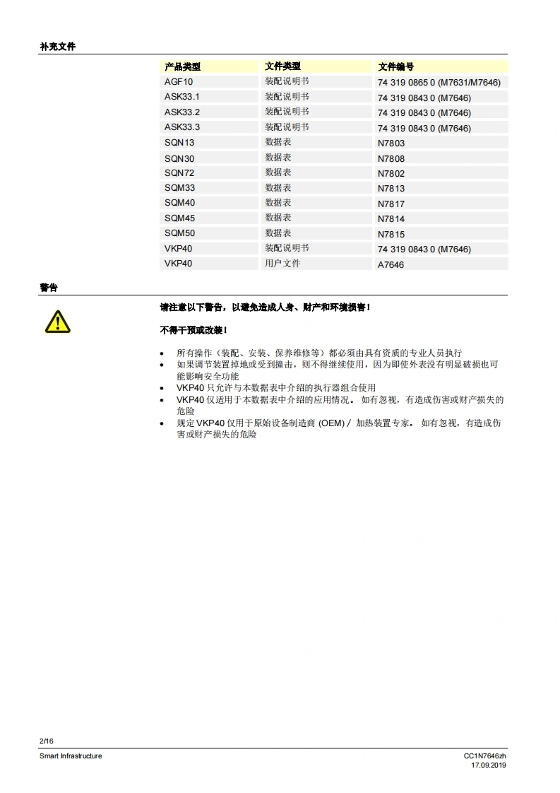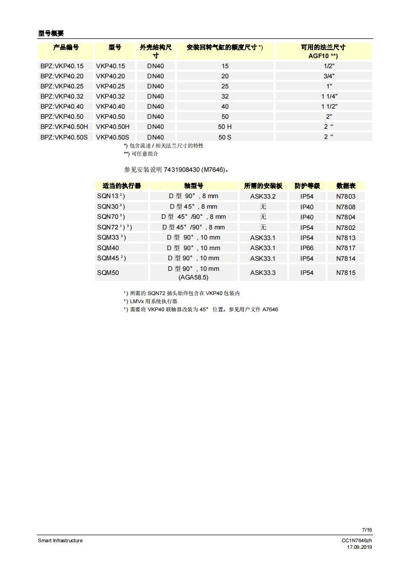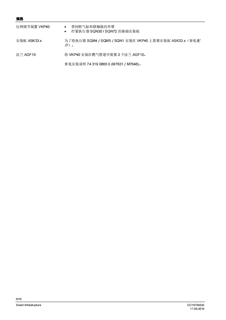 SIEMENS7646比例调节装置VKP40...比例调节装量安装在燃气阀组内的佩纹法兰之间。较大的调节范围法兰连接范围公…2”旋转角度90·适用于1…川系列燃气以及空气与执行器SQN13、SQN30、SQN72、SQM33、SQM4或SQM5配套使用可安装在VGD2燃气组合阀上VKP40以及本数据表专供在其设备中集成使用VKP40的原始设备制造商(OEM)使用I应用在燃烧装置中用作更高要求的燃气体积流量或空气体积流量调节装置,例如:通过旋转角度0.90°成比例增加体积流量起始量低/最少量较大的调节范围>1:25调节周期数量大5提示!补充文件参见配件。CC1N7646zhSmart Infrastructure17.092019