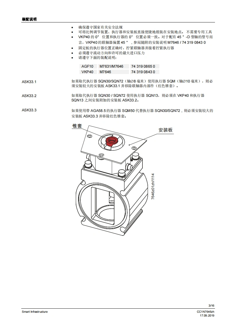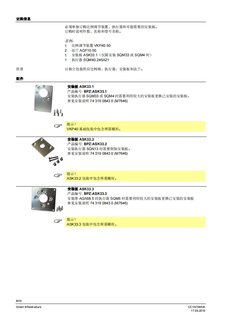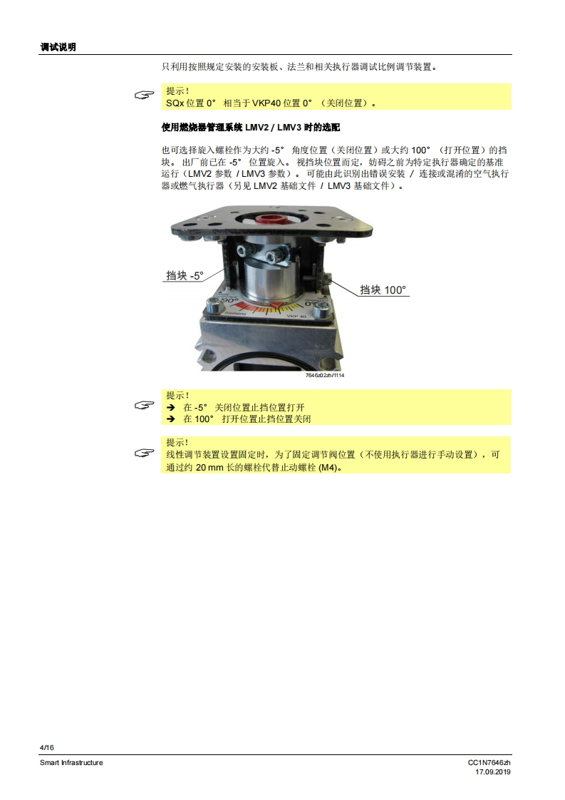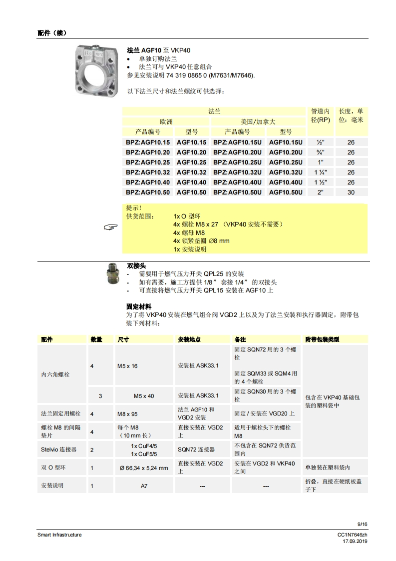 SIEMENS7646比例调节装置VKP40...比例调节装量安装在燃气阀组内的佩纹法兰之间。较大的调节范围法兰连接范围公…2”旋转角度90·适用于1…川系列燃气以及空气与执行器SQN13、SQN30、SQN72、SQM33、SQM4或SQM5配套使用可安装在VGD2燃气组合阀上VKP40以及本数据表专供在其设备中集成使用VKP40的原始设备制造商(OEM)使用I应用在燃烧装置中用作更高要求的燃气体积流量或空气体积流量调节装置,例如:通过旋转角度0.90°成比例增加体积流量起始量低/最少量较大的调节范围>1:25调节周期数量大5提示!补充文件参见配件。CC1N7646zhSmart Infrastructure17.092019