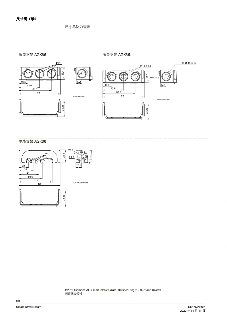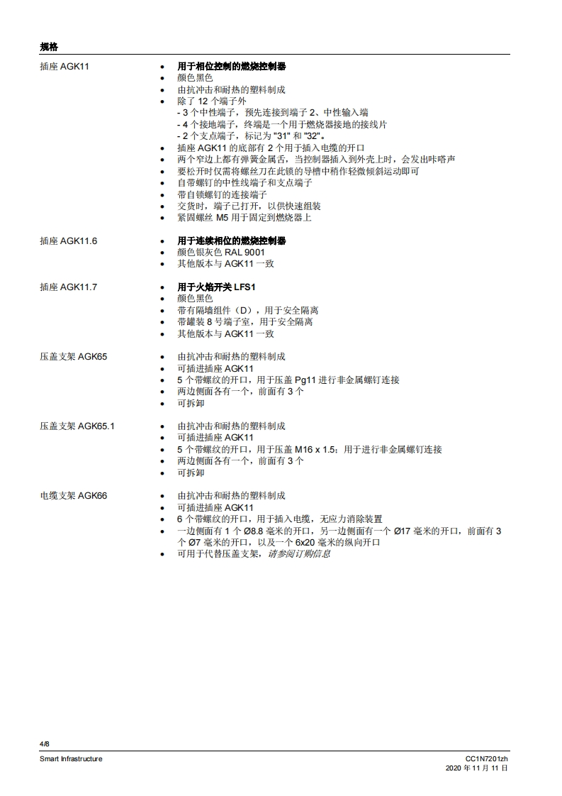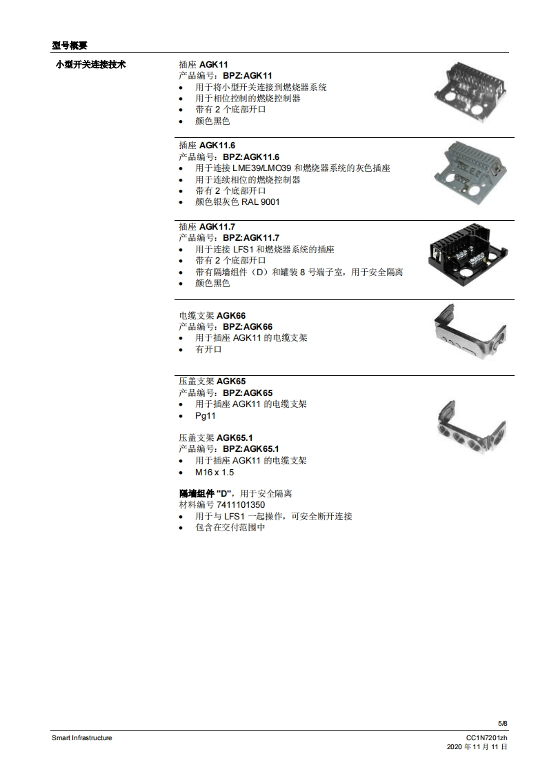 SIEMENS7201带压盖支架AGK65的插座AGK11带电缆支架AGK63的插座AGK11小型开关连接技术AGK11...AGK65...AGK66用于将小型开关连接到燃烧器系统的配件。AGK11、AGK65、AGK66以及本数据表专供在其产品中或者产品上使用AGK11、AGK65、AGK66的原始设备制造商(OEM)使用。应用AGK11、AGK65和AGK66与下列小型开关和火焰开关一起使用。·LFS1·LGA*LGB·LOA·LME·MO对于插座AGK11,可根据需要使用压盖支架AGK65或电缆支架AGK66。CC1N7201zhSmart Infrastructure2020年11月11日
