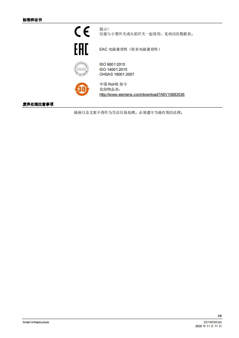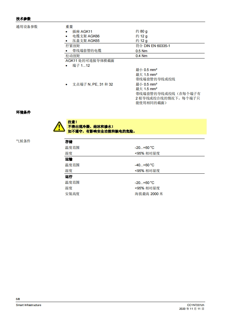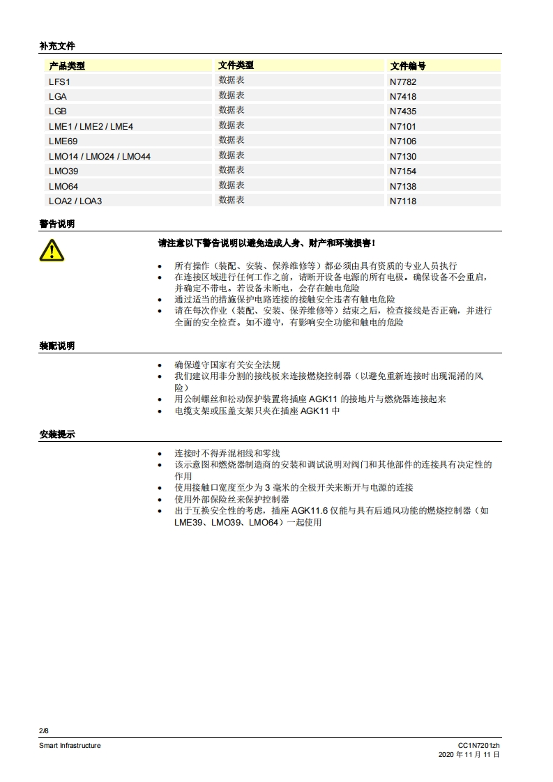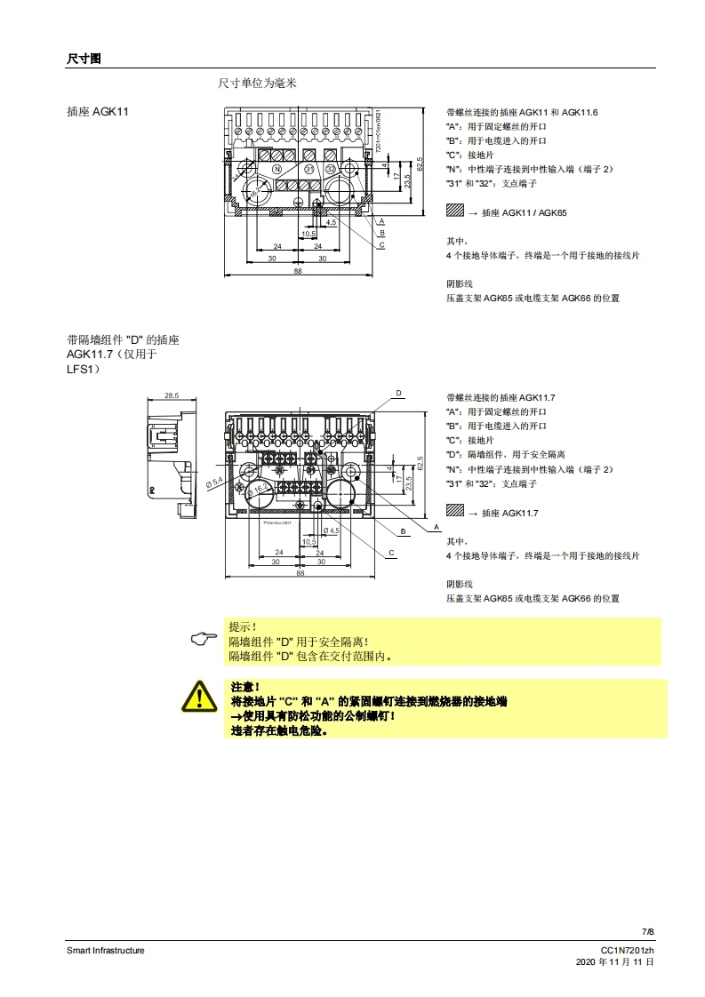SIEMENS7201带压盖支架AGK65的插座AGK11带电缆支架AGK63的插座AGK11小型开关连接技术AGK11...AGK65...AGK66用于将小型开关连接到燃烧器系统的配件。AGK11、AGK65、AGK66以及本数据表专供在其产品中或者产品上使用AGK11、AGK65、AGK66的原始设备制造商(OEM)使用。应用AGK11、AGK65和AGK66与下列小型开关和火焰开关一起使用。·LFS1·LGA*LGB·LOA·LME·MO对于插座AGK11,可根据需要使用压盖支架AGK65或电缆支架AGK66。CC1N7201zhSmart Infrastructure2020年11月11日